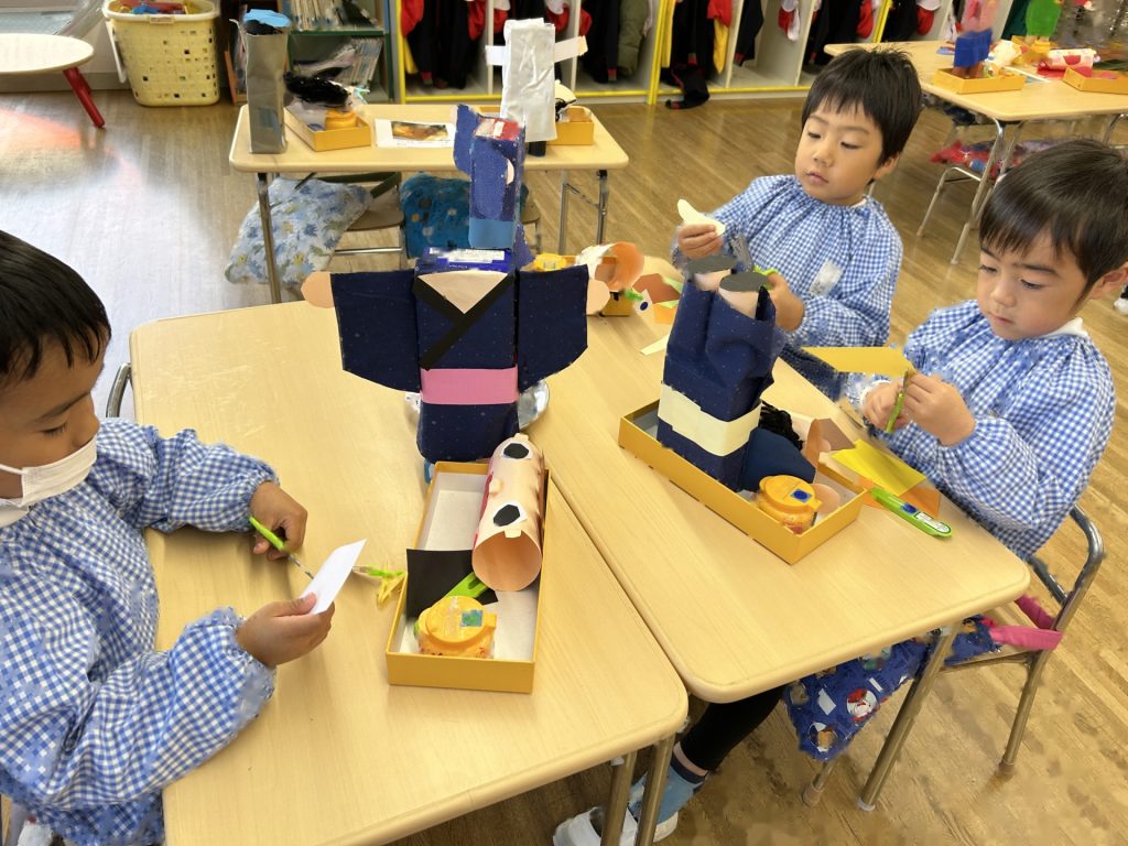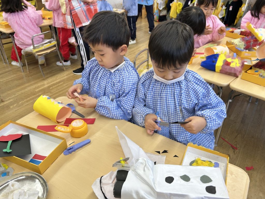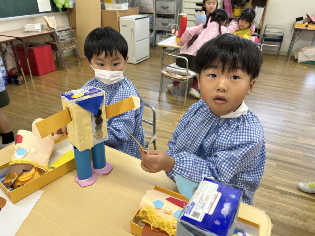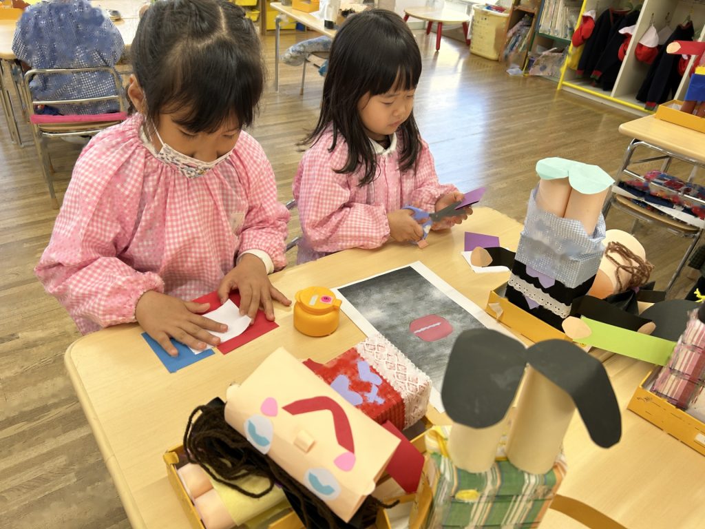 立体の顔に立体の体、いつもの紙製作の他に布やボタン、レースなども用意し、好きなように飾りつけしていきました。