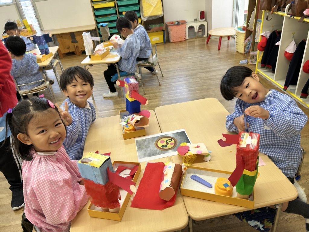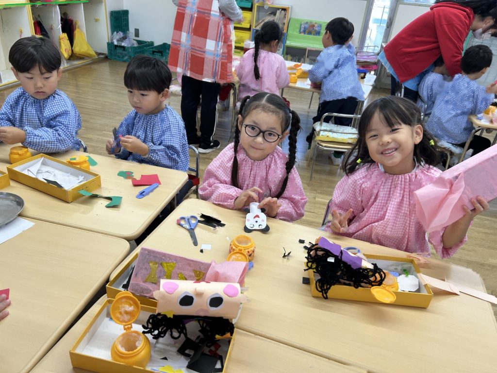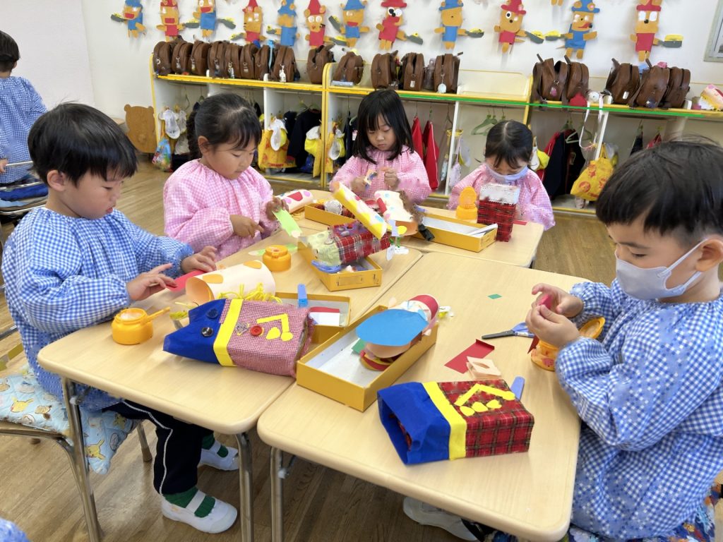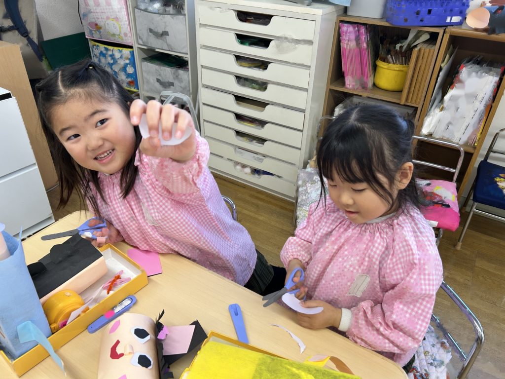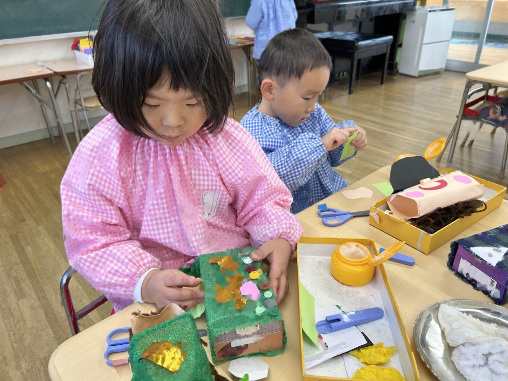 立体の顔に立体の体、いつもの紙製作の他に布やボタン、レースなども用意し、好きなように飾りつけしていきました。