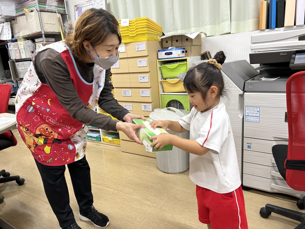また、5歳児クラスでは、言葉で伝える練習も兼ねて、毎日日直が当日の欠席の人数とその日の保育内容を職員室まで伝えに来てくれます。