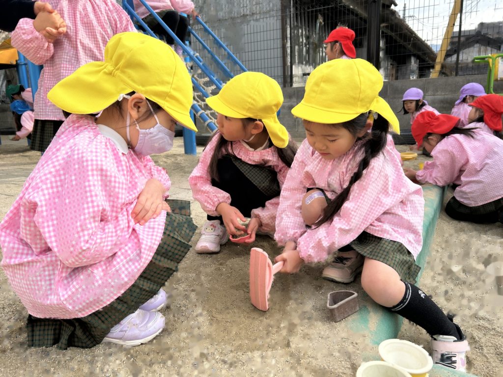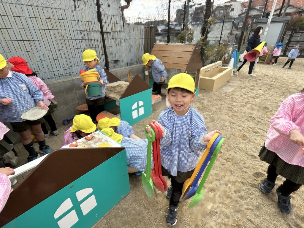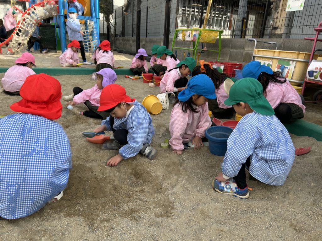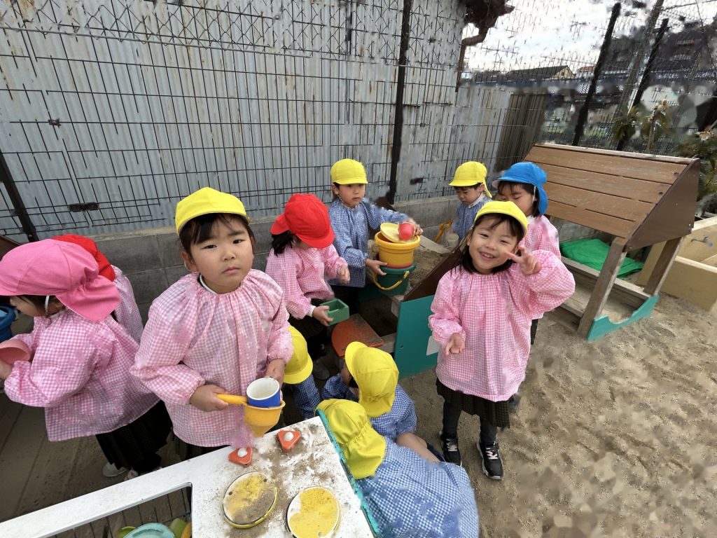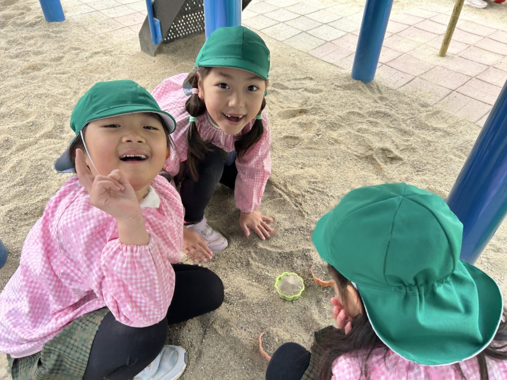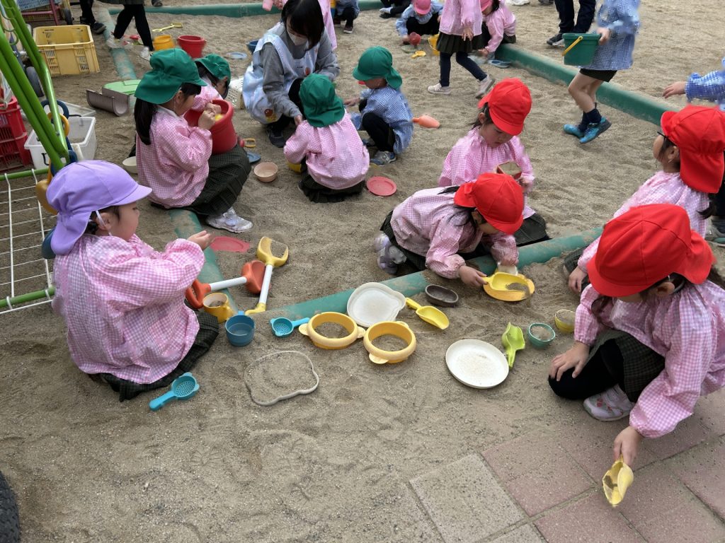1年中人気の遊びは砂場遊びです。おままごとをしたり、山を作ったり、サラサラの砂を作ったり…