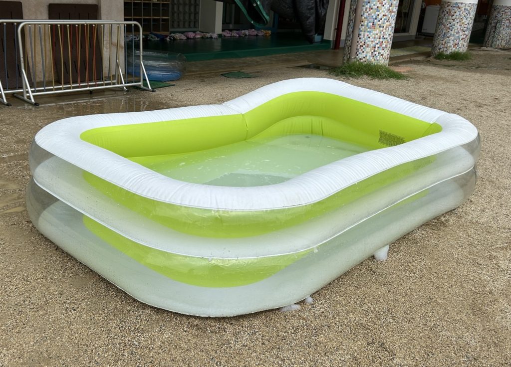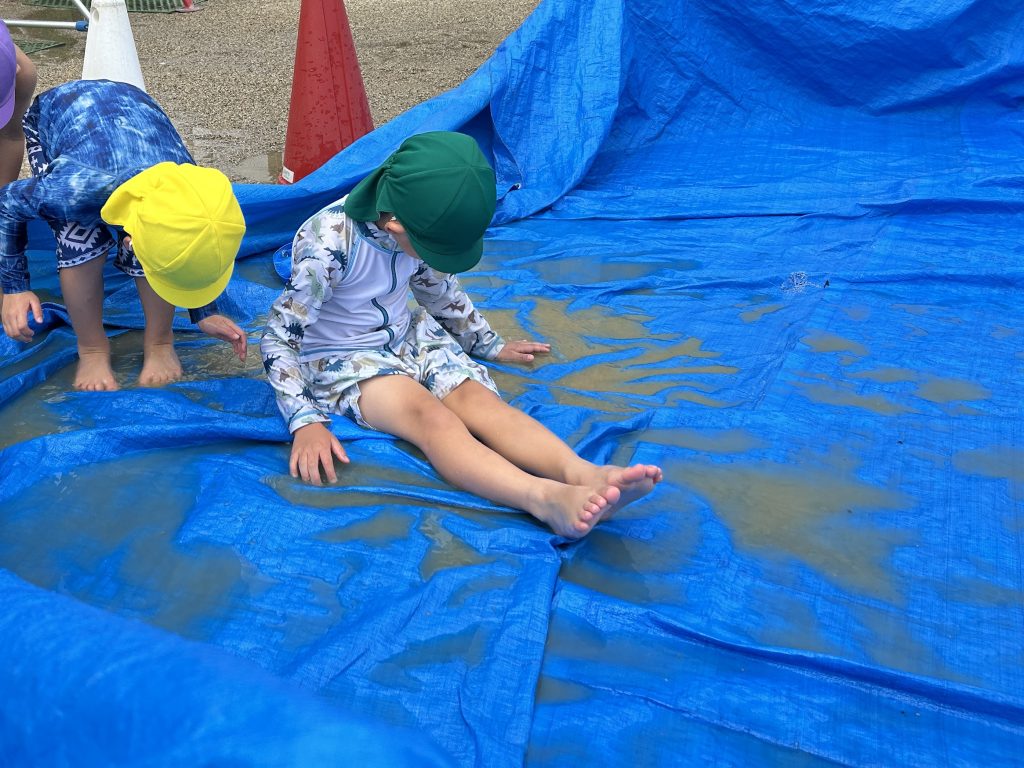 大きいサイズのブルーシートを用意し、鉄棒や三角コーン、タイヤなどで周囲を高くし、中に水をためシートプールを作りました。真ん中に入れたタイヤに水がたまり、そこに座ったり、シートの中で寝転んだり、楽しんでいました。