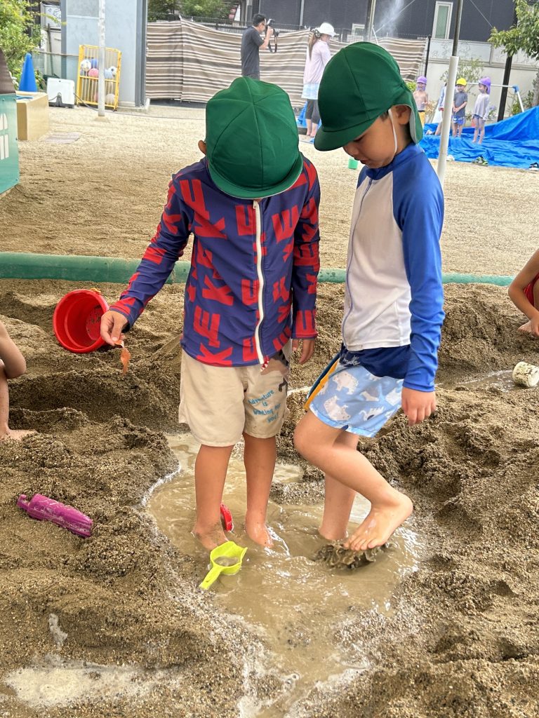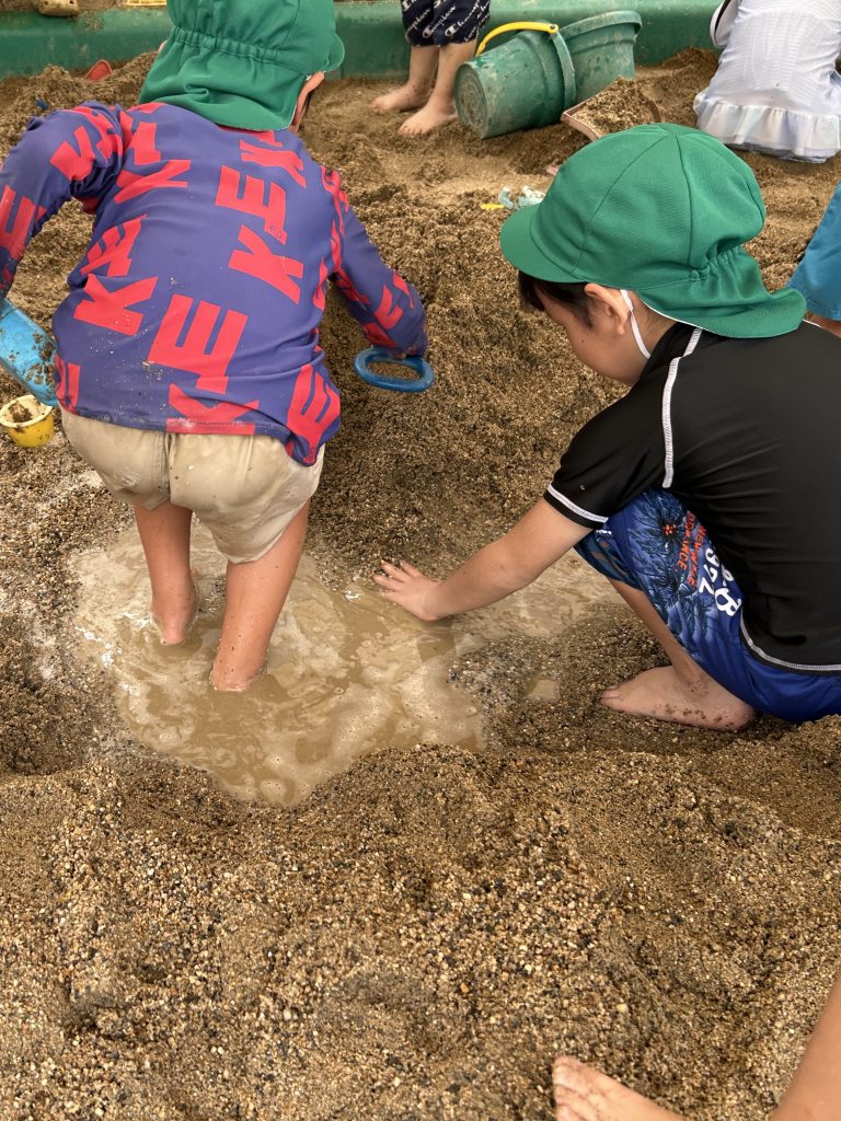砂場にホースで水を入れ泥んこ遊びを楽しみました。いつもはバケツで汲んで入れているのでなかなか水はたまらないのですが、今日は直接ホースから水が入り嬉しそうな子どもたちでした。泥んこを気にせず裸足で砂場に入り、スコップなどを使って川を作ったり、山に登ったり、普段できない遊びを楽しんでいました。