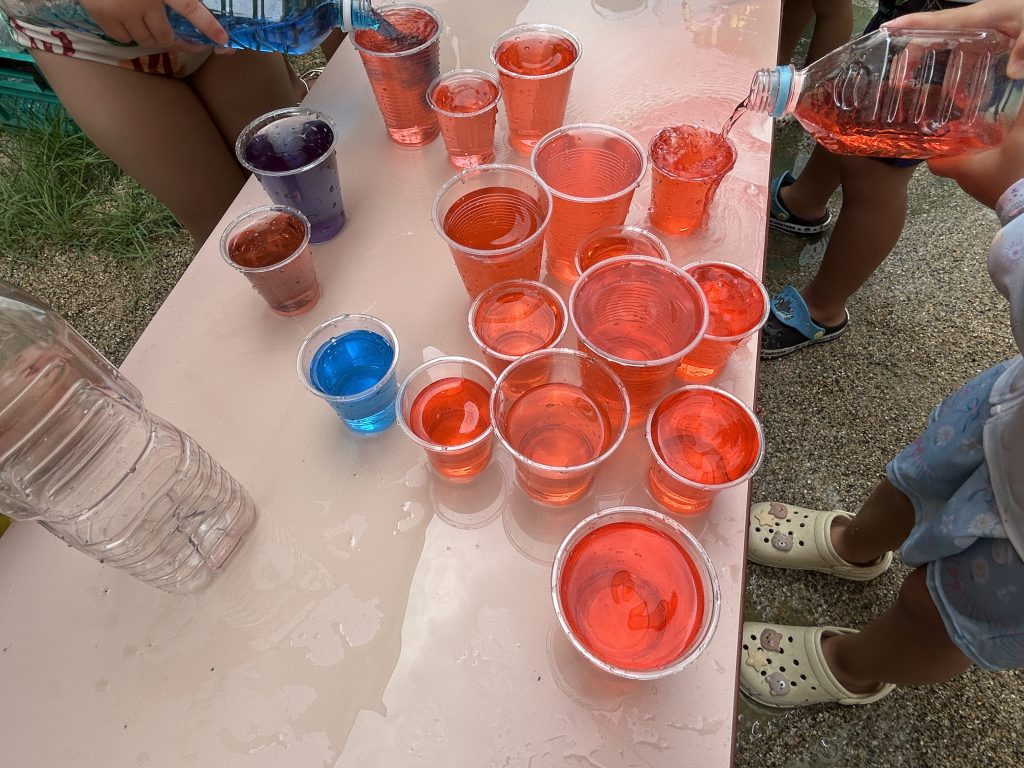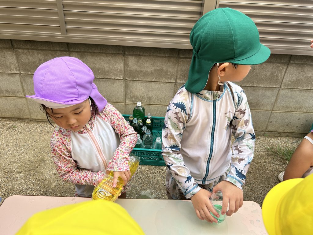こどもたちは初めは色水をペットボトルからプラカップに注いで楽しんでいましたが、混ぜると色が変わることに気付くと、色々な色を混ぜ、「オレンジジュースになった!」「ぶどうや!」など色が変わる面白さも楽しんでいました。みんな夢中になって遊んでいましたよ。