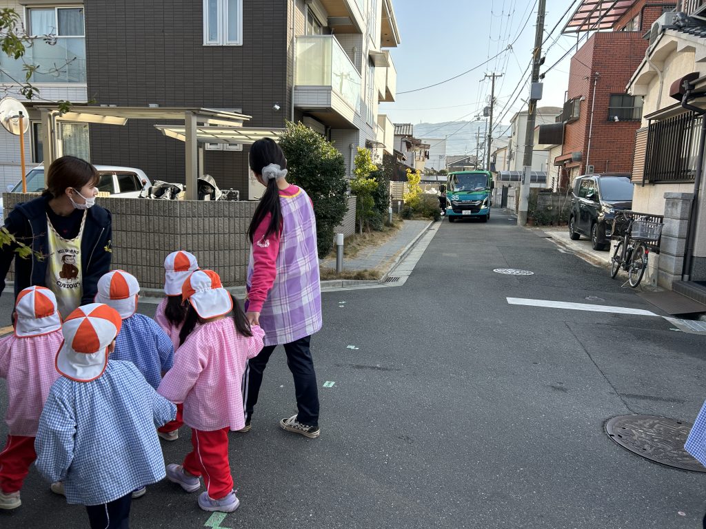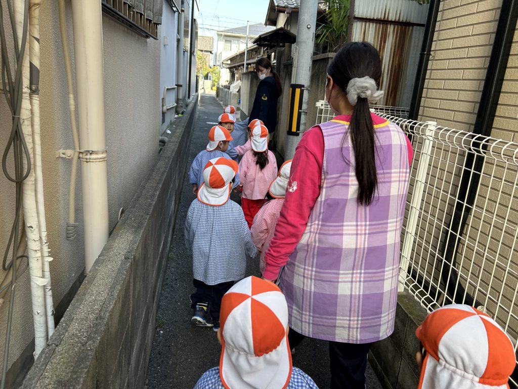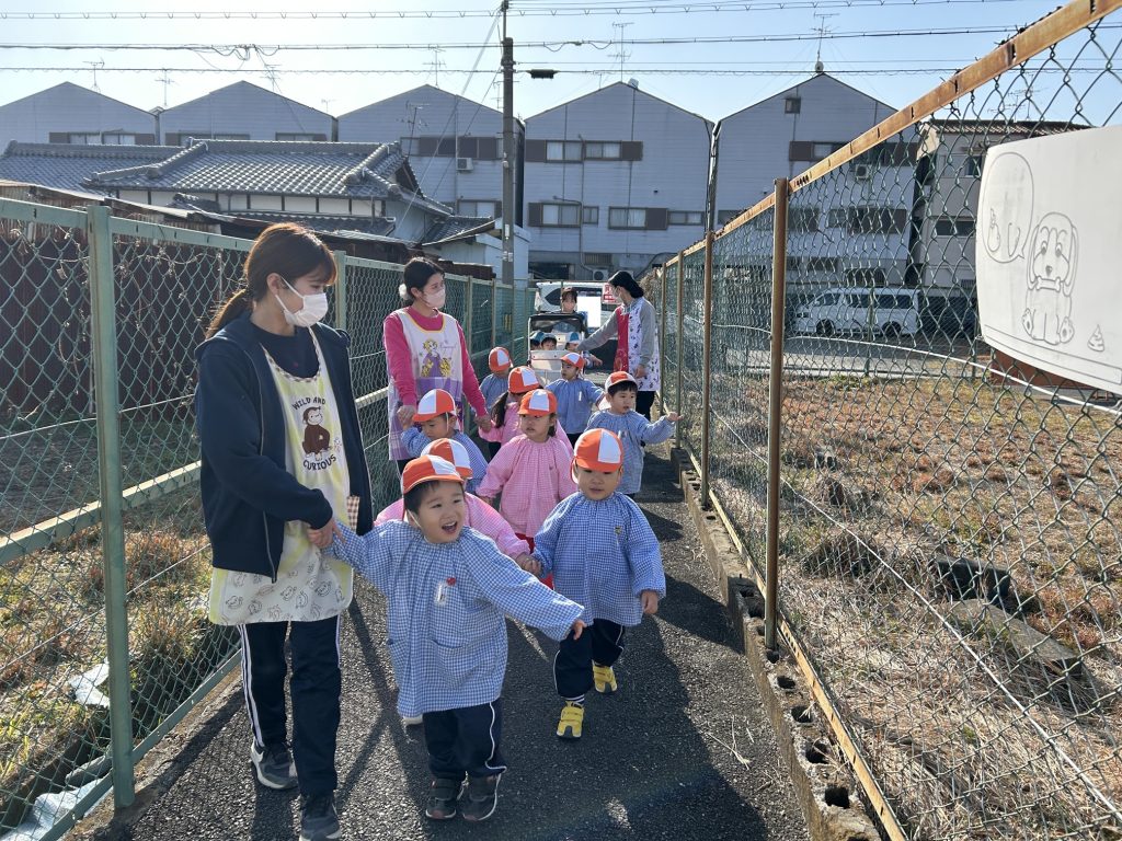 車が通る道や細い道などいろんな道を歩いて向かいました。前を歩いているおともだちと間隔があいたり、順番を抜かしそうになったり、まだまだしっかりとは歩けませんが最後までおしゃべりを楽しみながら歩いていました😊