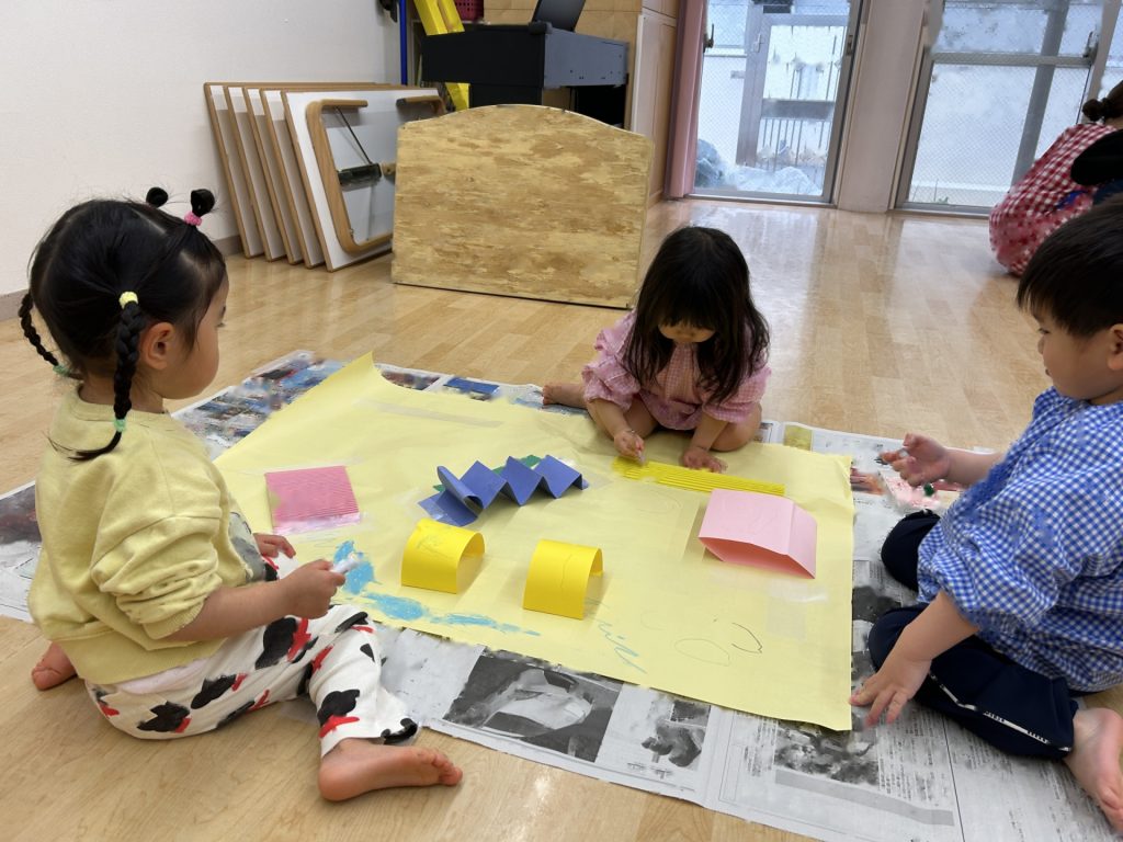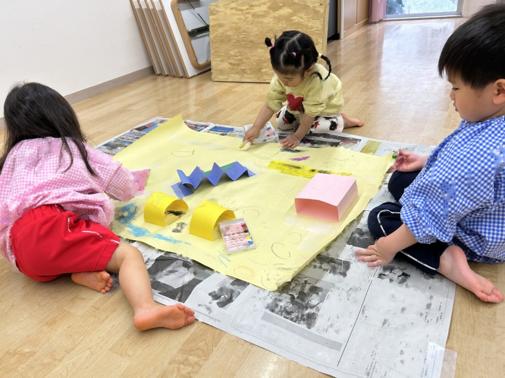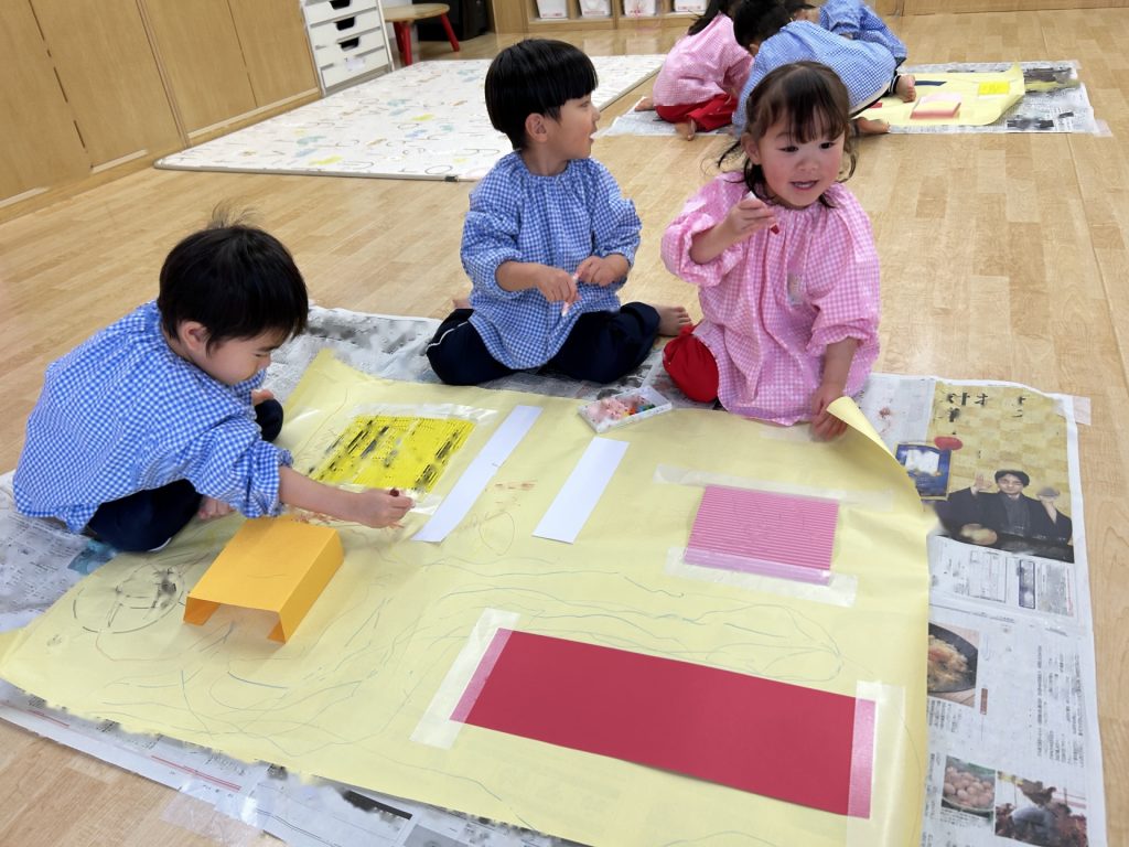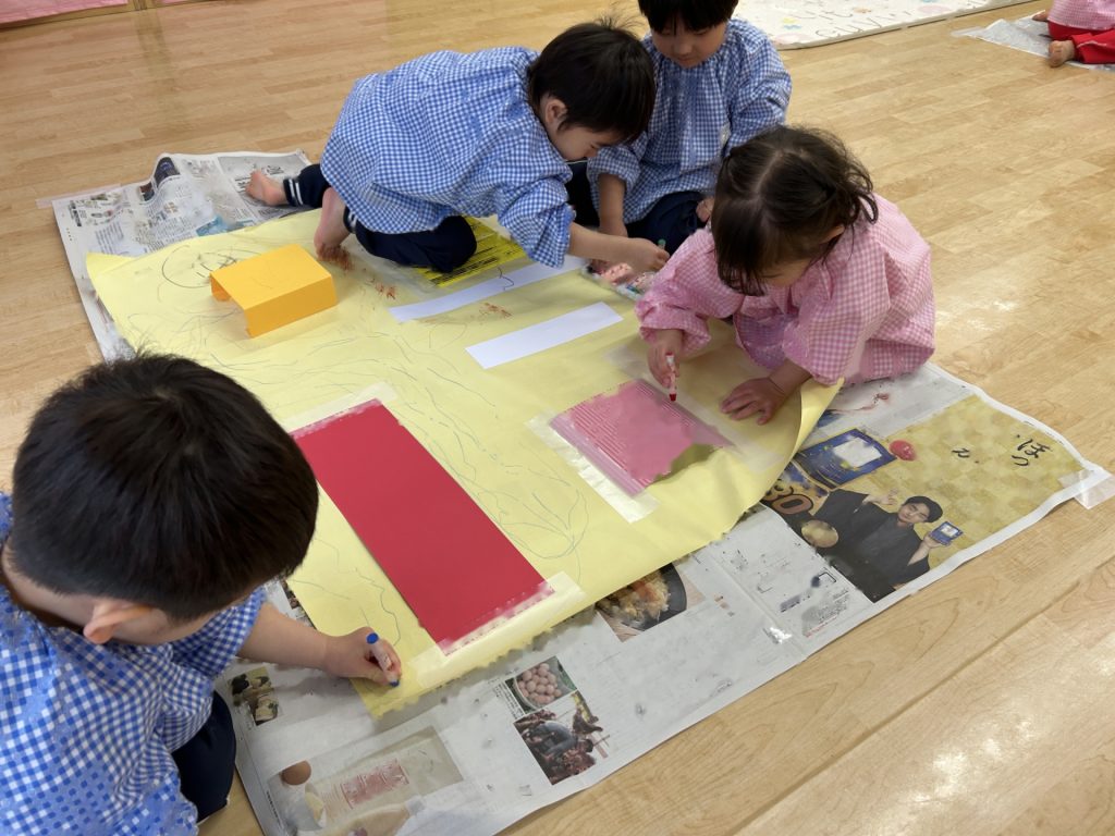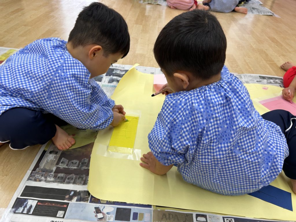 ゆりぐみ、たんぽぽぐみ合同で画用紙の仕掛けや片ダンボール、養生テープなどを貼った大きい模造紙にパステルで自由にお絵描きをしました。