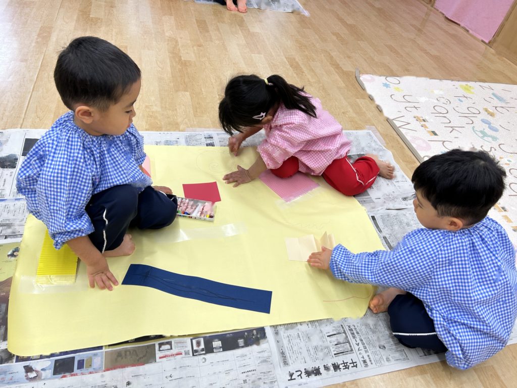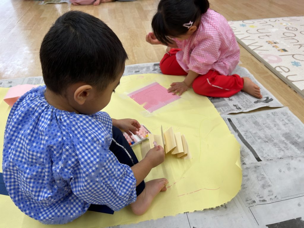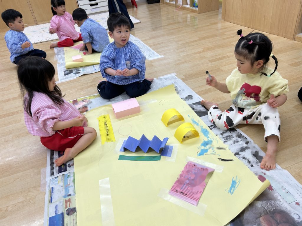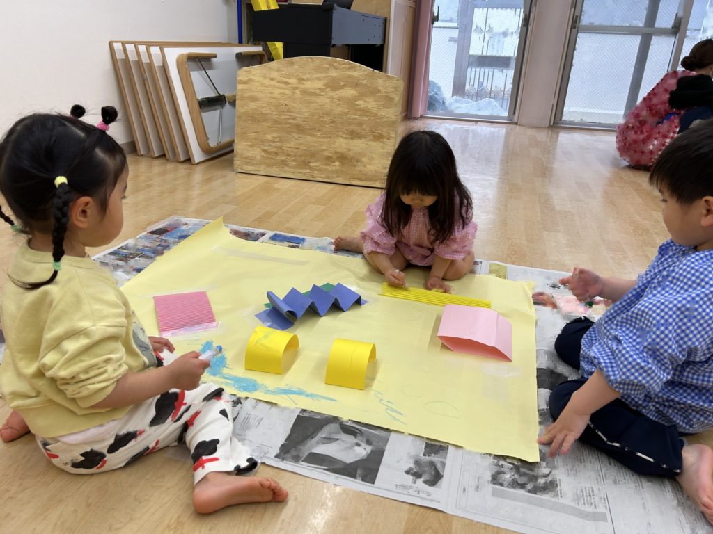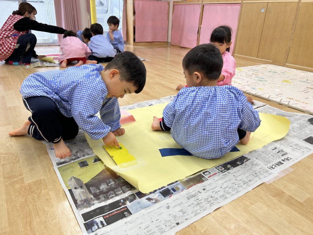 ゆりぐみ、たんぽぽぐみ合同で画用紙の仕掛けや片ダンボール、養生テープなどを貼った大きい模造紙にパステルで自由にお絵描きをしました。