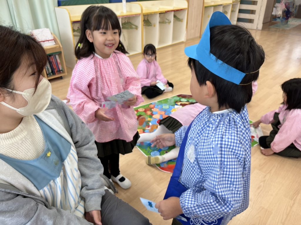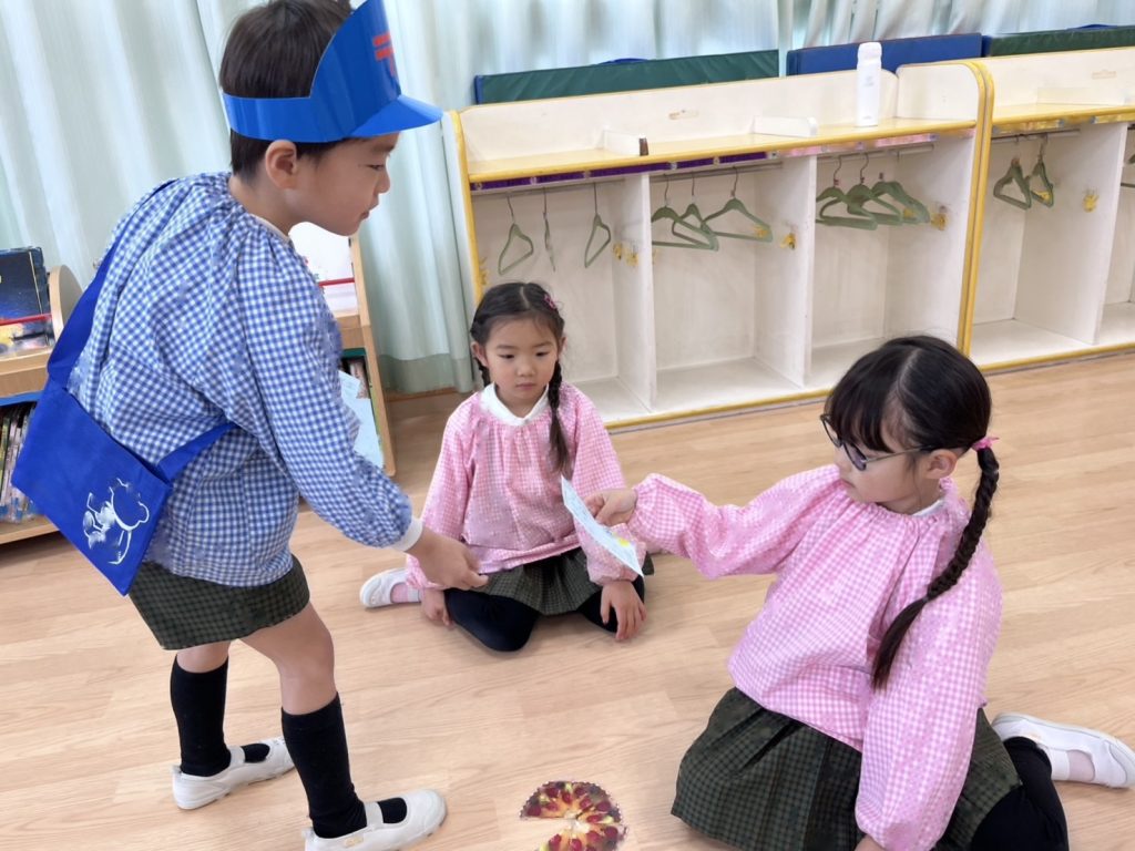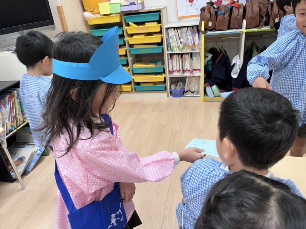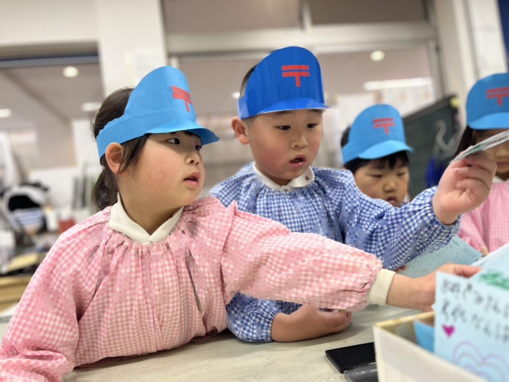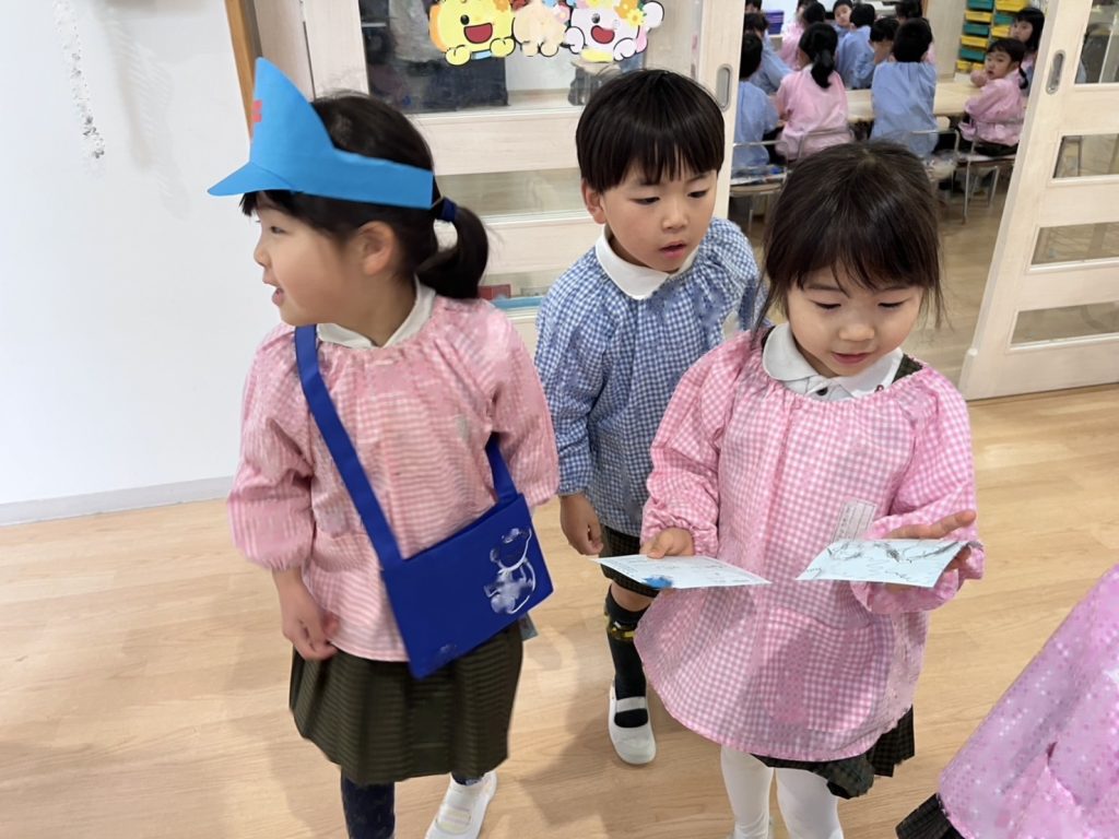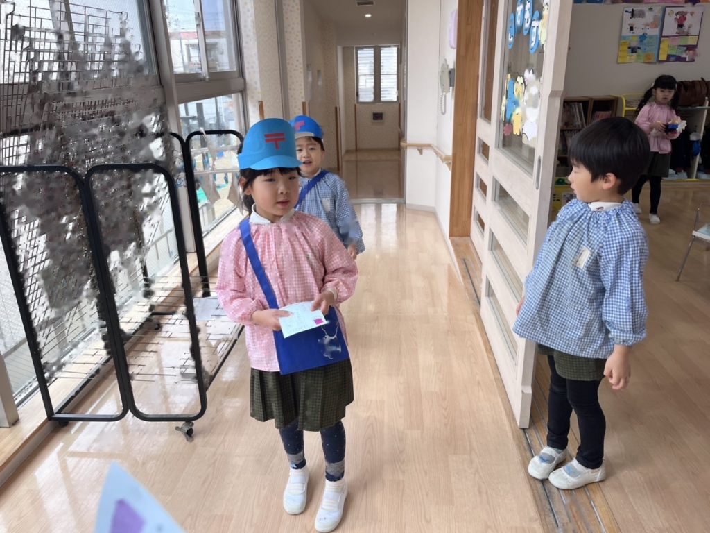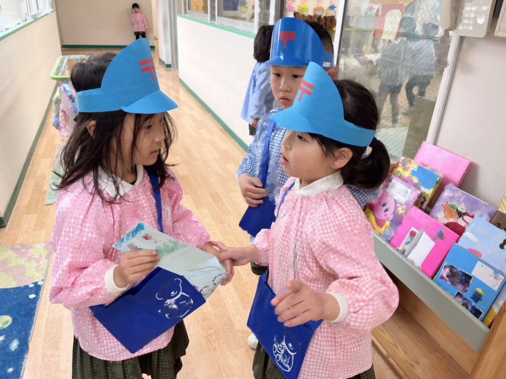 園庭は雨が降っていたので各お部屋まで手紙を配達にいきました。