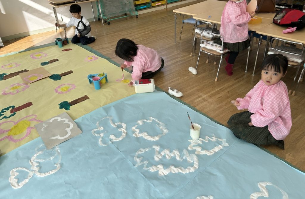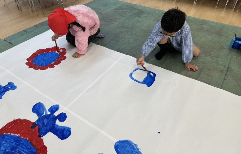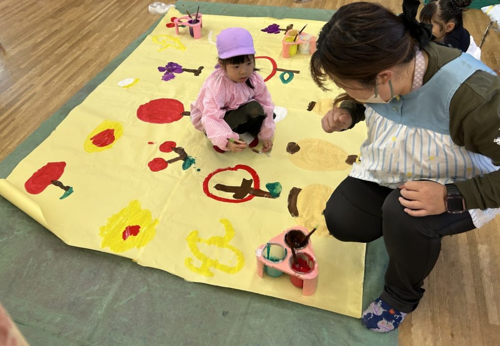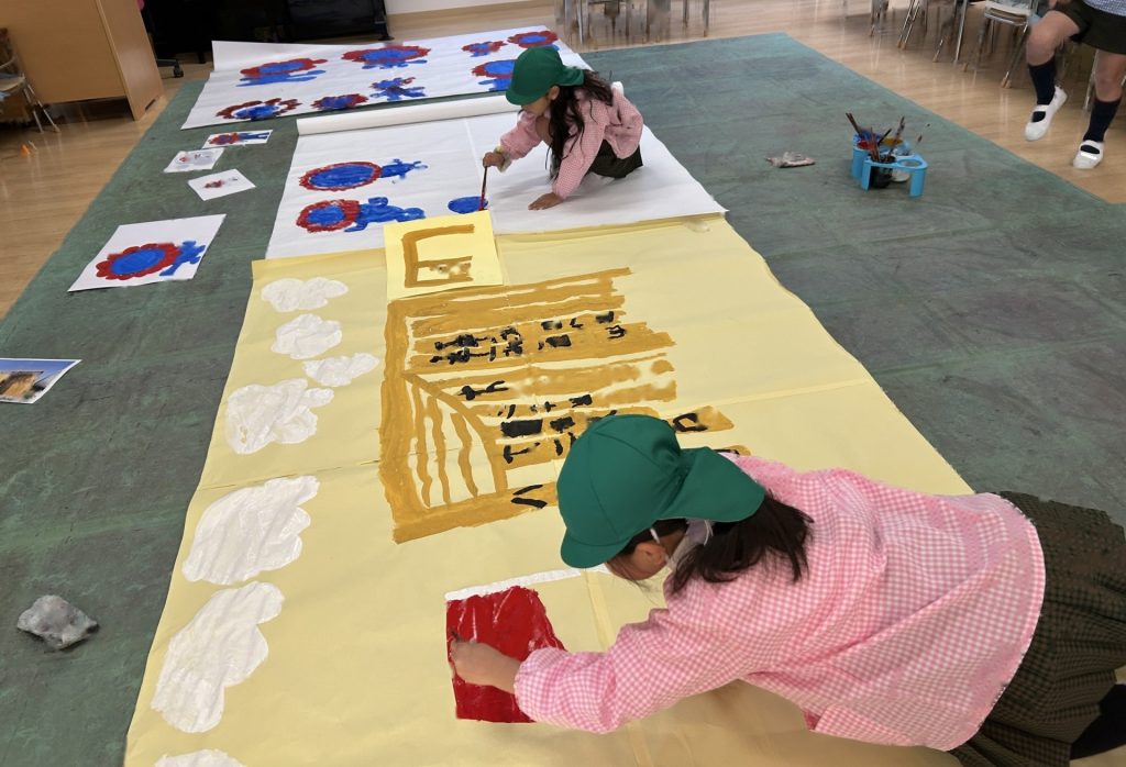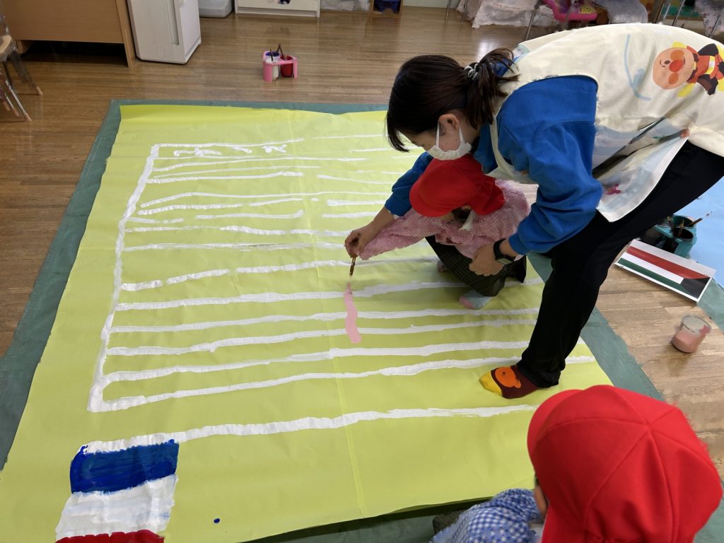 「はなようミニ万博」づくりに向けて今日は朝登園したおともだちからミニ万博の壁面を絵の具で描いていきました。