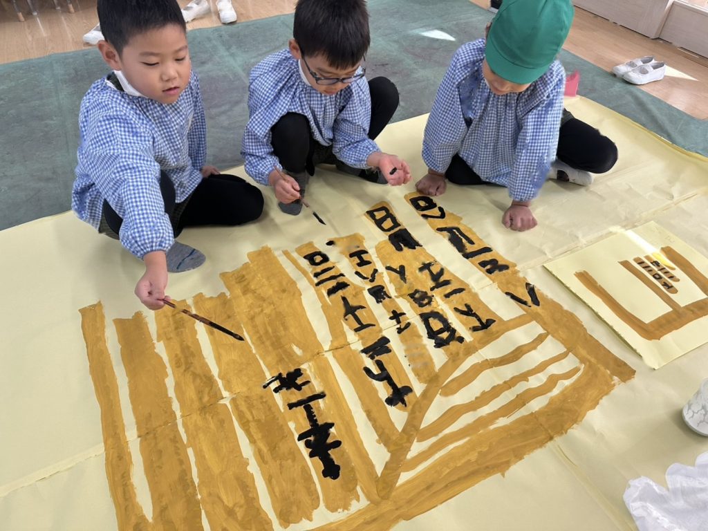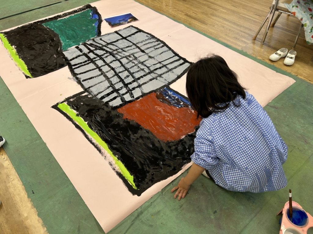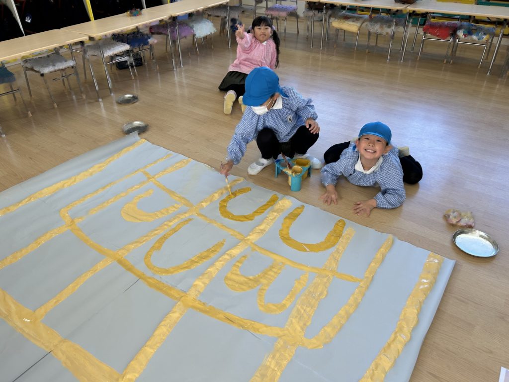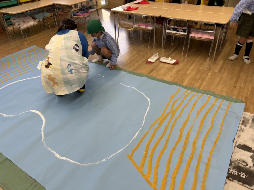 「はなようミニ万博」づくりに向けて今日は朝登園したおともだちからミニ万博の壁面を絵の具で描いていきました。