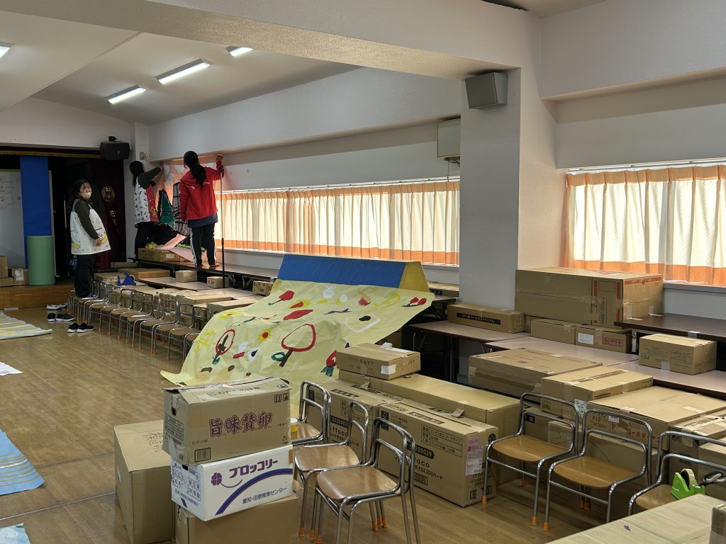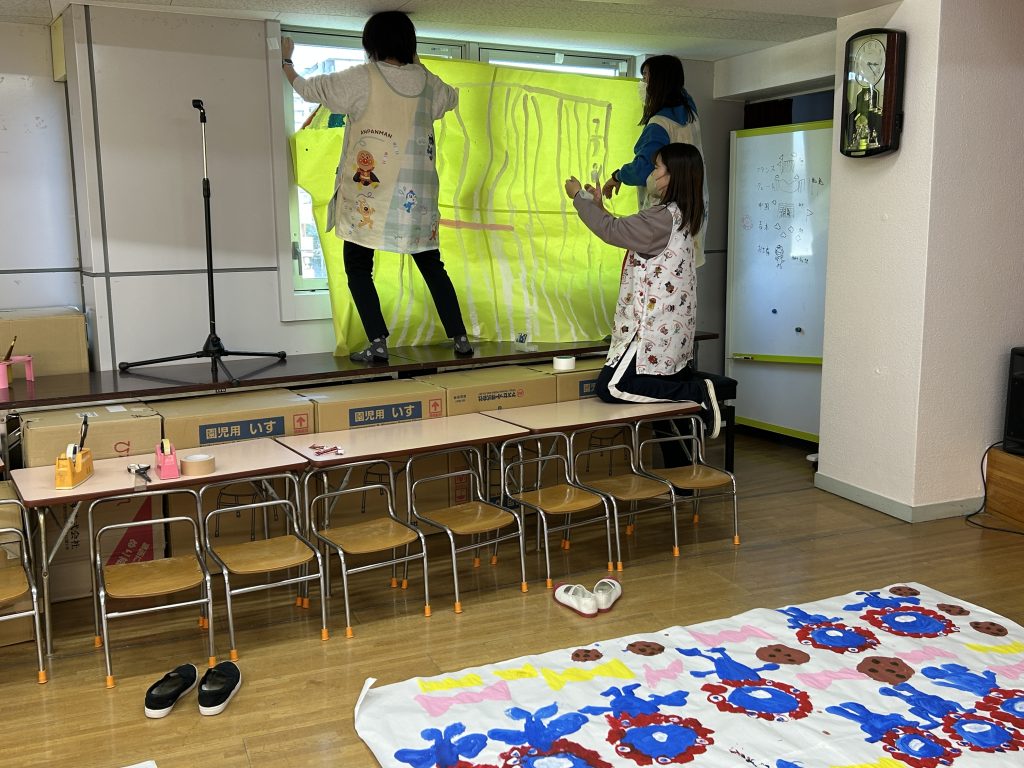 保育者による3階ホールの準備も進んでいます。今日描いた壁面を貼っていきました。