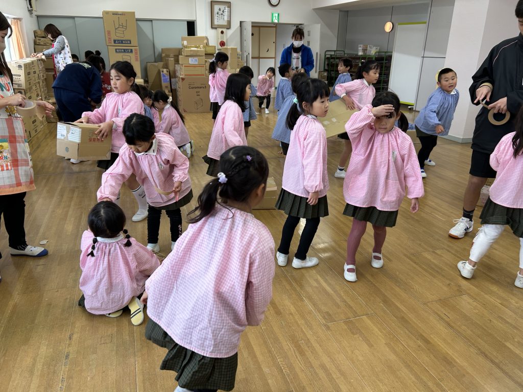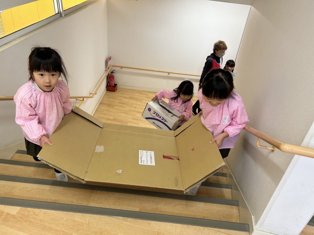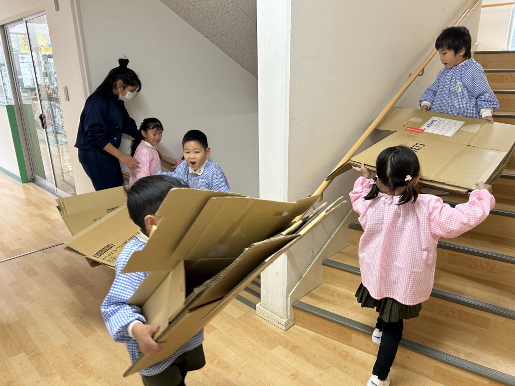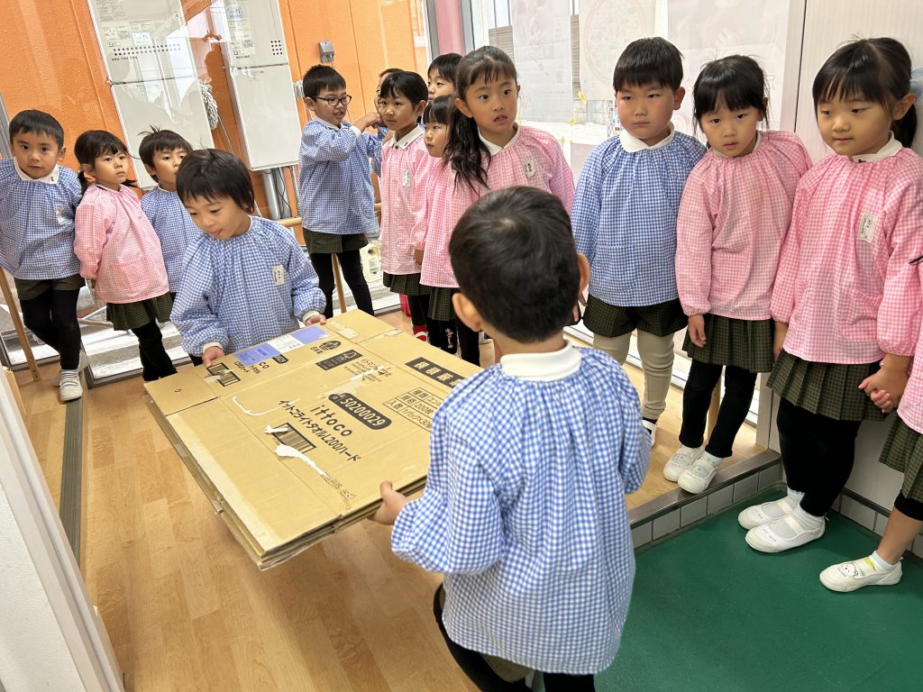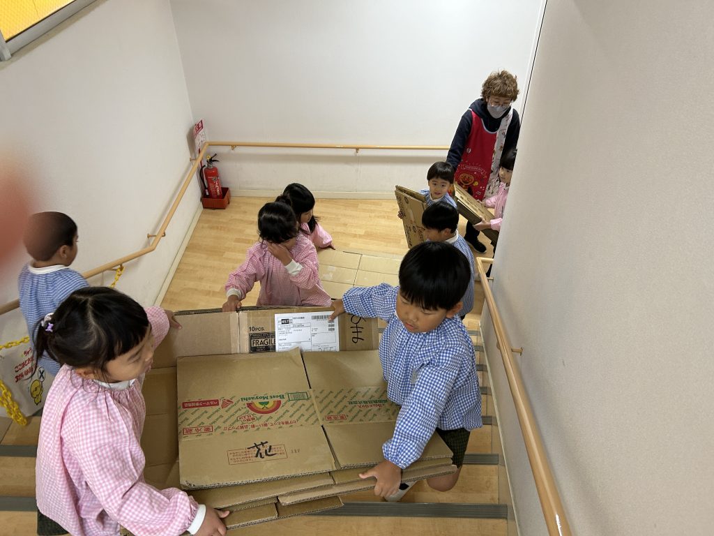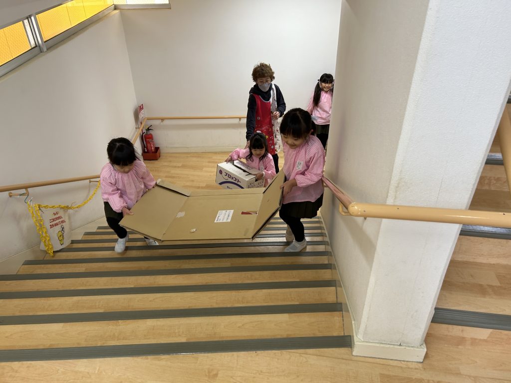 園で集めておいた段ボールを3階に運びました。子どもたちはとっても張り切って小さい段ボールから大きい段ボールまで運ぶお手伝いをしてくれました。運ぶときに「ちょーさじゃ」とお祭りの掛け声をしながら運んでいるおともだちもいましたよ😊