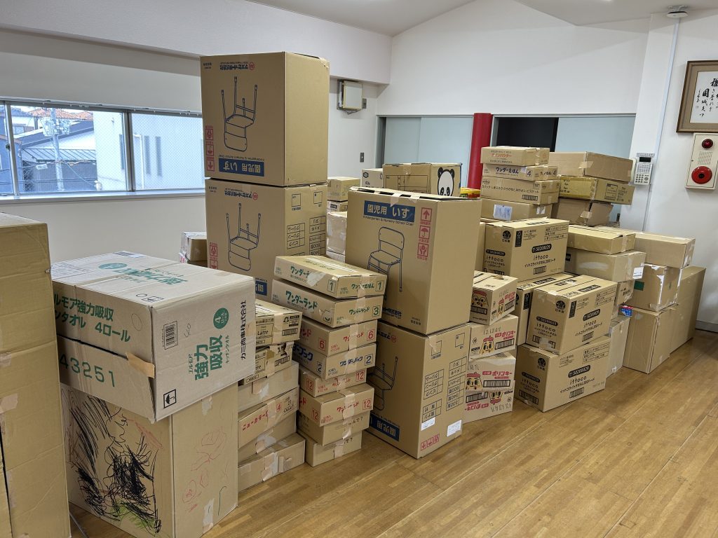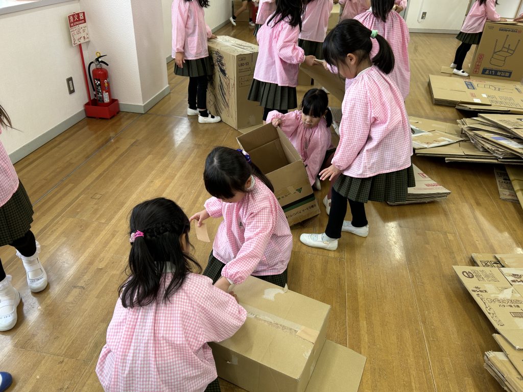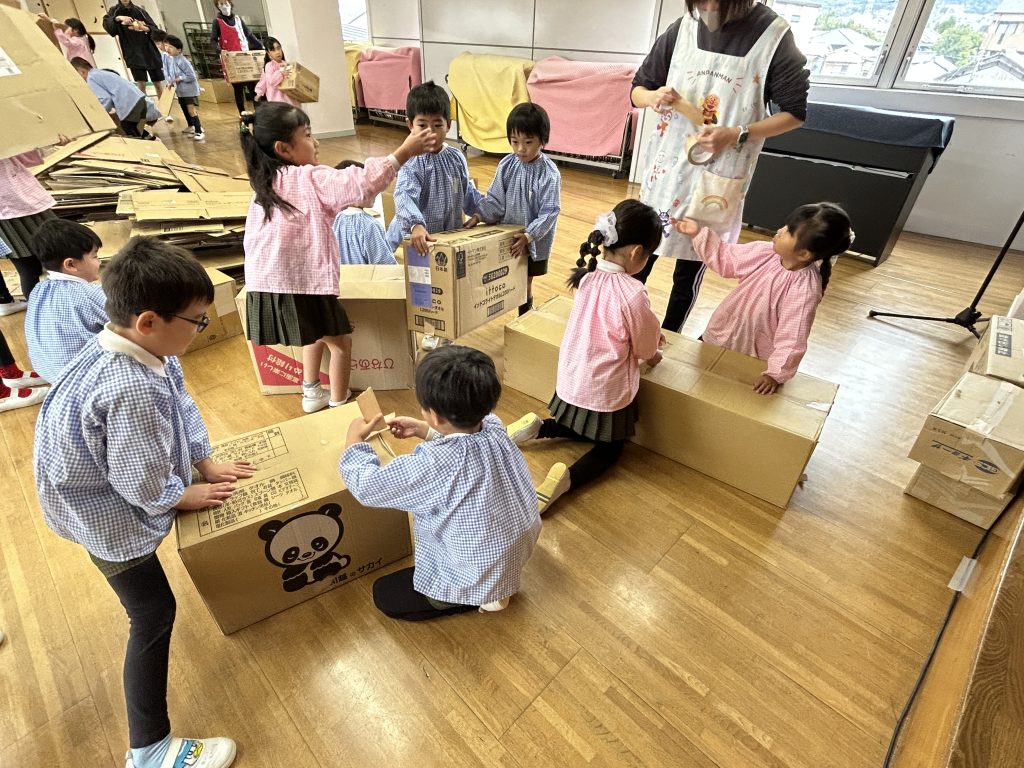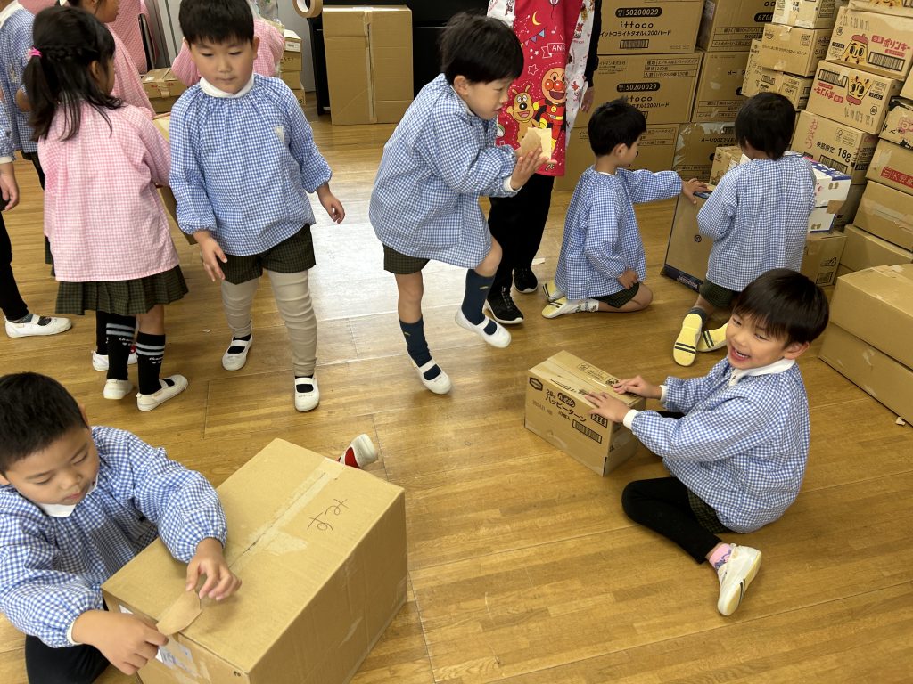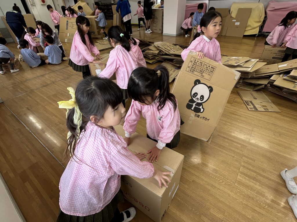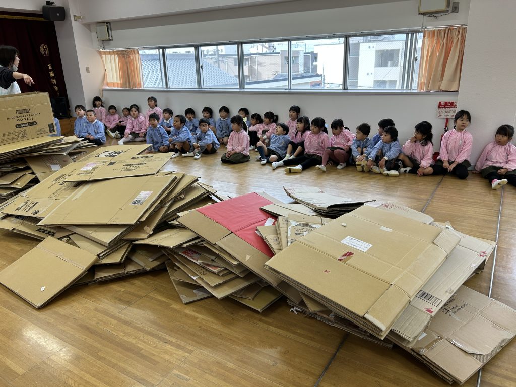 園で集めておいた段ボールを3階に運びました。子どもたちはとっても張り切って小さい段ボールから大きい段ボールまで運ぶお手伝いをしてくれました。運ぶときに「ちょーさじゃ」とお祭りの掛け声をしながら運んでいるおともだちもいましたよ😊