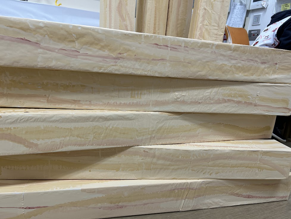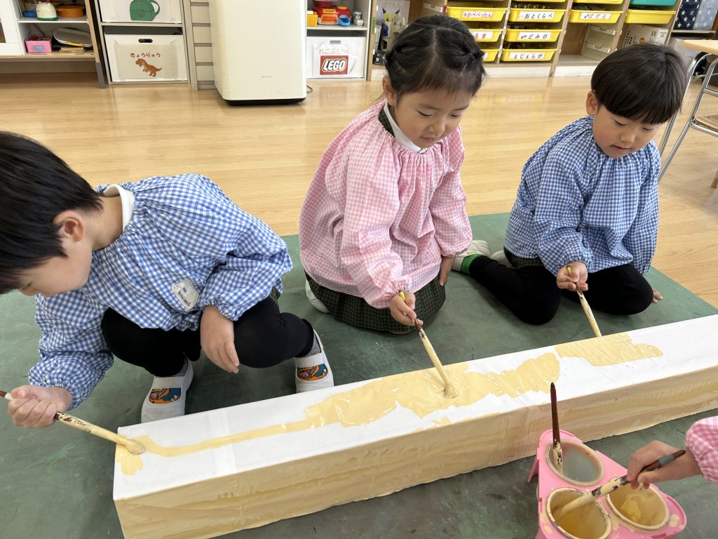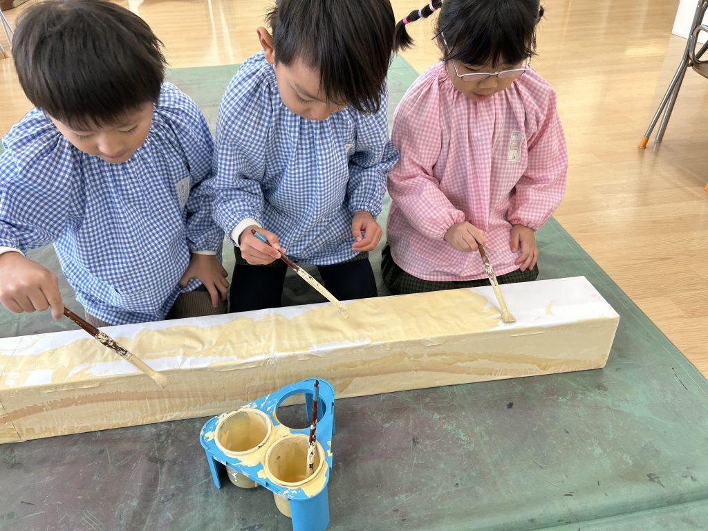 花幼ミニ万博にむけて、4,5歳児クラスのおともだちで万博のシンボル「大屋根リング」の木材部分の色塗りをしました。