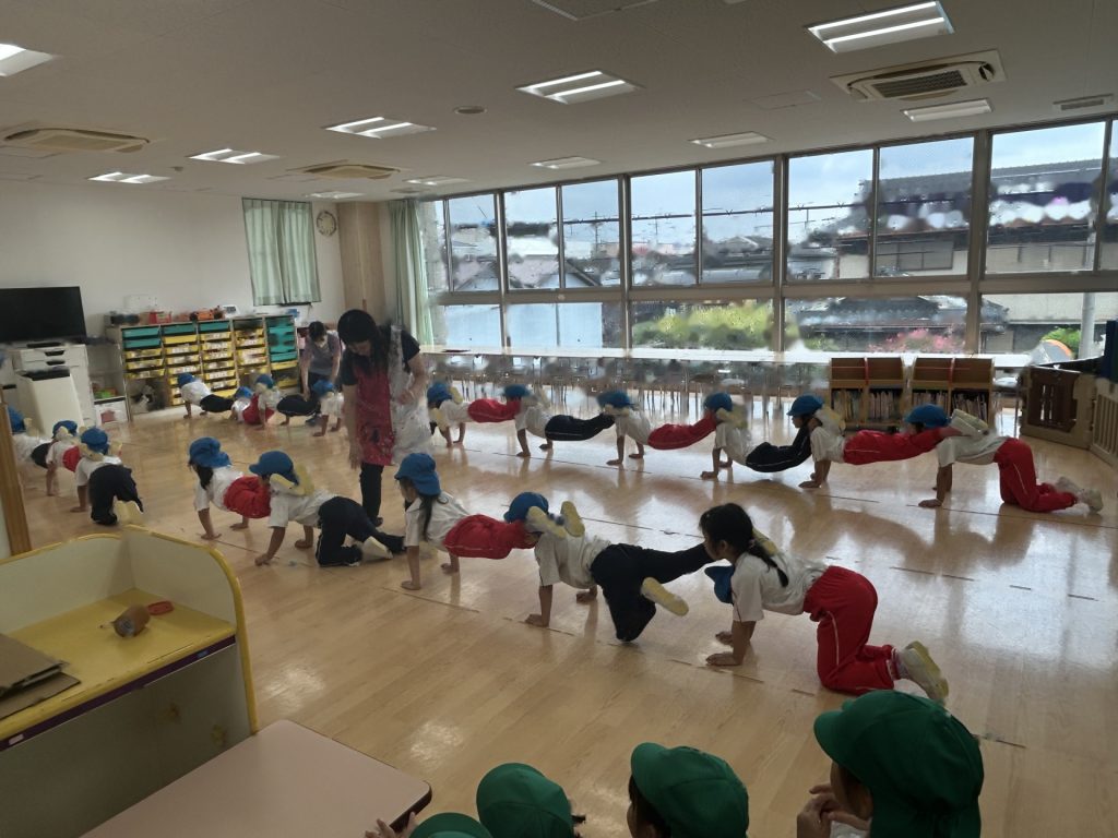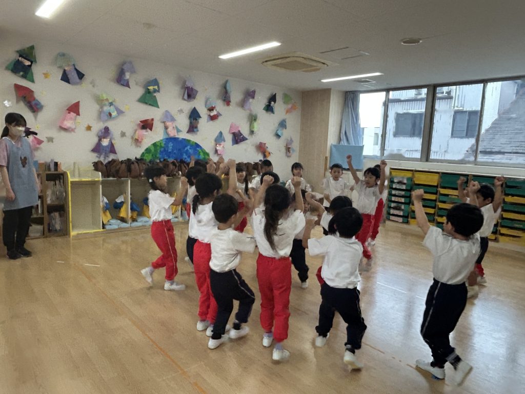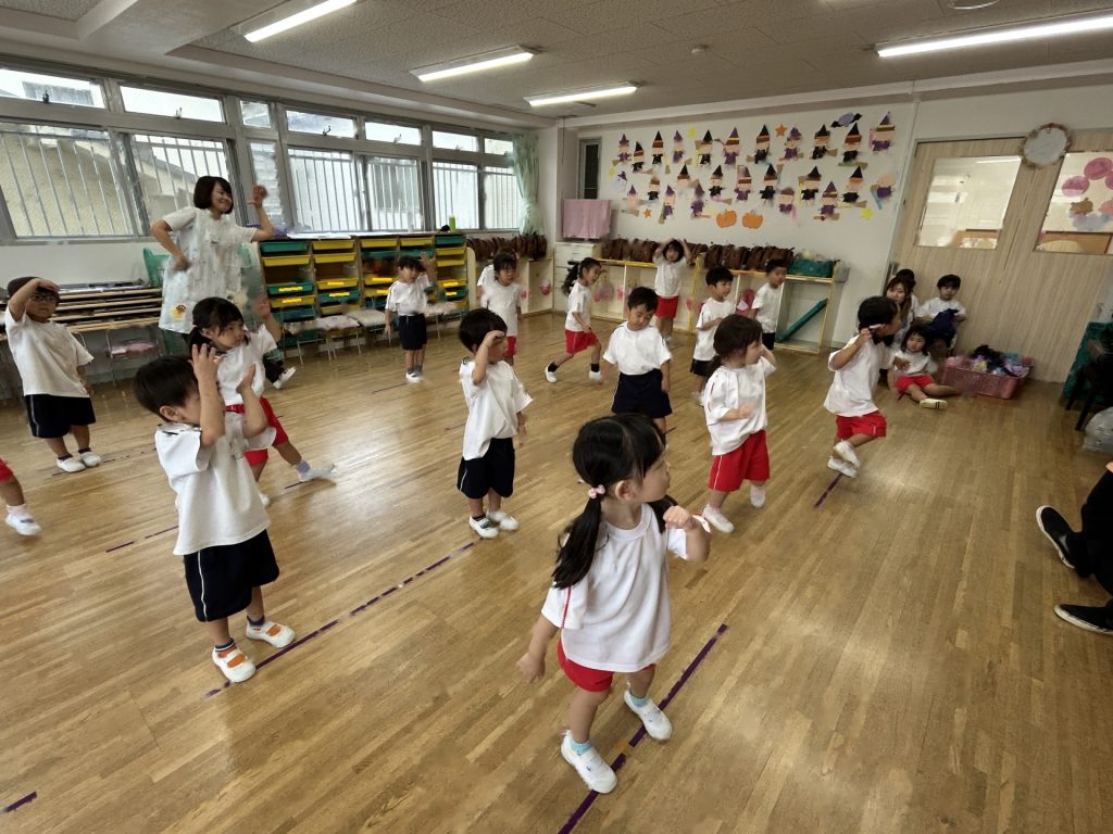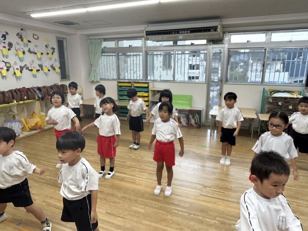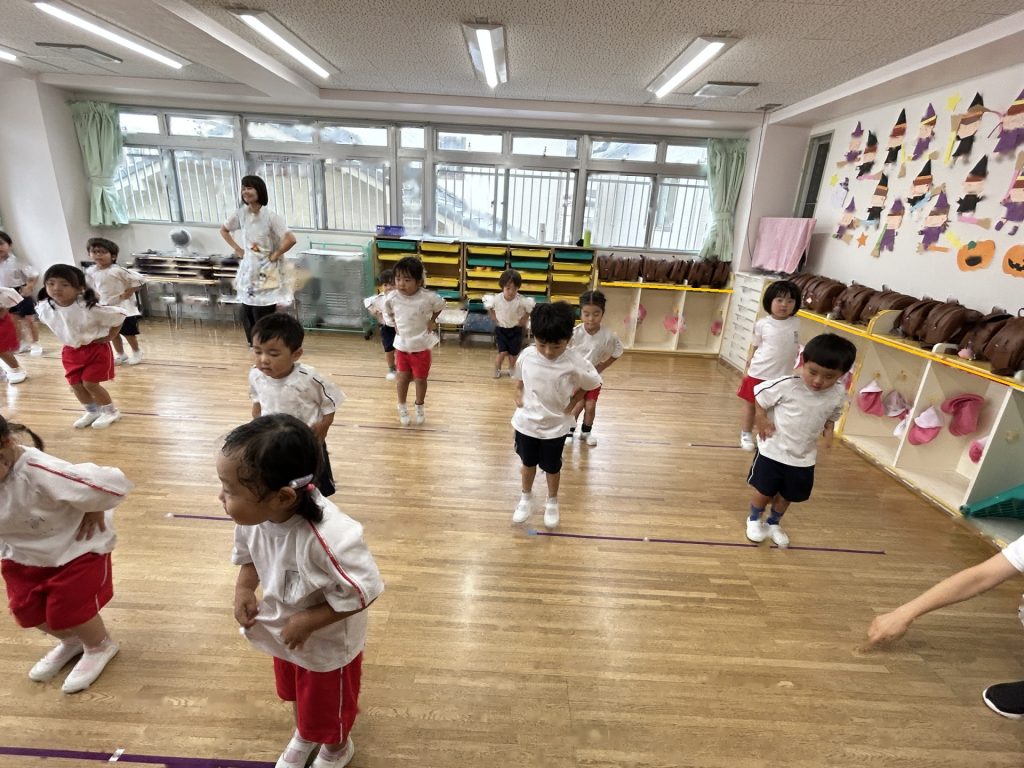 まだ練習を開始して2日目なので、保育者の動きを真似している段階ですが楽しそうに取り組んでいます😊😊😊