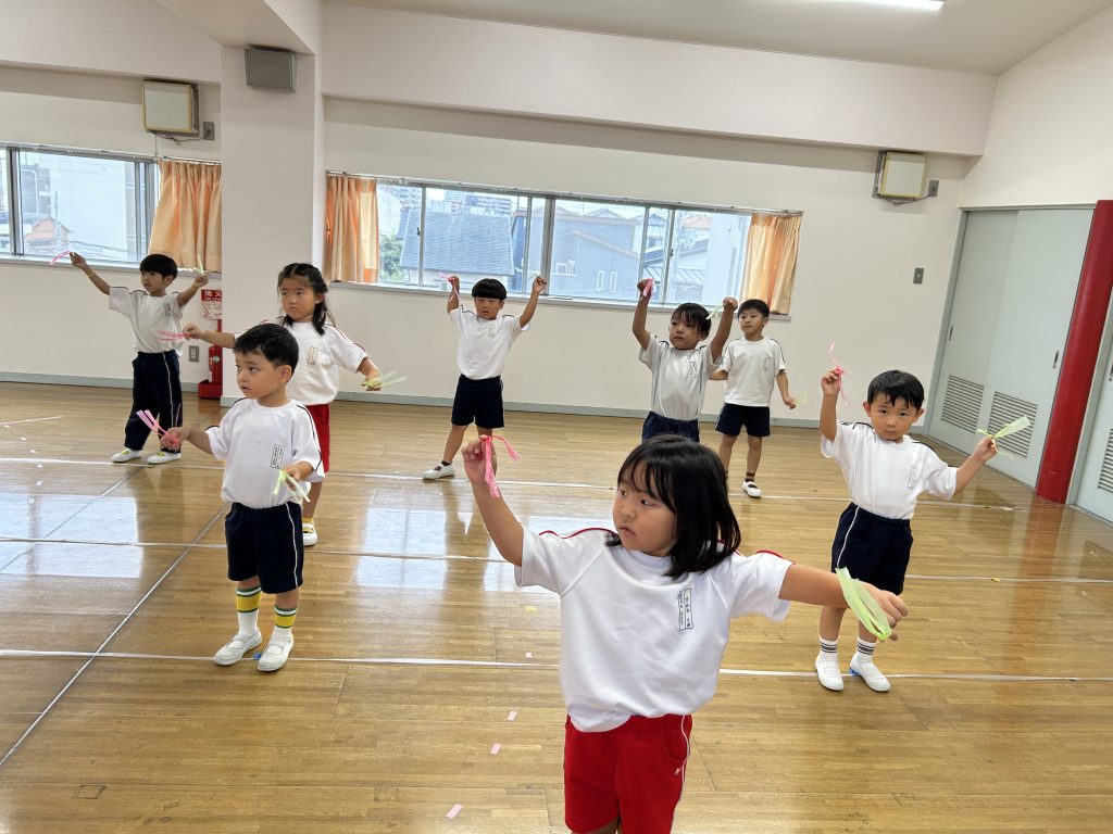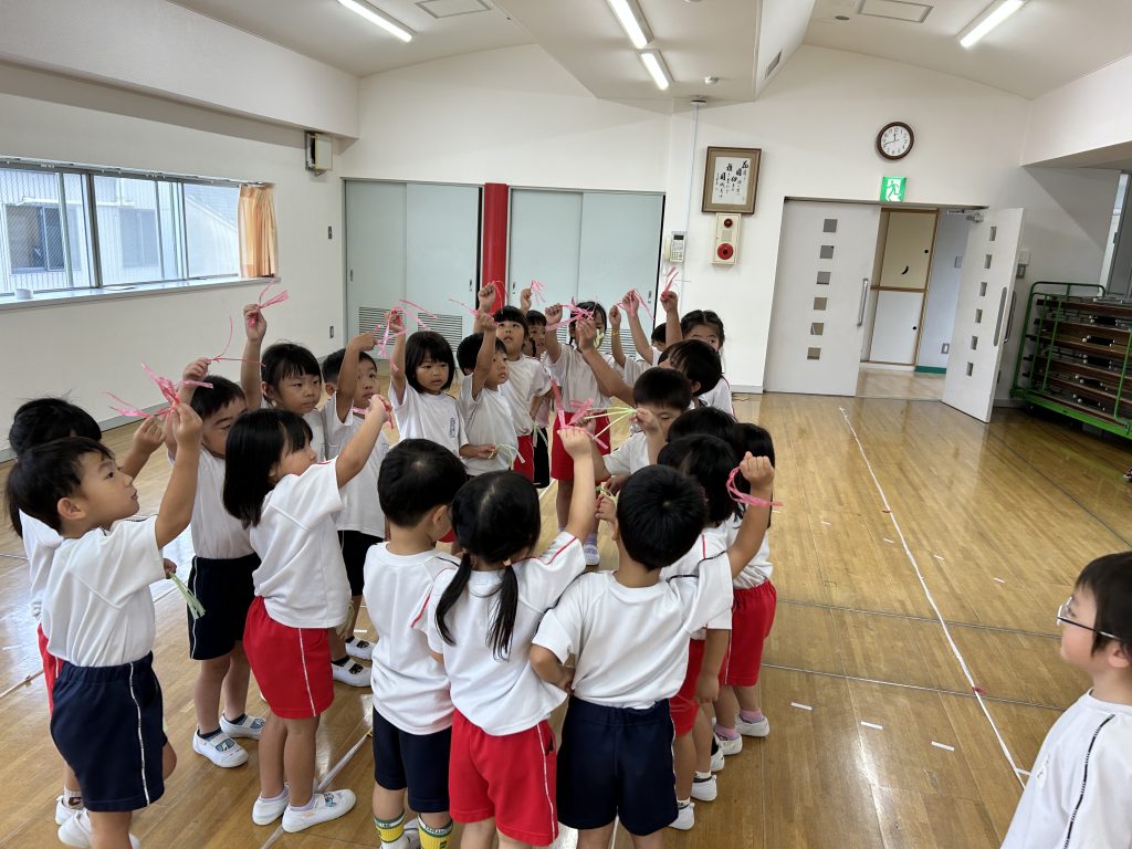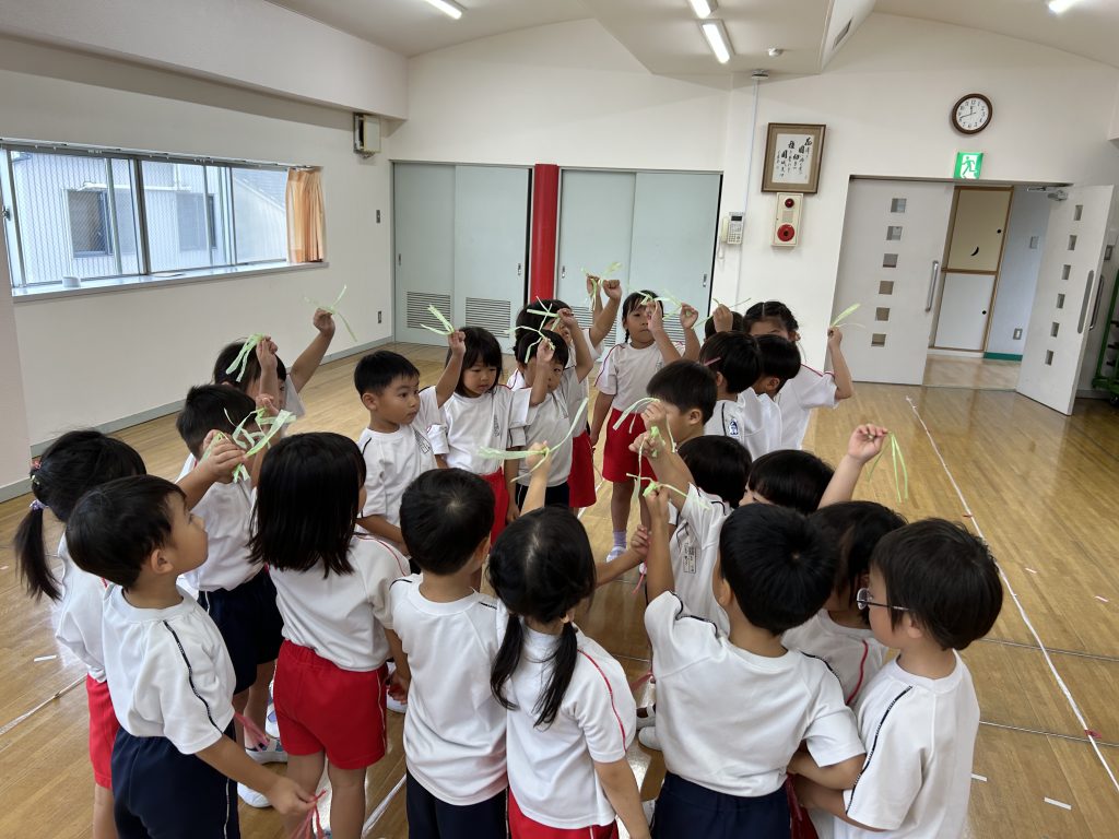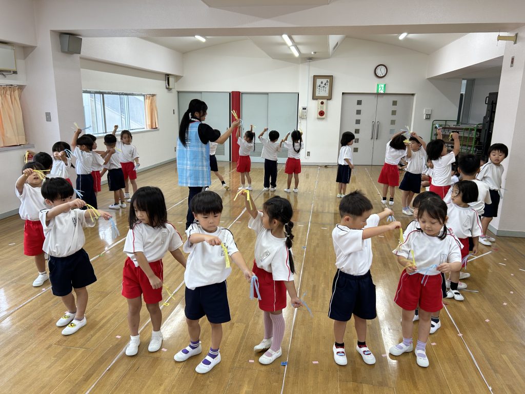 「今年はこれをもって踊るよ!」とポンポンを見せると「やったー!」「早く持ちたい」と子どもたちも嬉しそうにしていました。「みんなが踊りを覚えて上手に踊れるようになったら持って踊ろうね」と今はまだミニポンポンを持っての練習です。