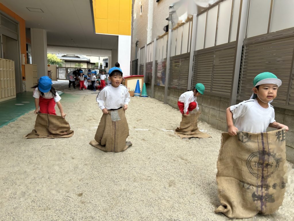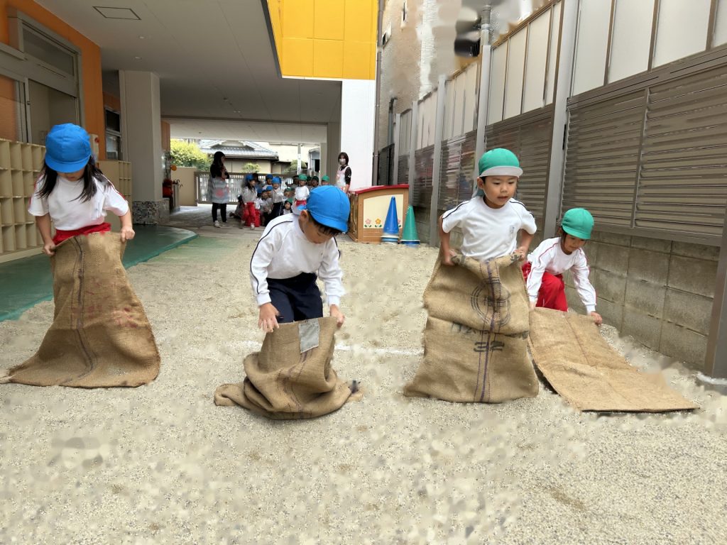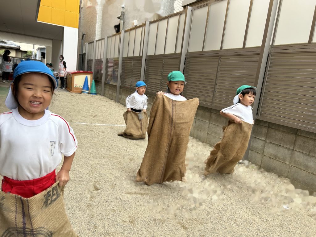 袋に足を入れ、ぴょんぴょんジャンプしながら進みます。
