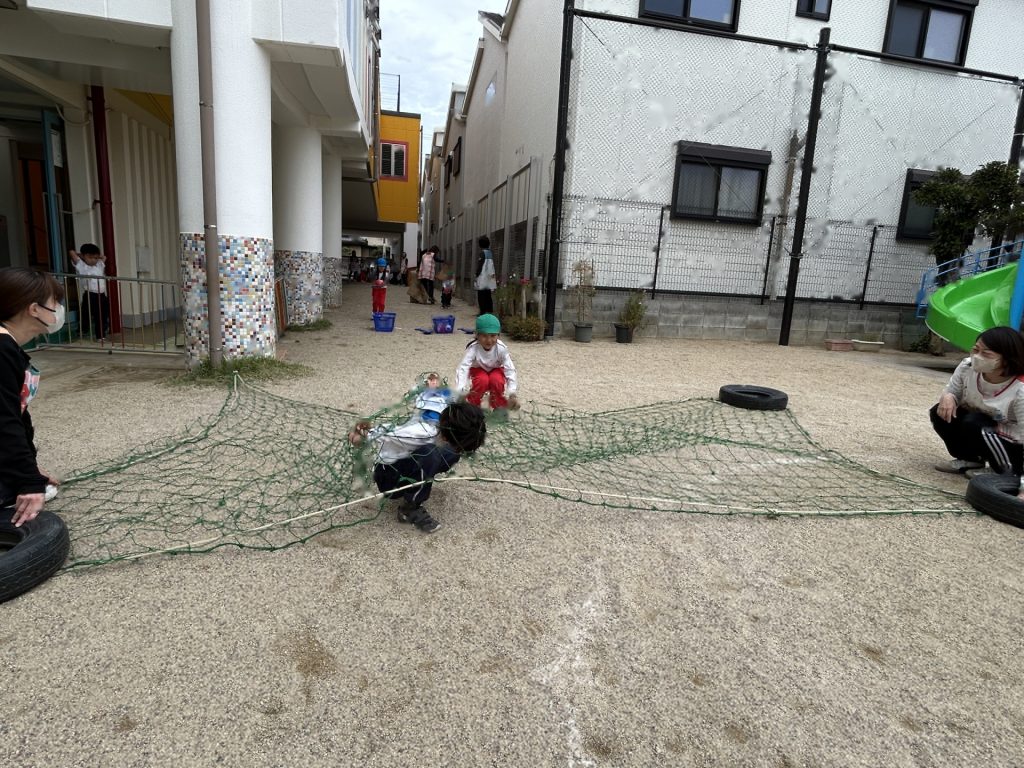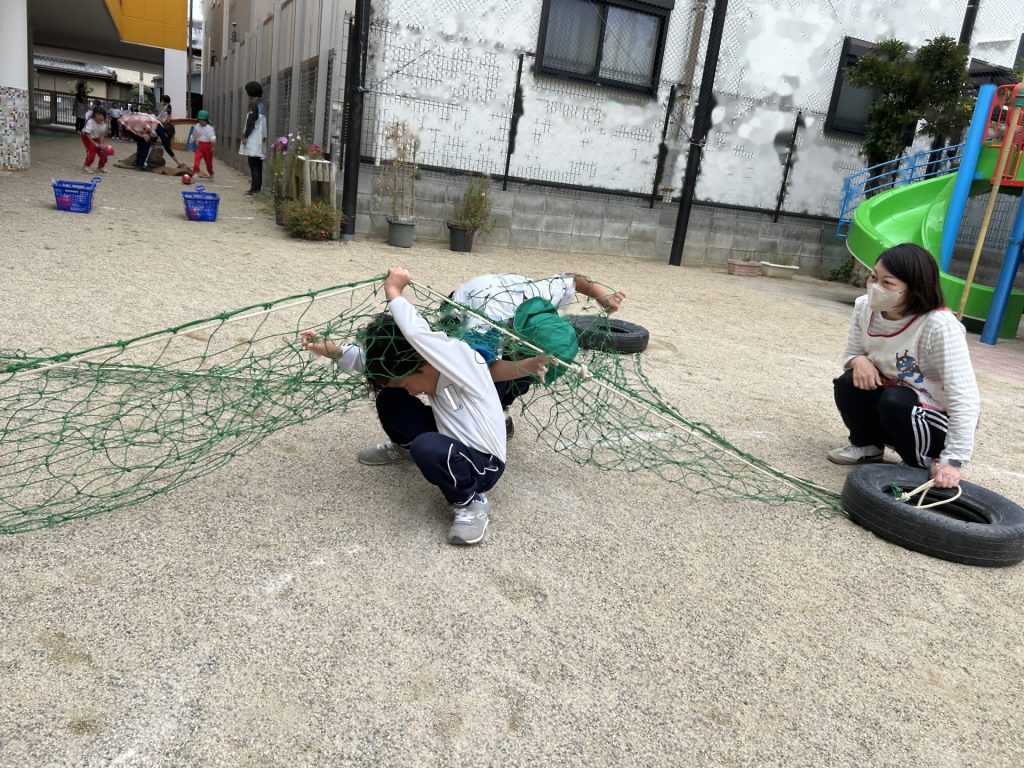 ③障害物恒例のあみくぐりです。このあみは大屋根リングをイメージしています。大屋根リングの下を通って次に進みます。ここでなかなか進めない子もいるので逆転チャンスの場所です。