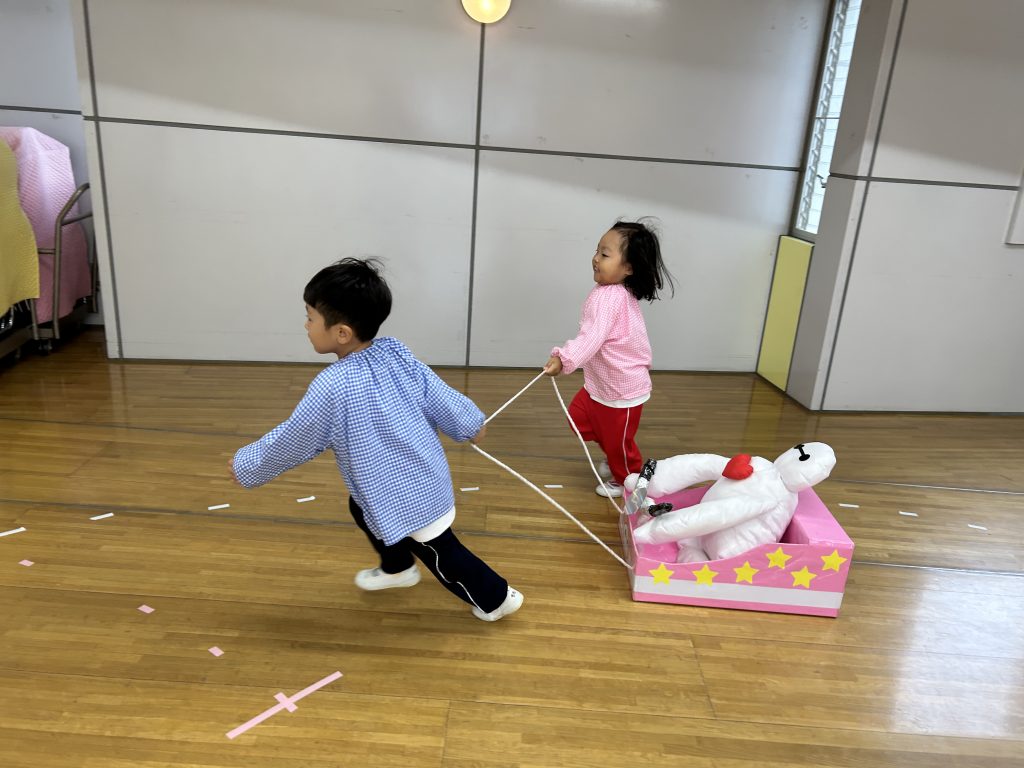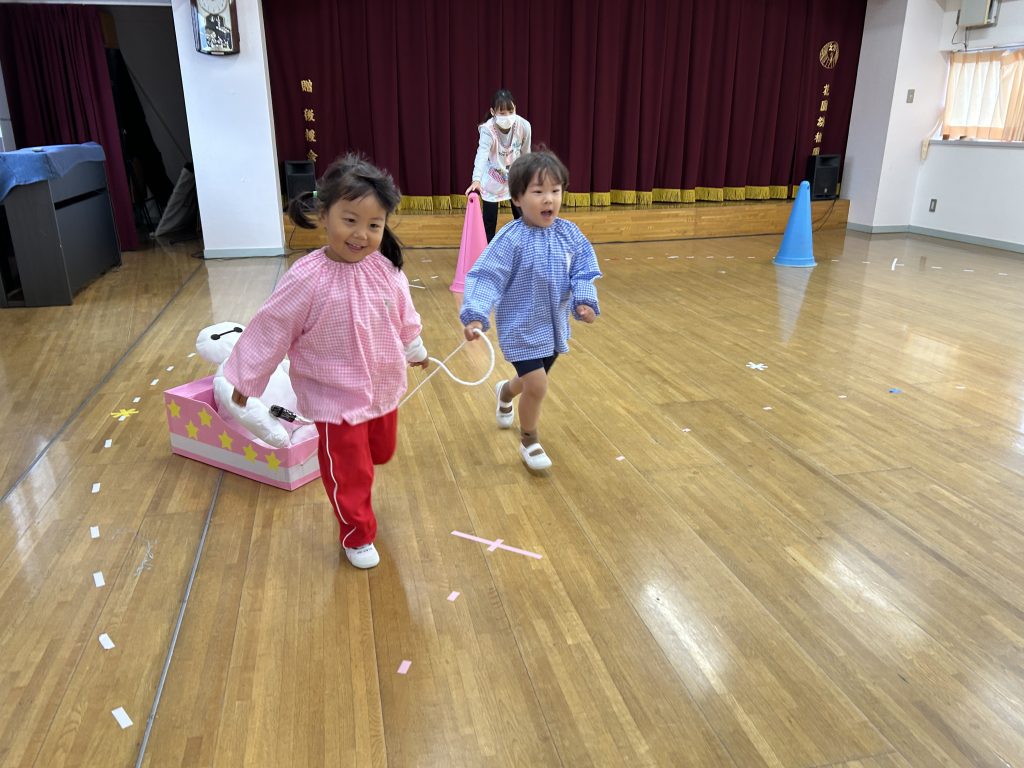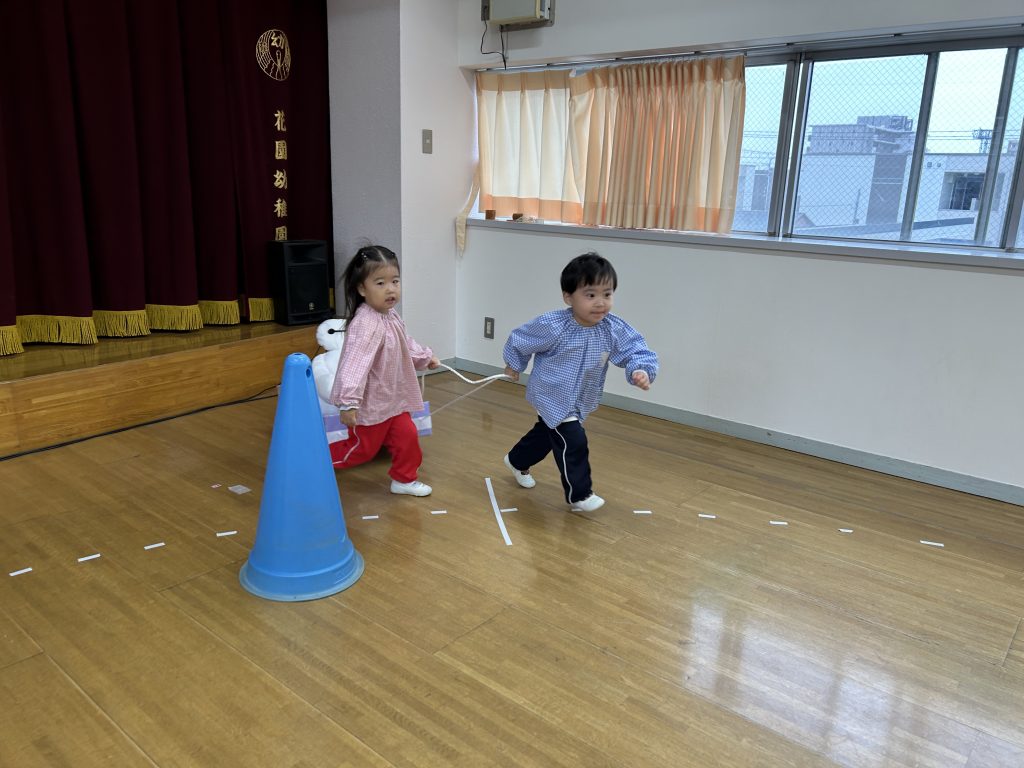 何度か練習をしたので少しづつスムーズになってきましたが、初めのうちは競争という感じではなく2人でゆっくり引っぱったり、コーンでひもが絡まったりとハプニングもたくさんありました。