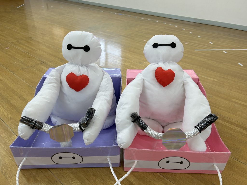ディズニーランドのアトラクションをイメージした車を運転しているベイマックスを2人1組で引っぱり、コーンでUターンして次の人にバトンタッチ、リレー形式の競争を行います。