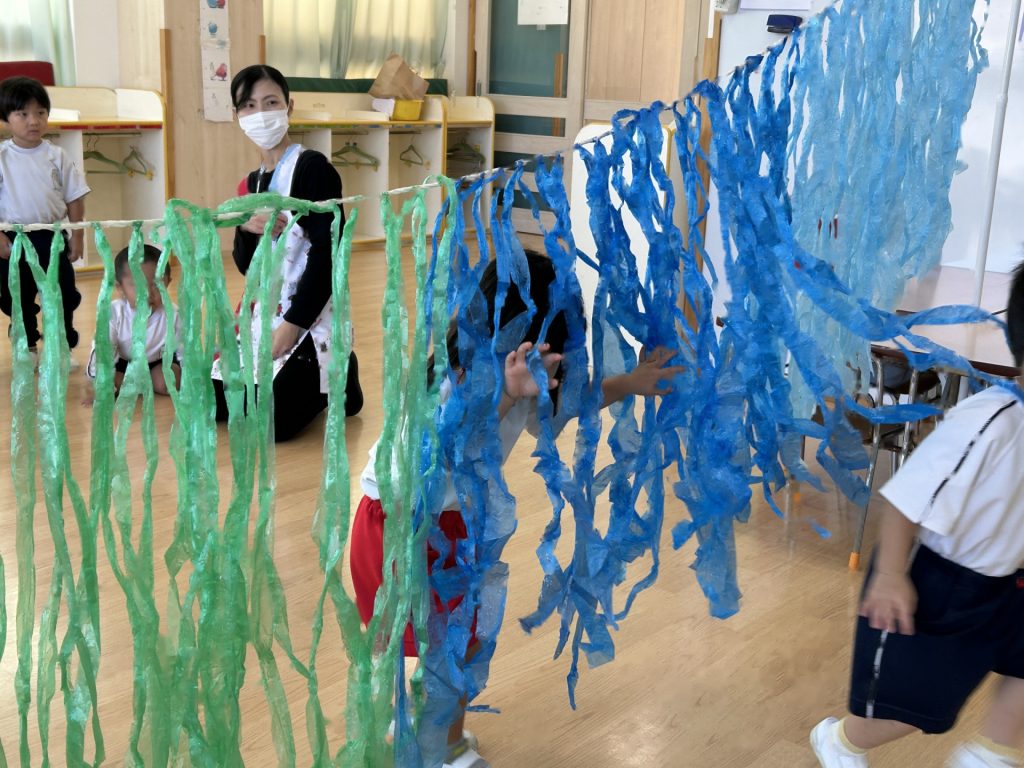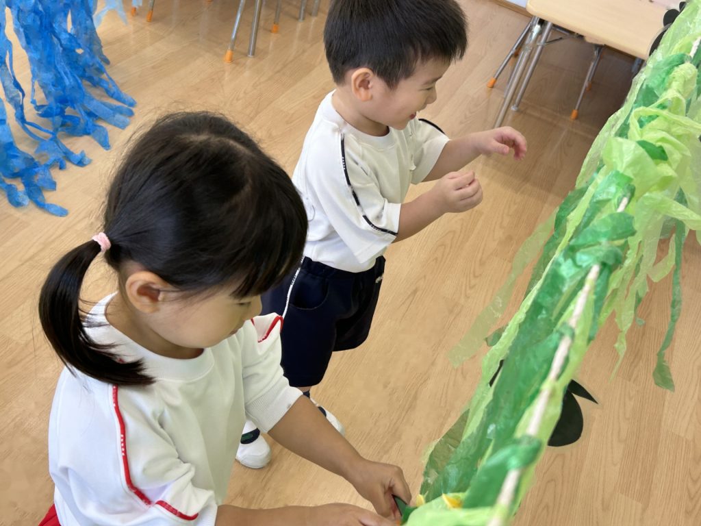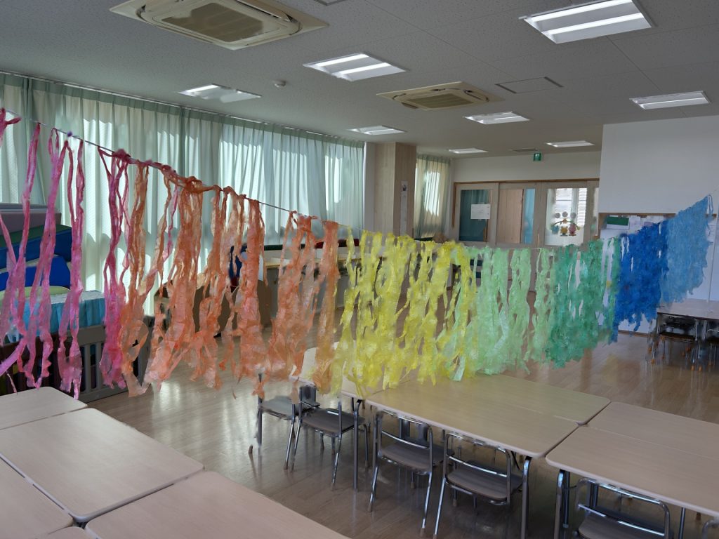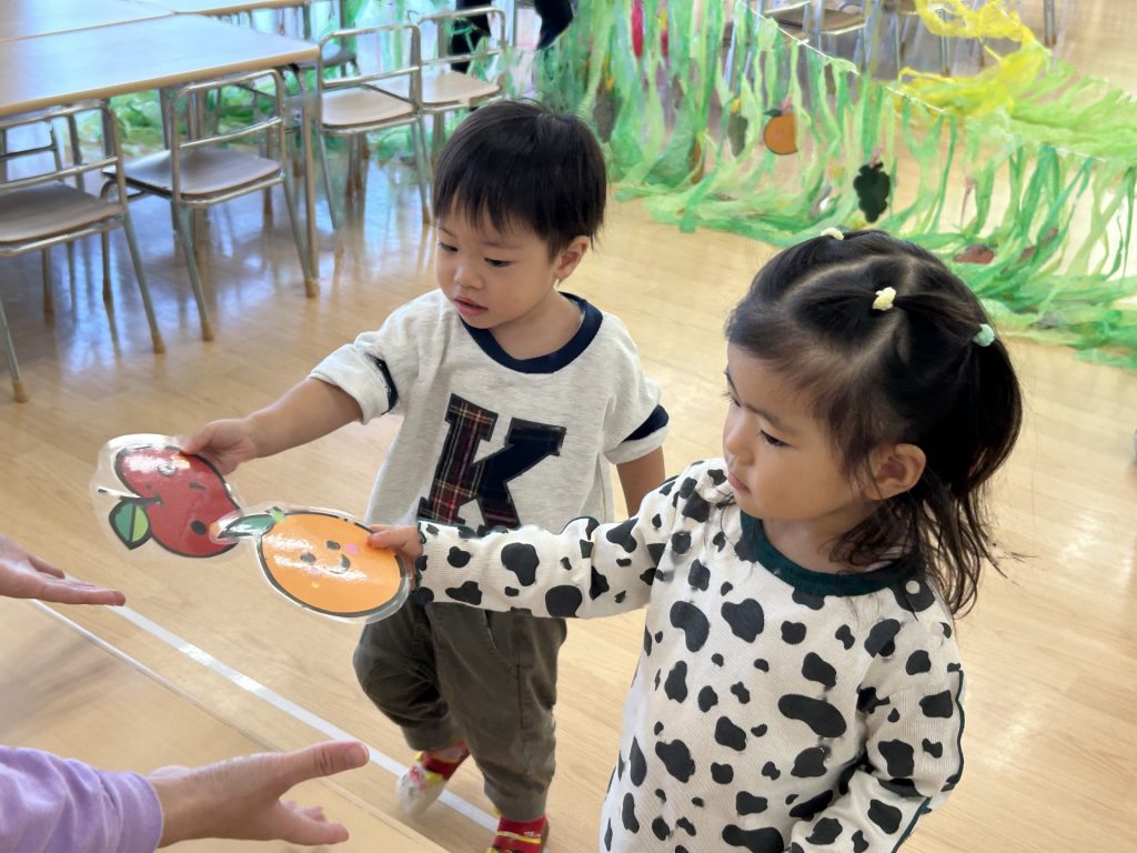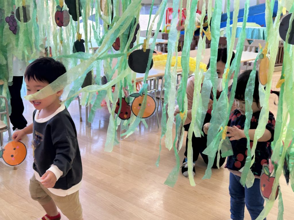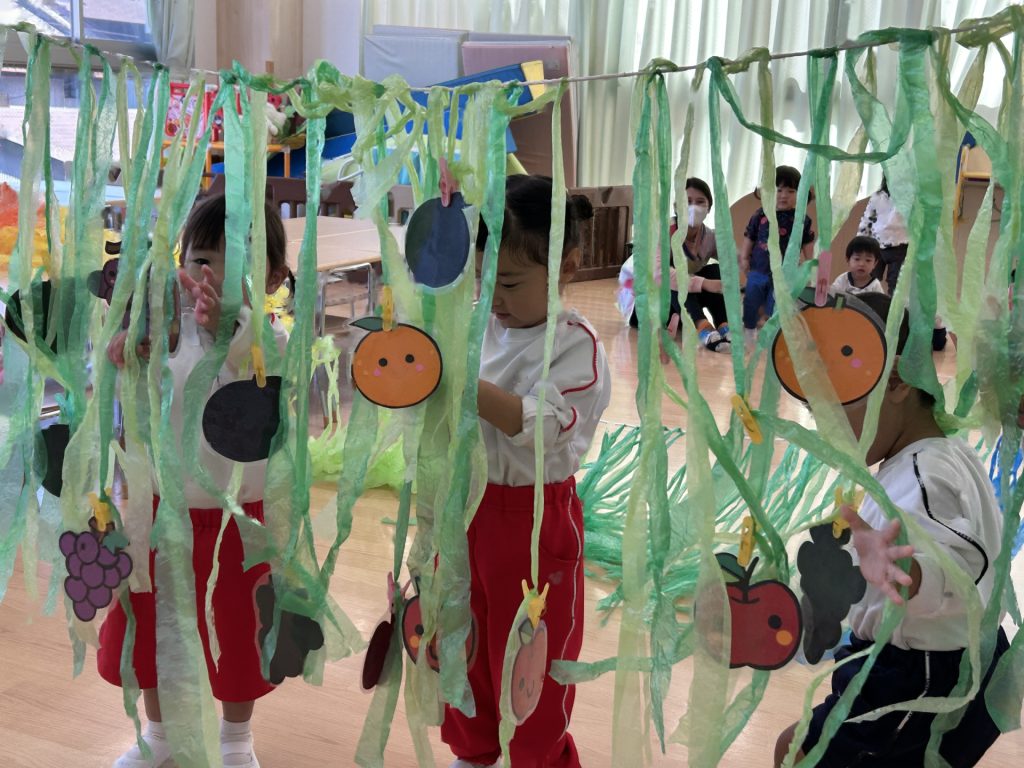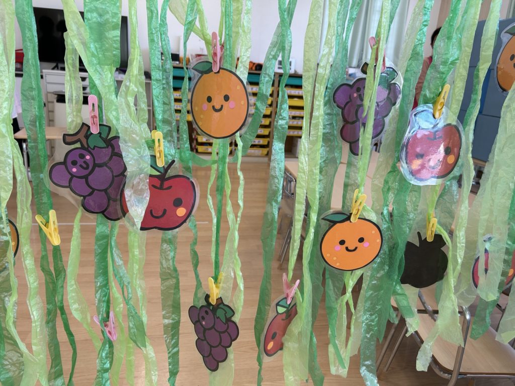 次に緑のスズランテープのカーテンにいろいろな果物のカードをつっています。