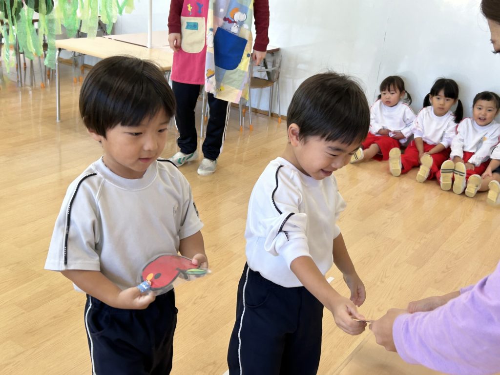 カードがとれたら、そのカードを持ってゴールのジュース屋さん(保育者)にカードを渡してください。