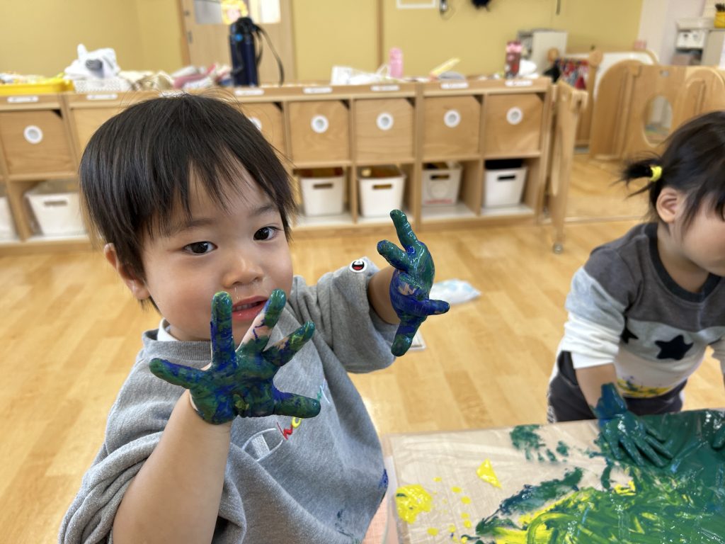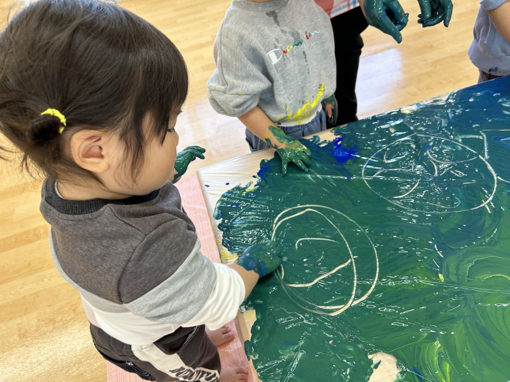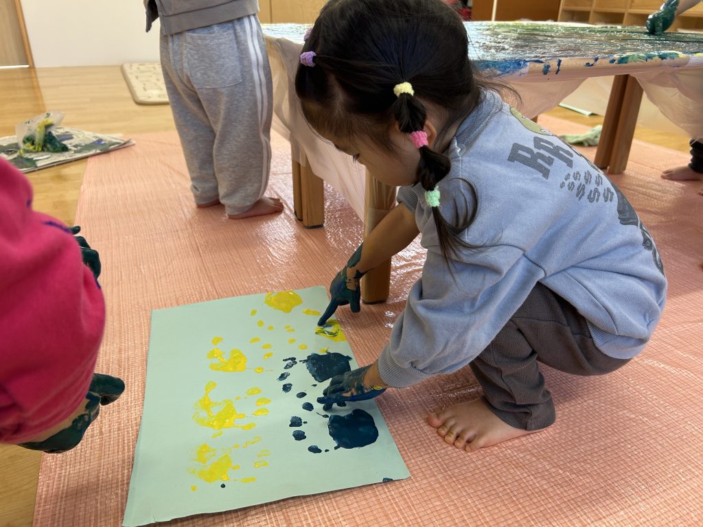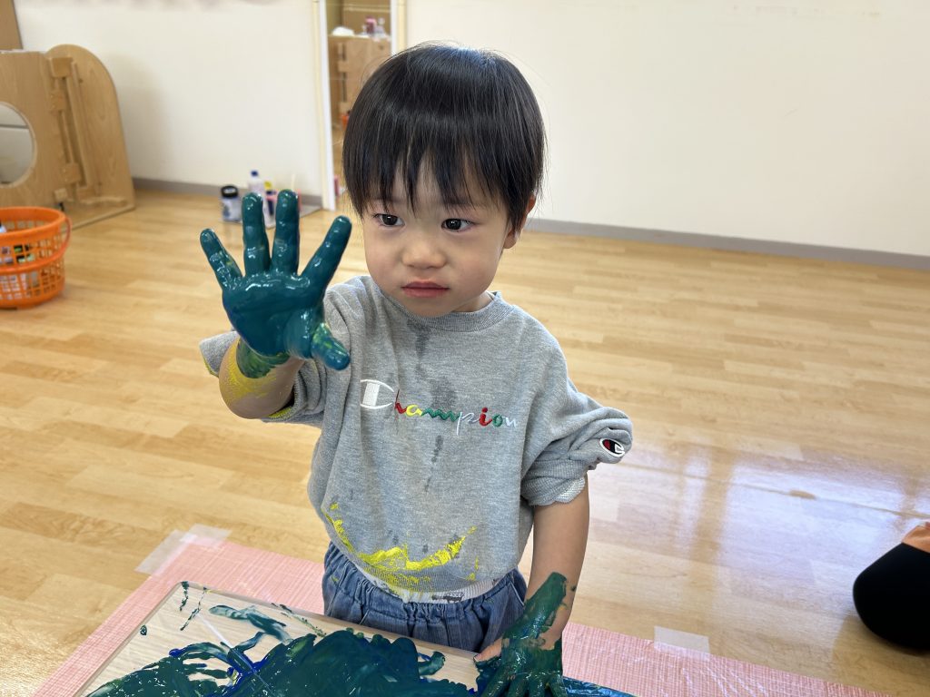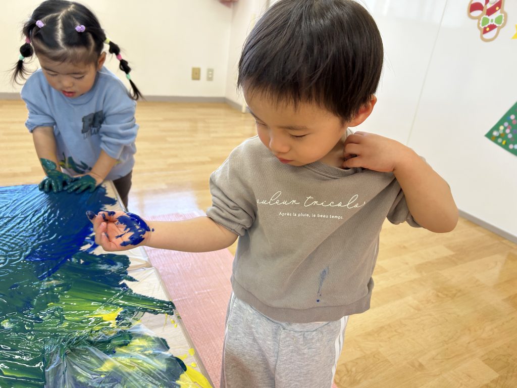 まず初めは絵の具をビニールの上に出し手で触れてみました。初めは指先でチョンと触って様子を伺っていたおともだちもいましたが、慣れてくると大胆に手でどんどん広げていっていました。最後まで絵の具に触るのを嫌がっていたおともだちもいました。