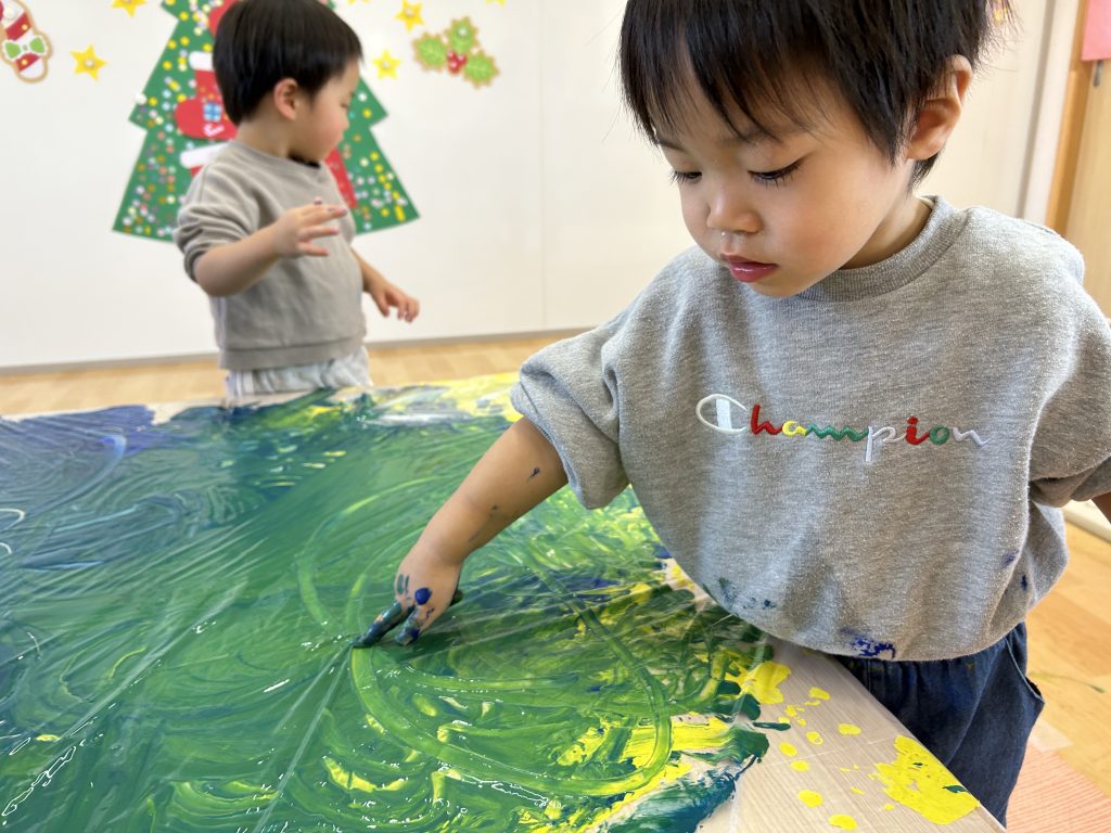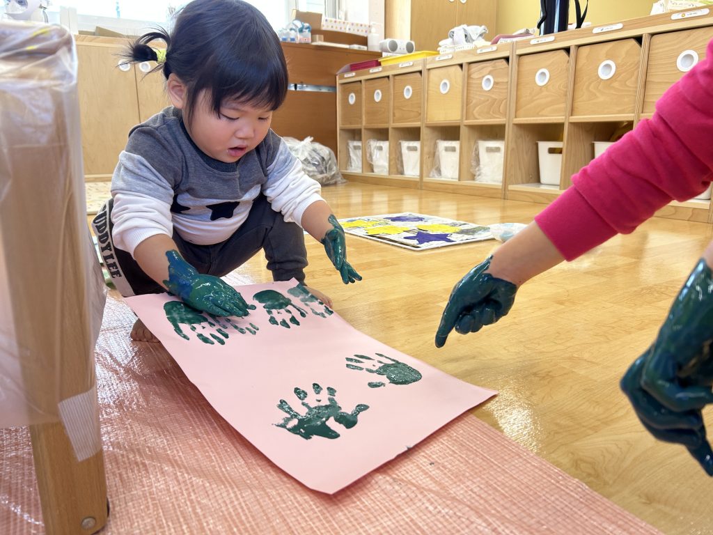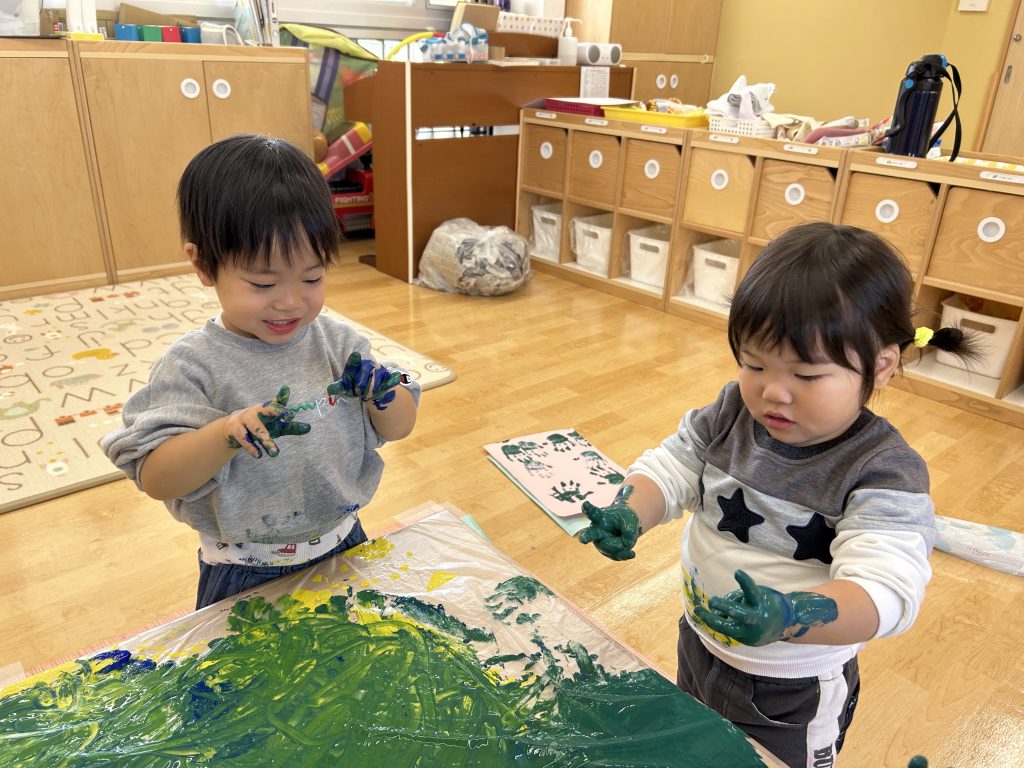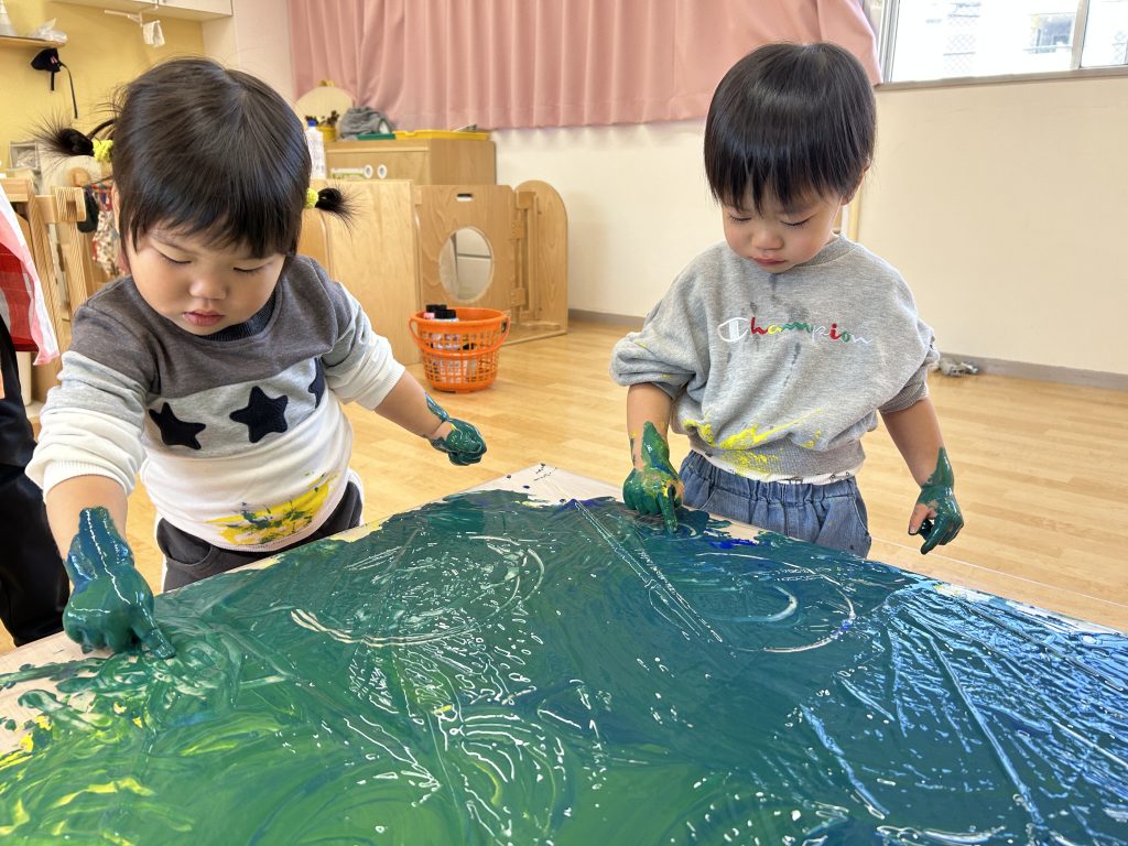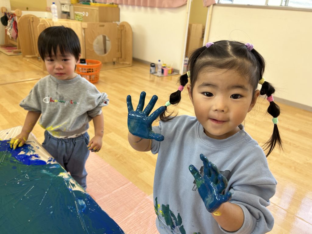 まず初めは絵の具をビニールの上に出し手で触れてみました。初めは指先でチョンと触って様子を伺っていたおともだちもいましたが、慣れてくると大胆に手でどんどん広げていっていました。最後まで絵の具に触るのを嫌がっていたおともだちもいました。