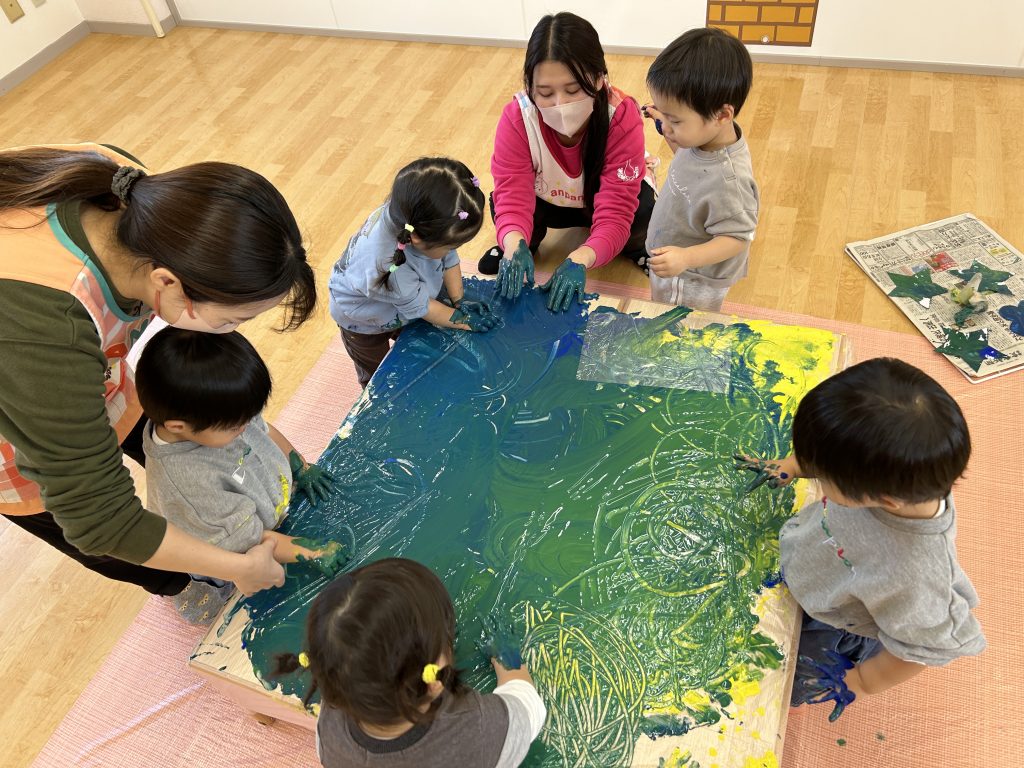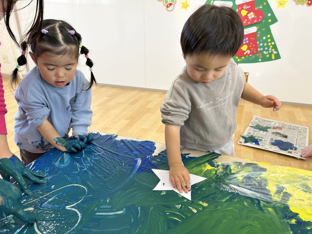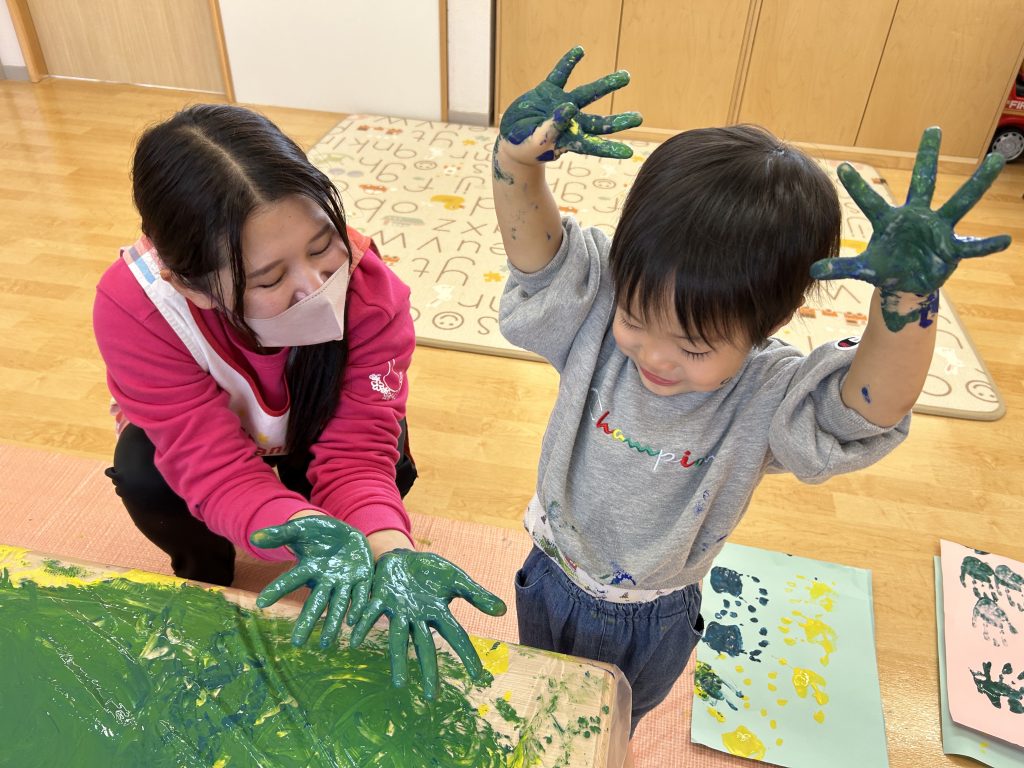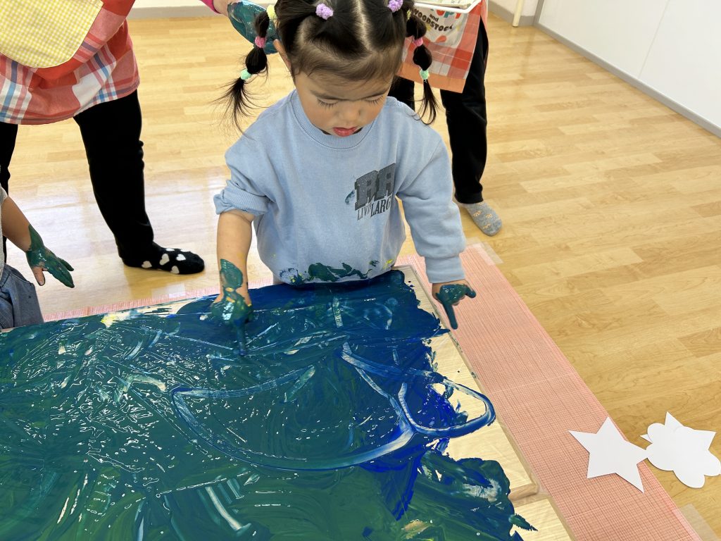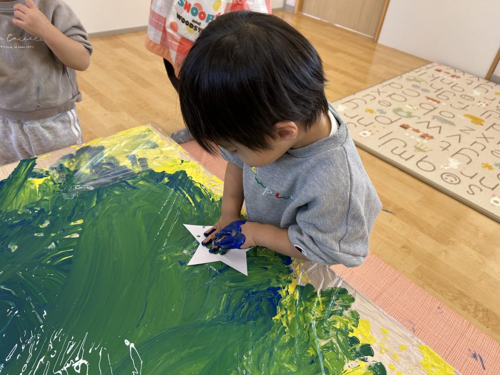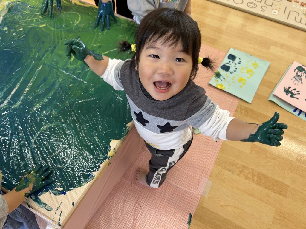途中で手形をしたり、ハートや星の画用紙を乗せて色がうつるのを楽しんだり、指で絵を描いたり、集中して楽しんでいました。最近言葉もたくさん出るようになったたんぽぽぐみさん、お話をたくさんしながら楽しんでいました😊