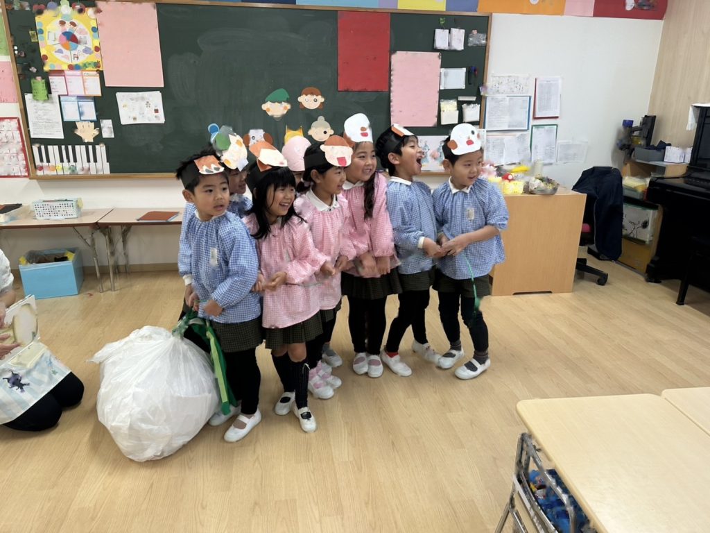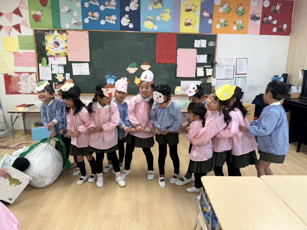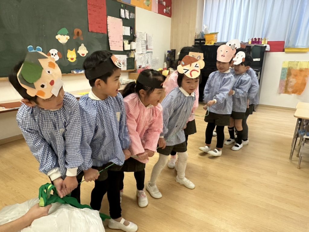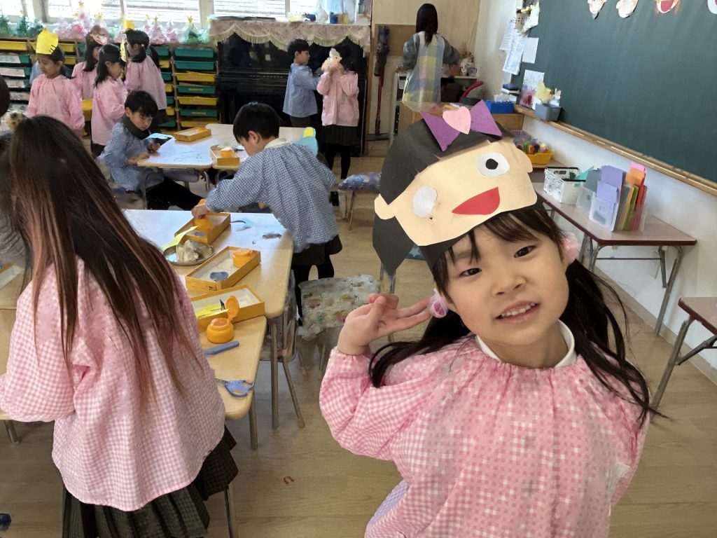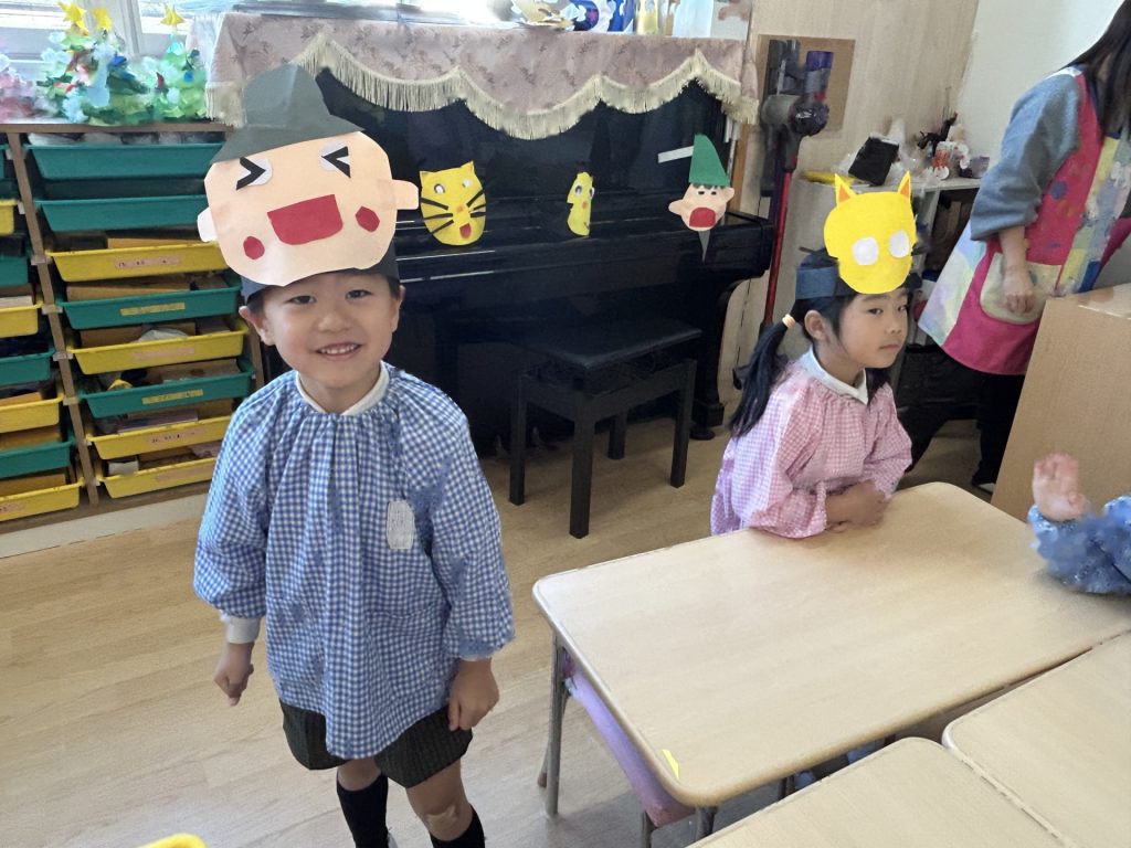 初めにお話に出てくる役の中から好きな役を選んで画用紙で顔を作りました。その後、ベルトをつけお面が完成!