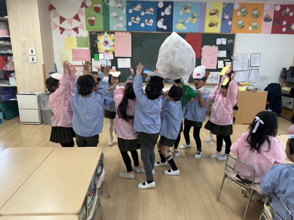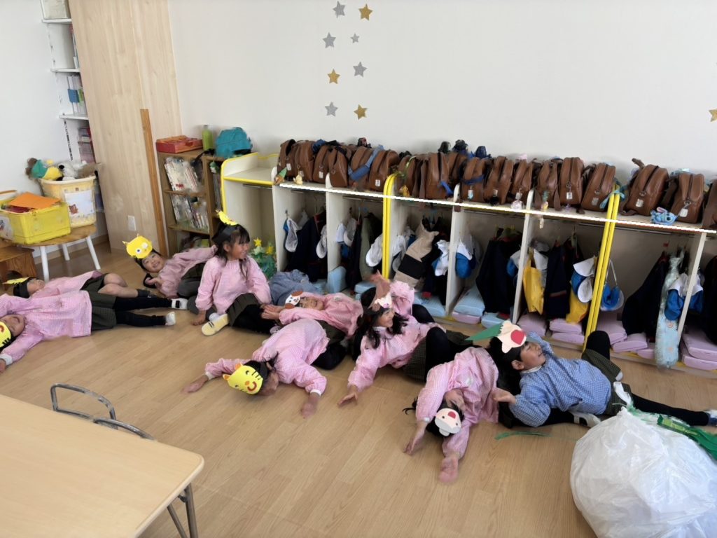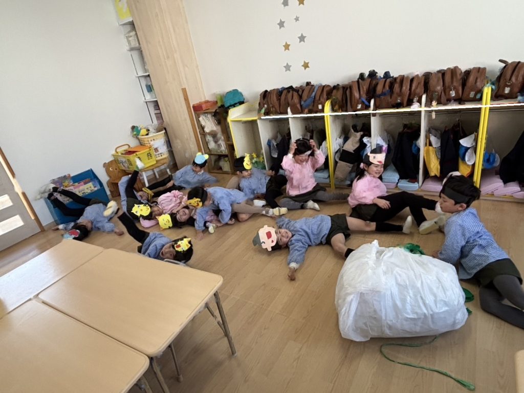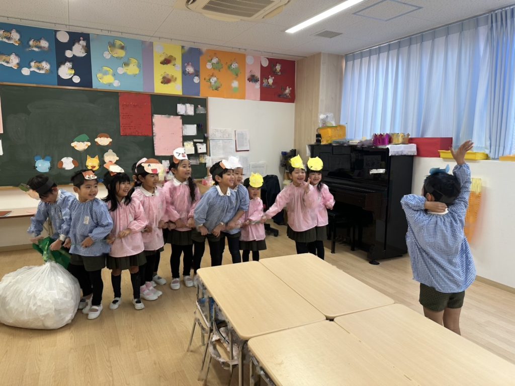 2グループに分け、劇をする人とお客さんにわかれて劇ごっこをしました。