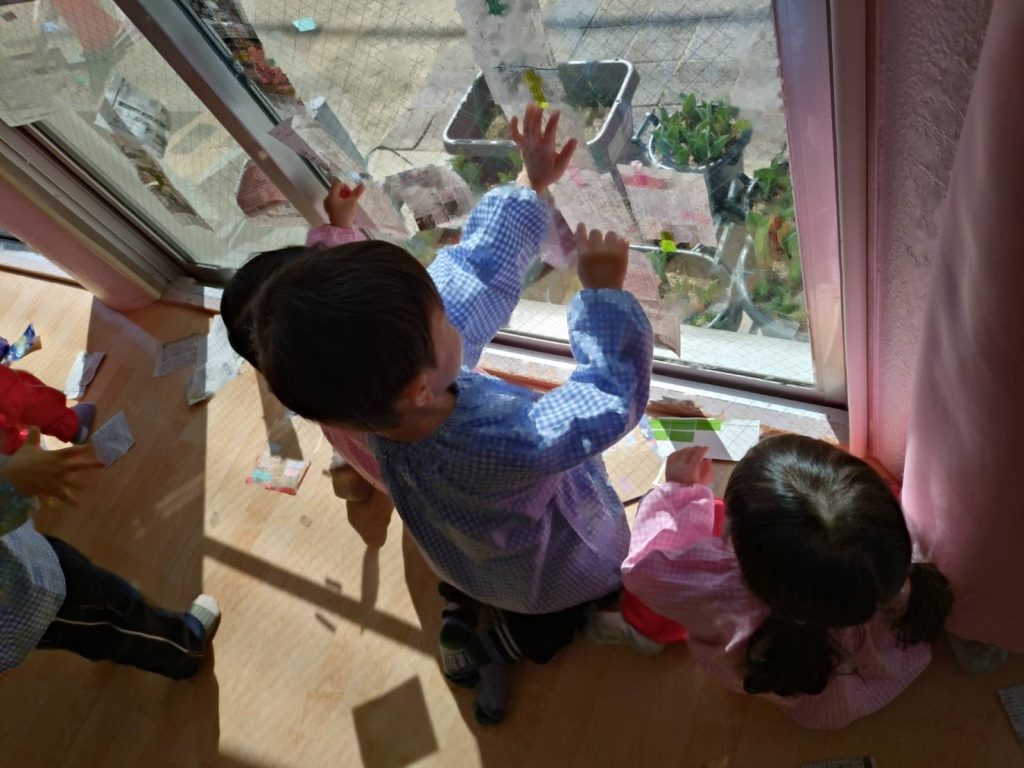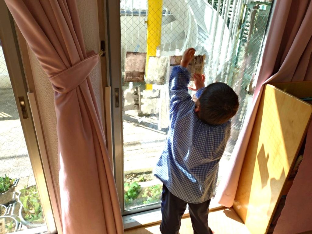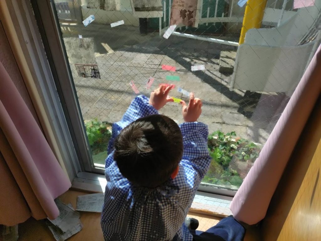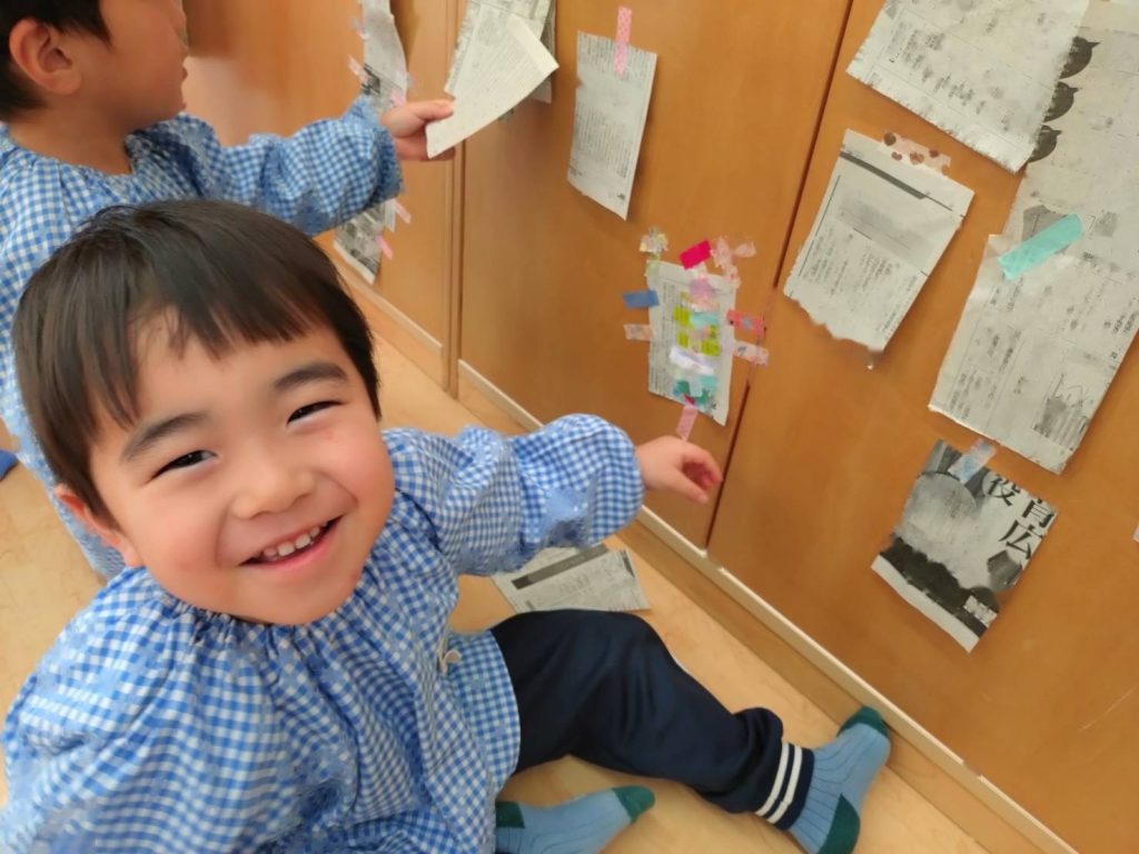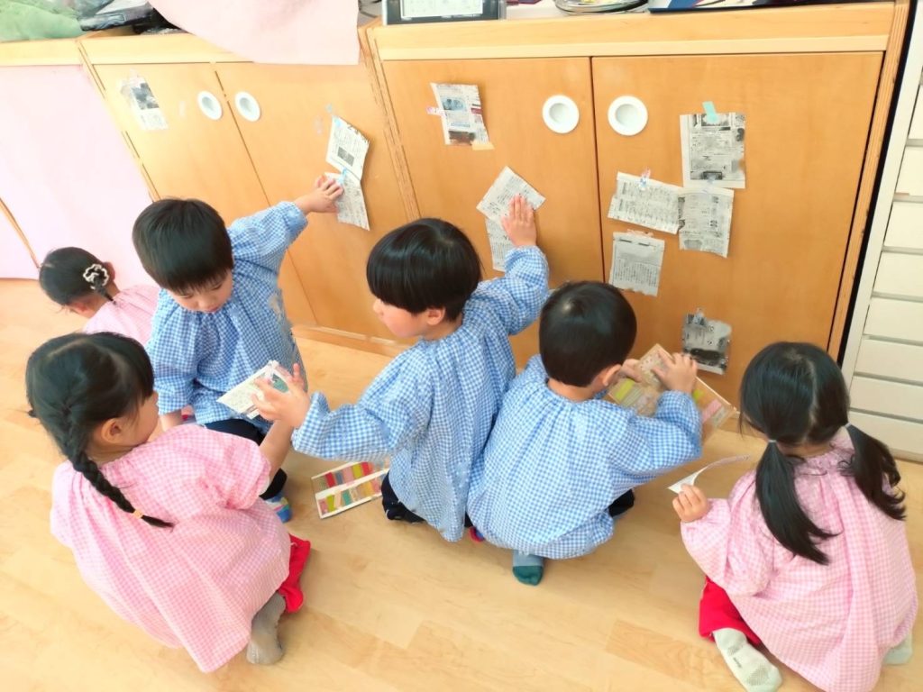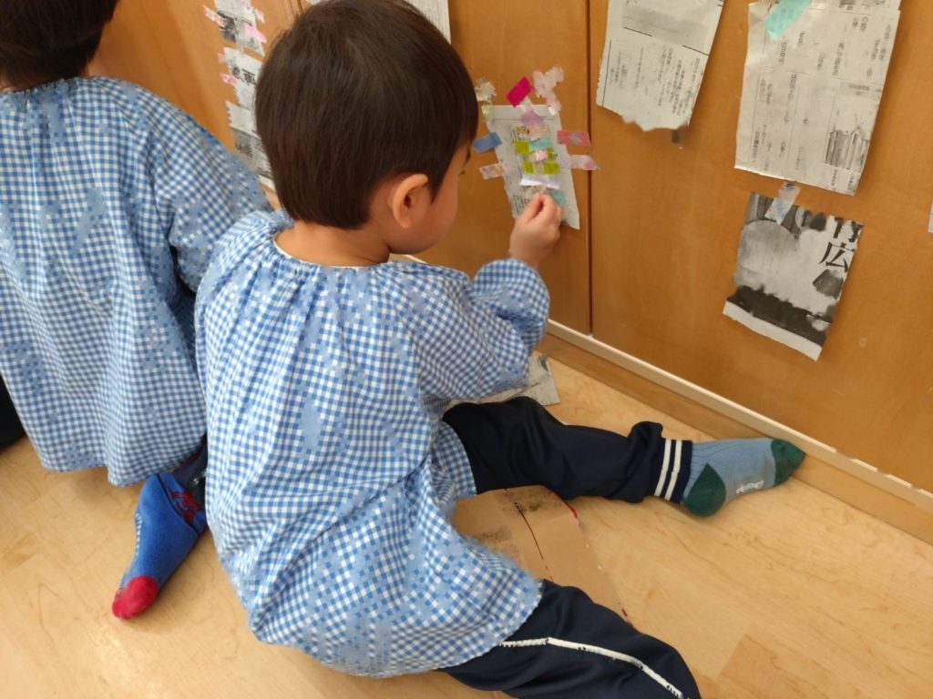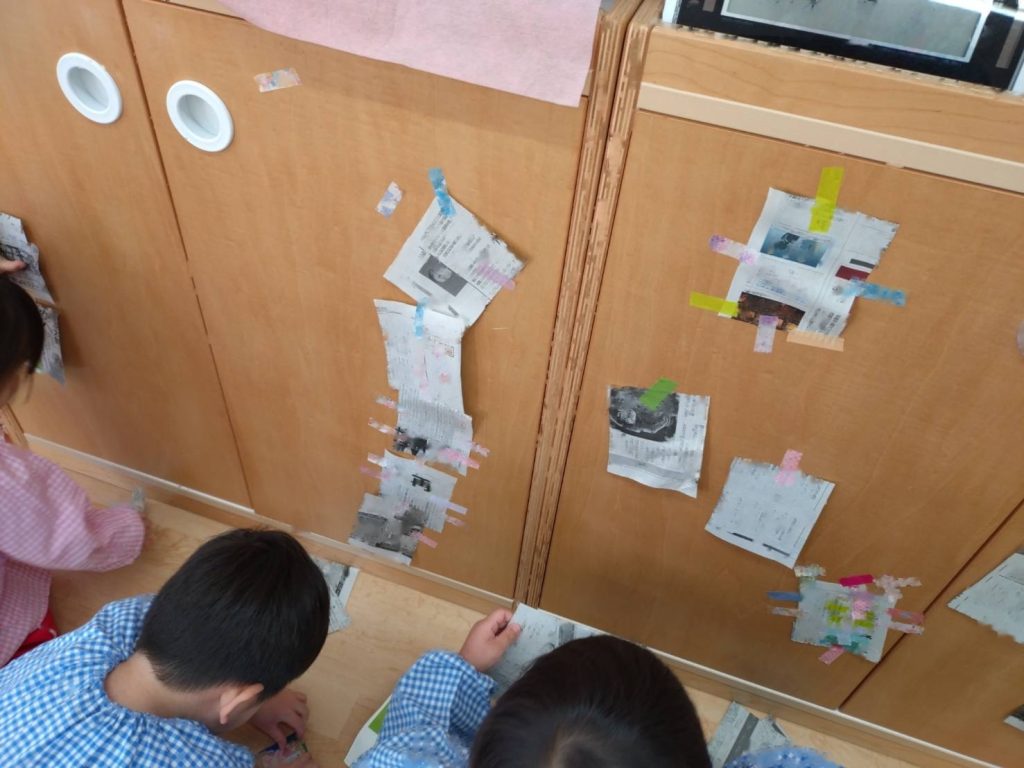 新聞を切ったものとビニールテープを用意し、自由に貼って遊びました。
