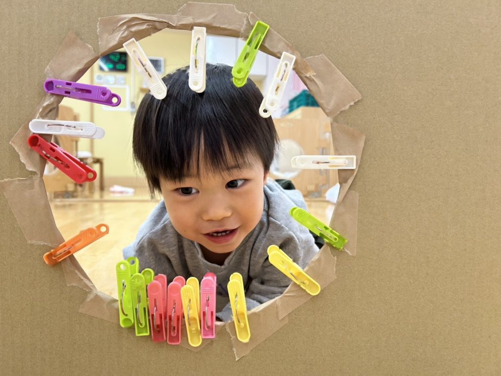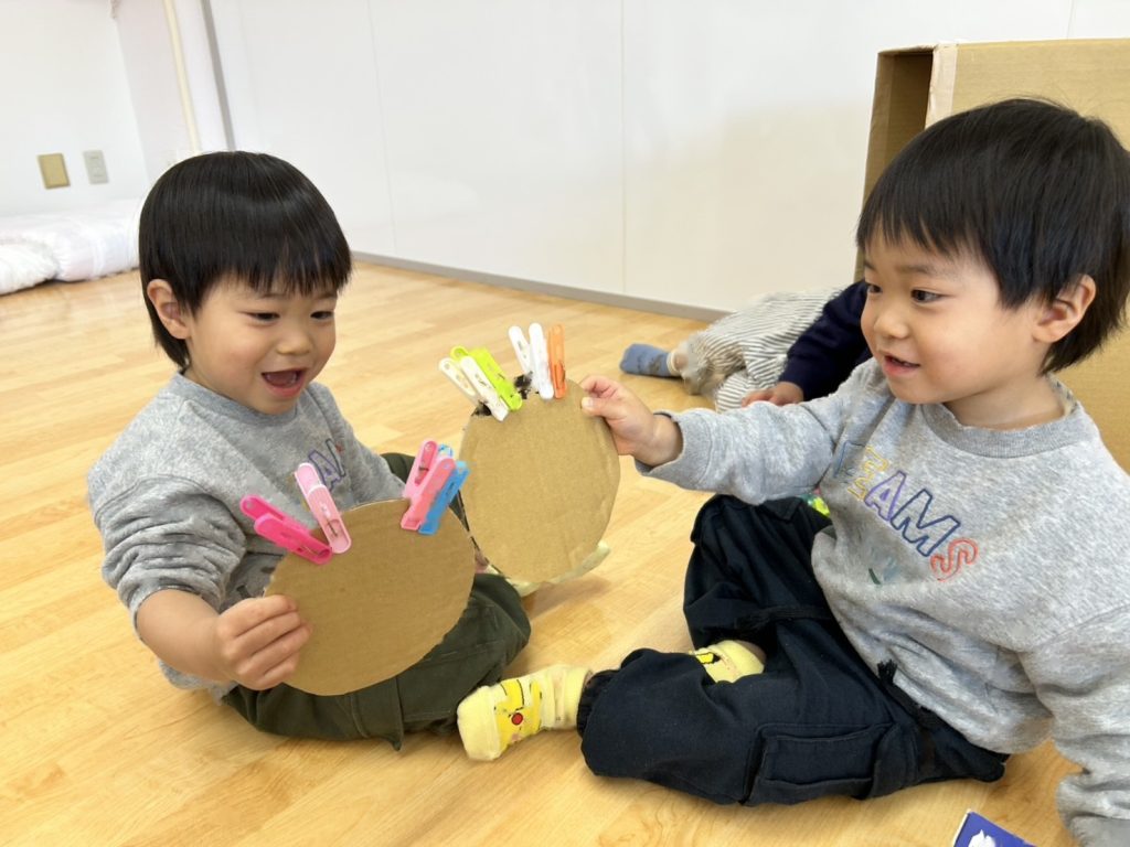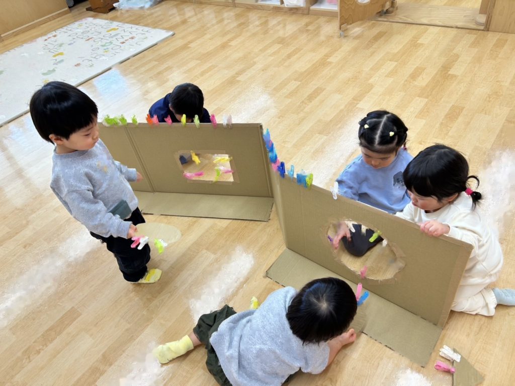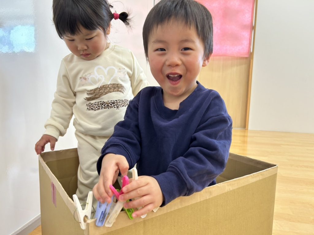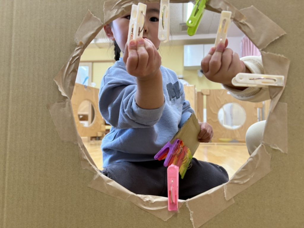 大きな段ボールやひもなど用意し、好きな所にはさんだり、とったりとても集中して取り組んでいました😊
