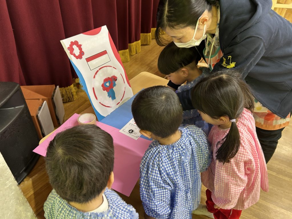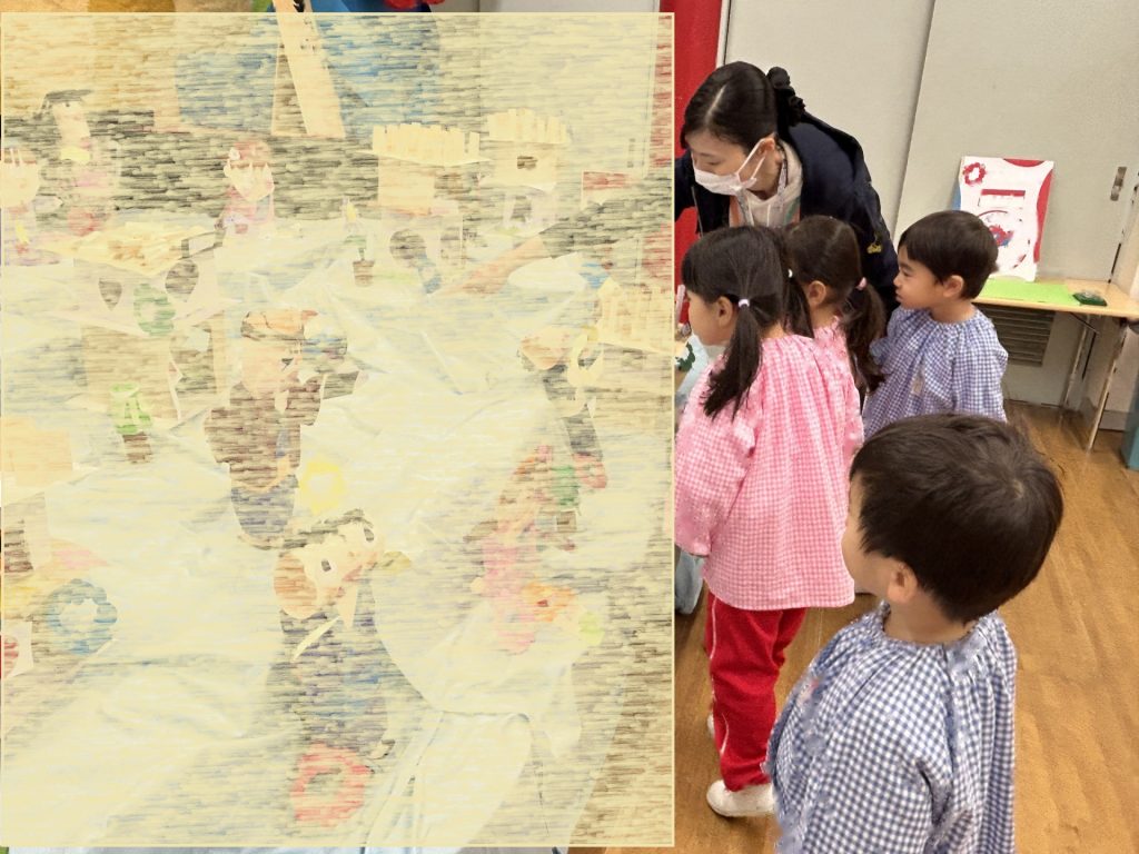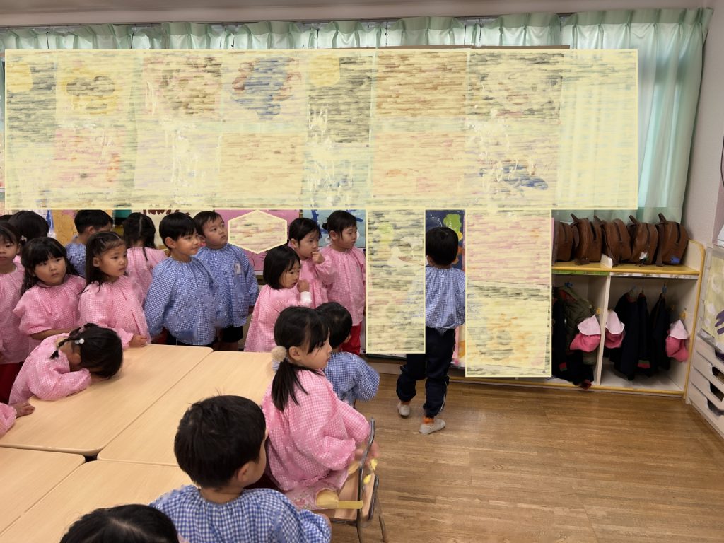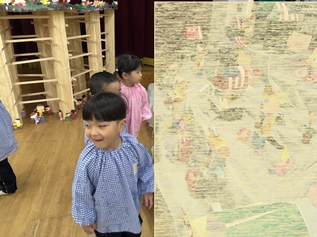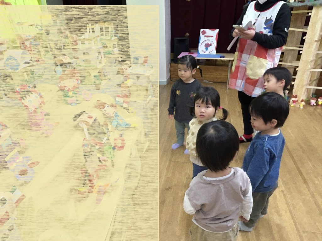 プリントでお知らせした通り、当日は各部屋に3~5歳児の絵画、3階ホールに全園児の製作作品を展示しています。