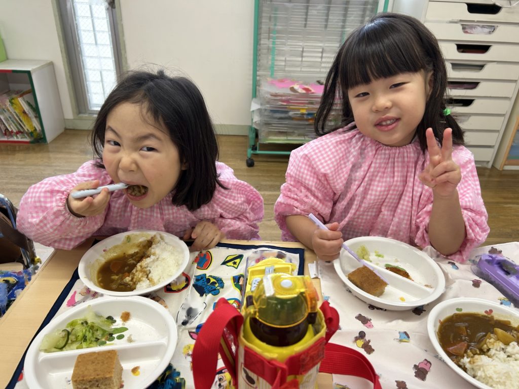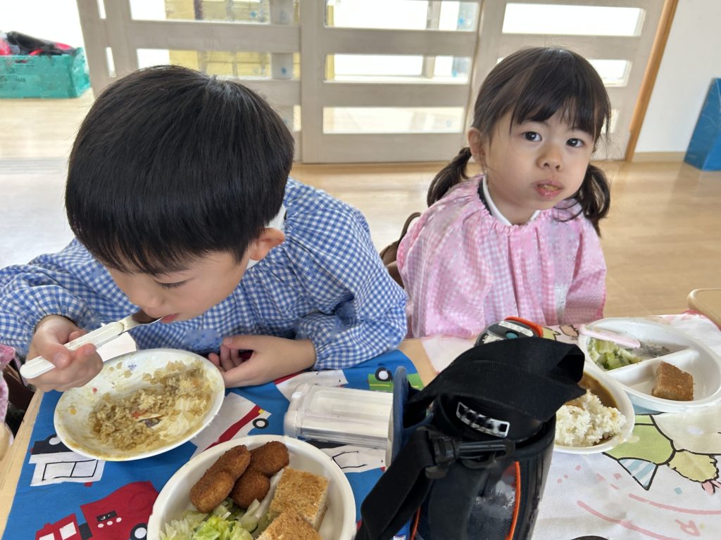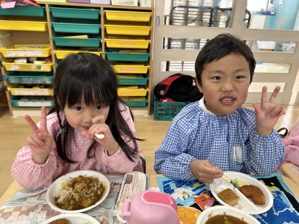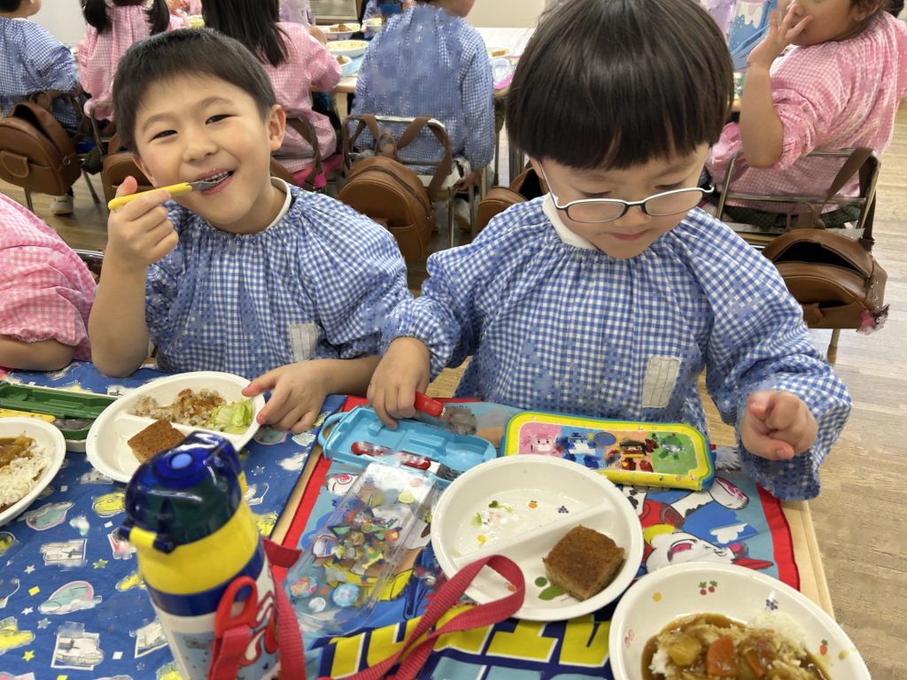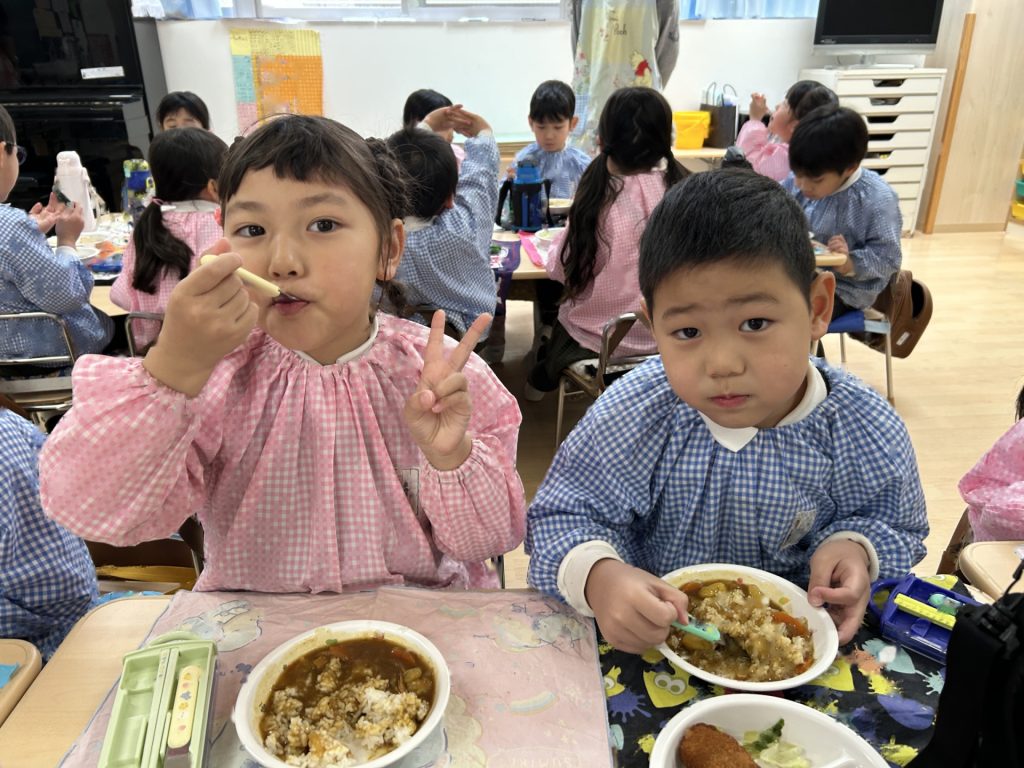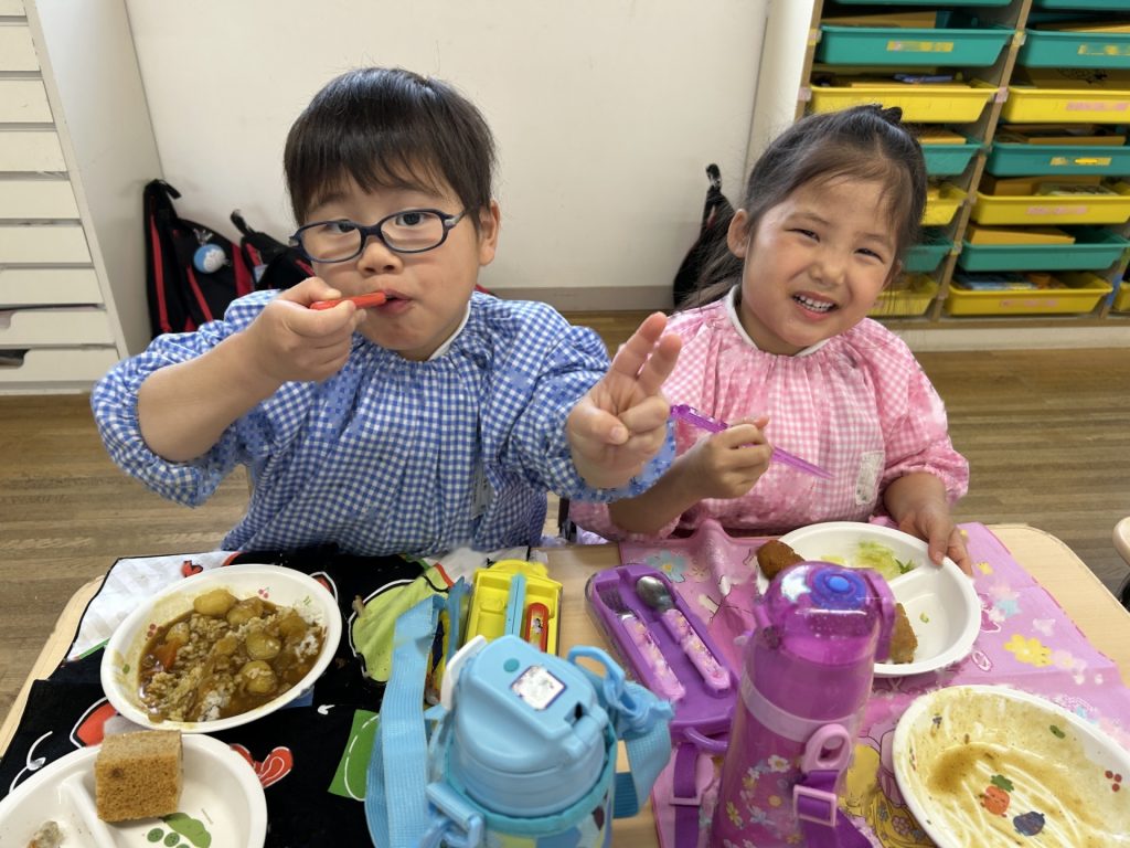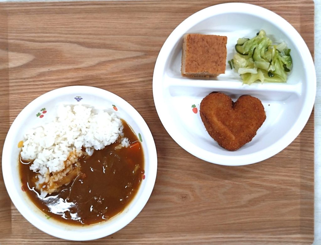 カレーライスは子どもたちに大人気でいつも完食するのに時間が掛かるおともだちもカレーの日はペロッと完食しています。