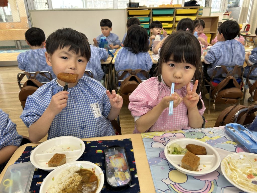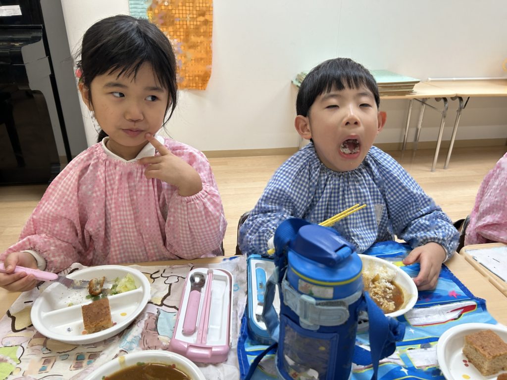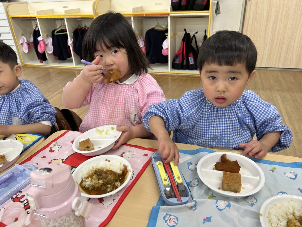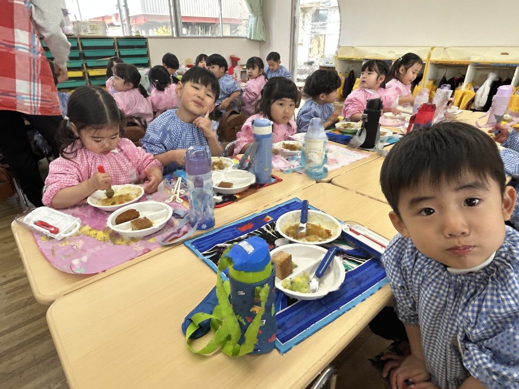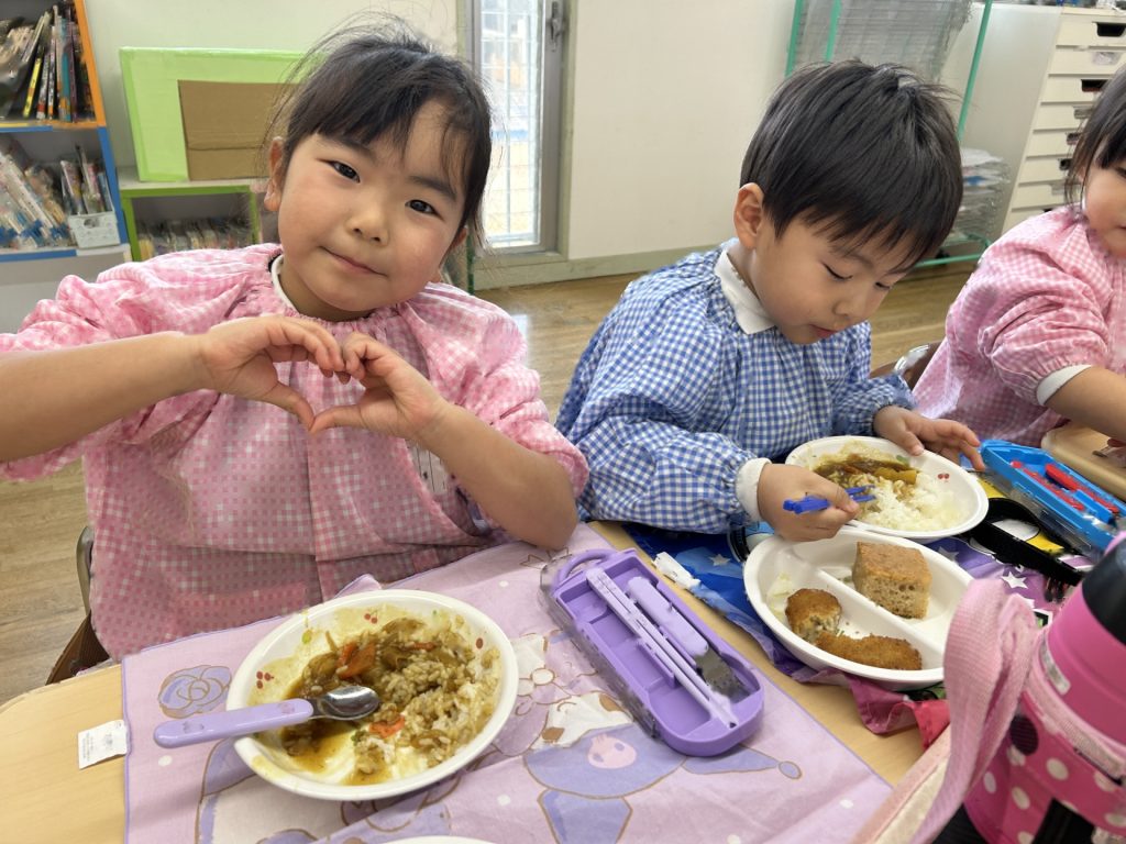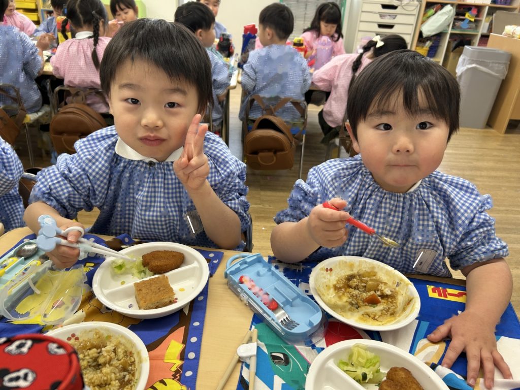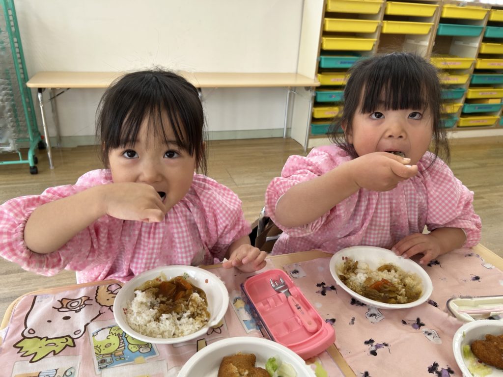 カレーライスは子どもたちに大人気でいつも完食するのに時間が掛かるおともだちもカレーの日はペロッと完食しています。