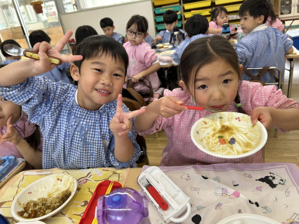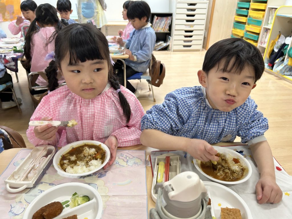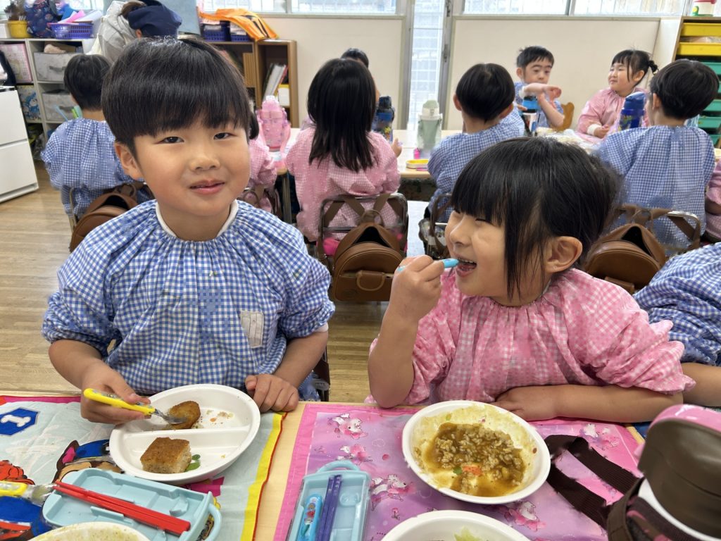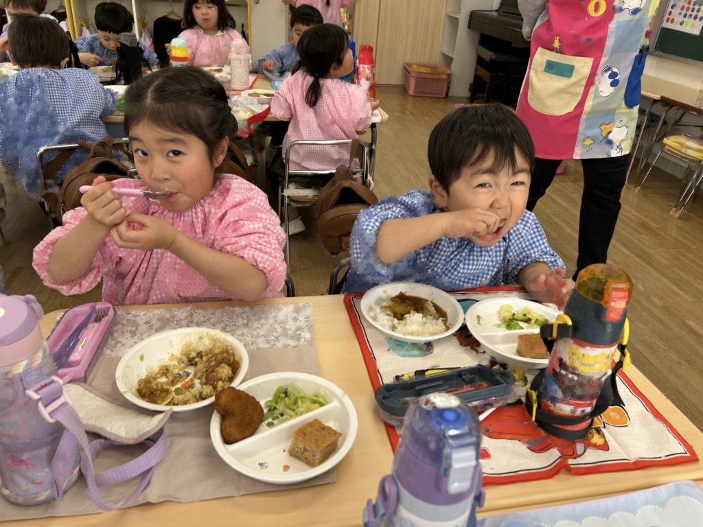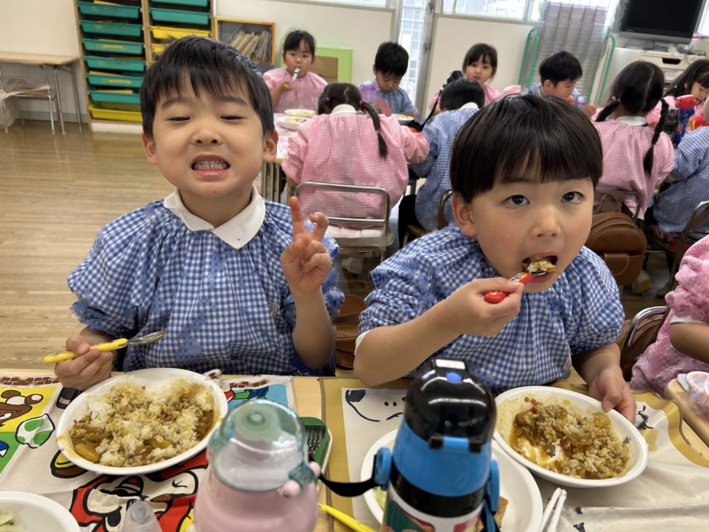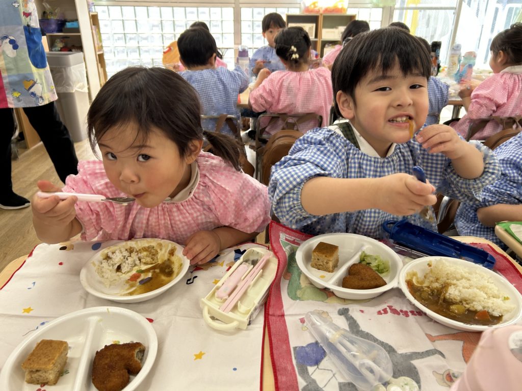 カレーを食べる子どもたちの美味しいおかおです、どうぞ😊