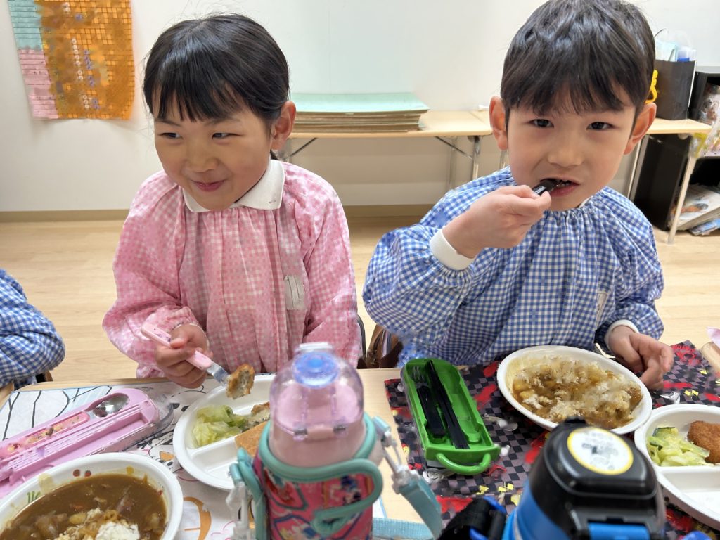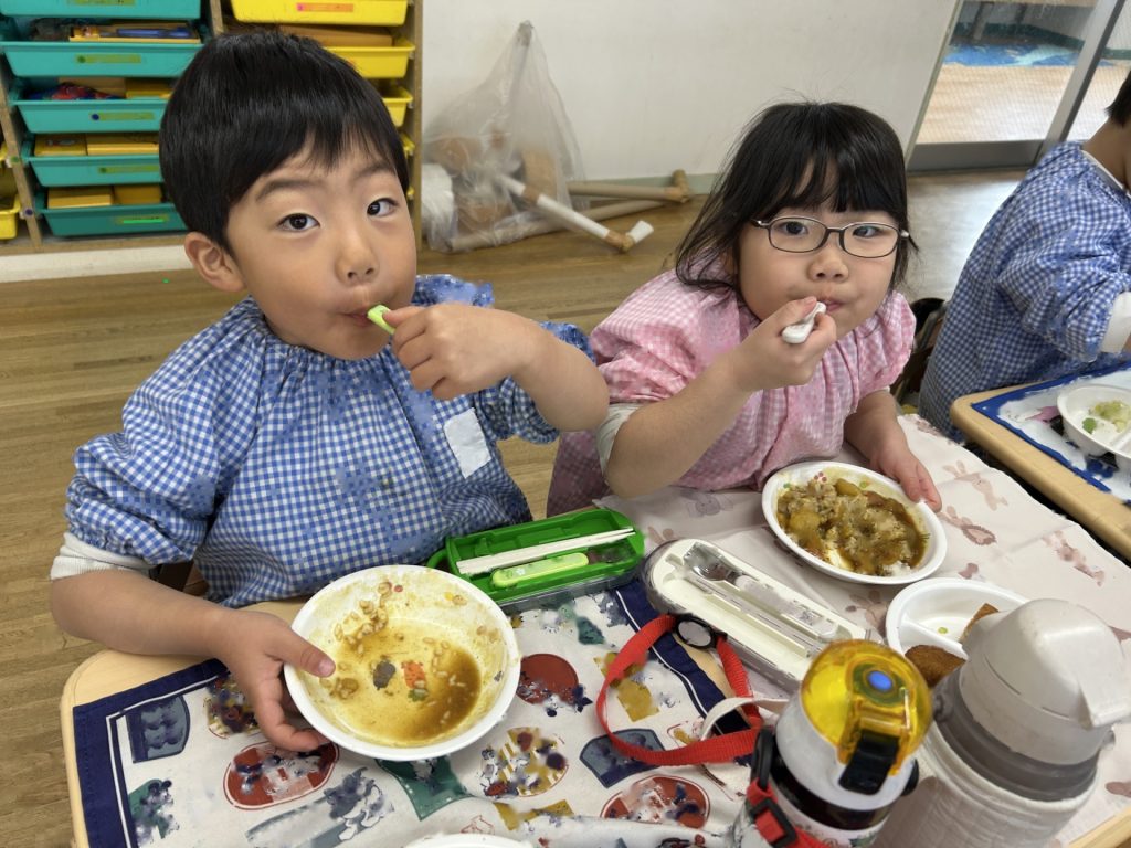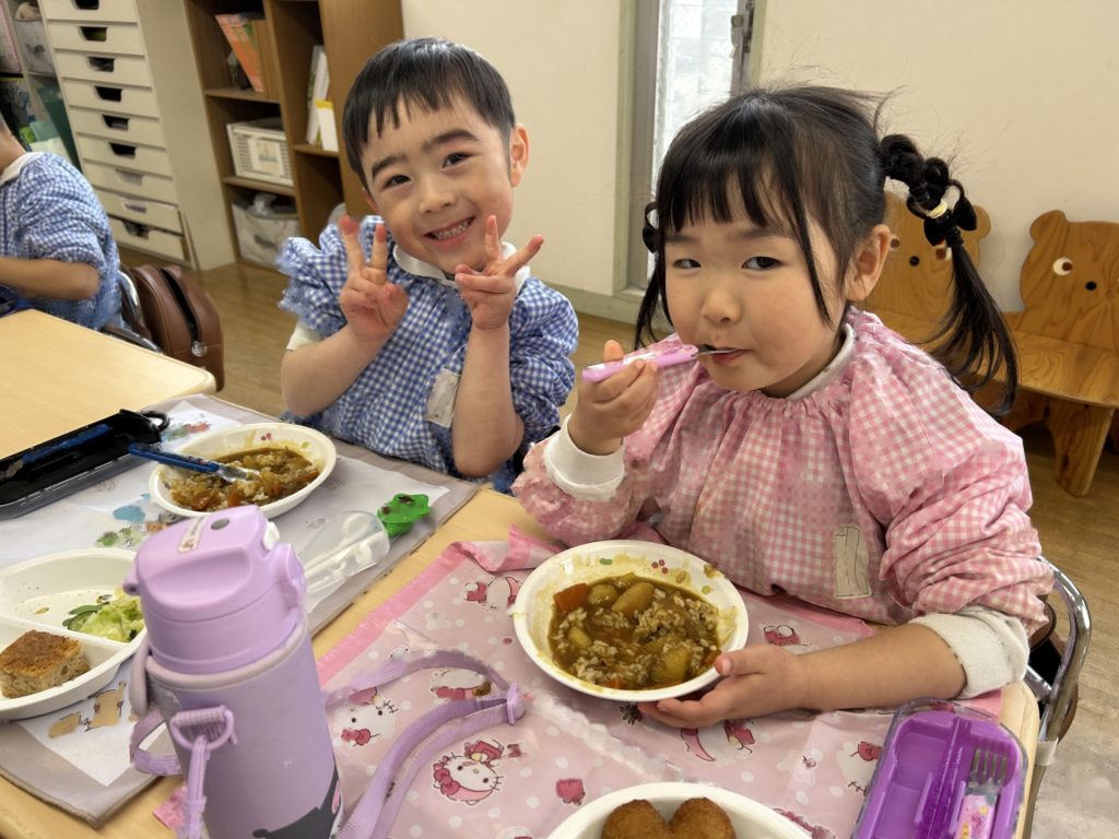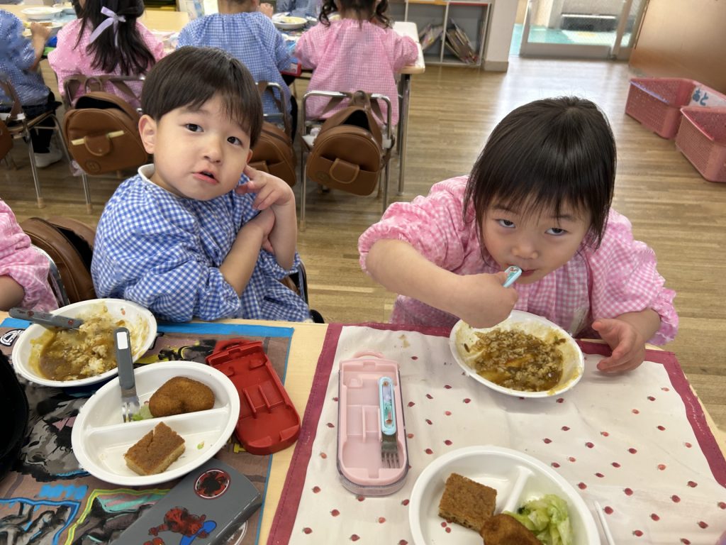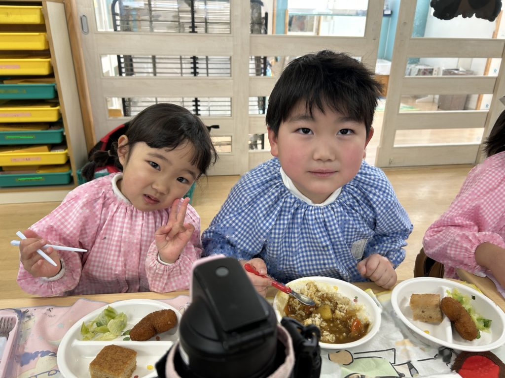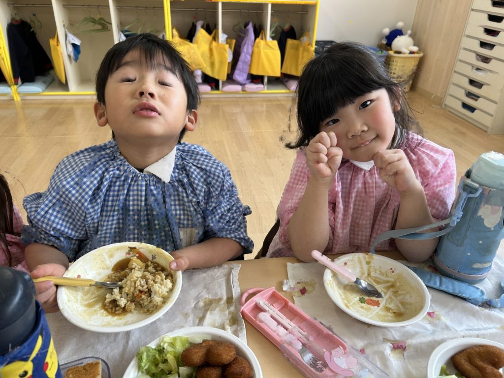 カレーを食べる子どもたちの美味しいおかおです、どうぞ😊