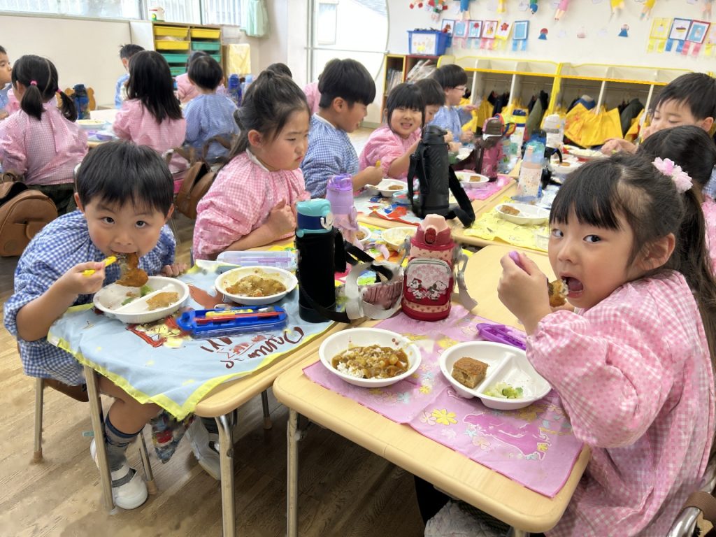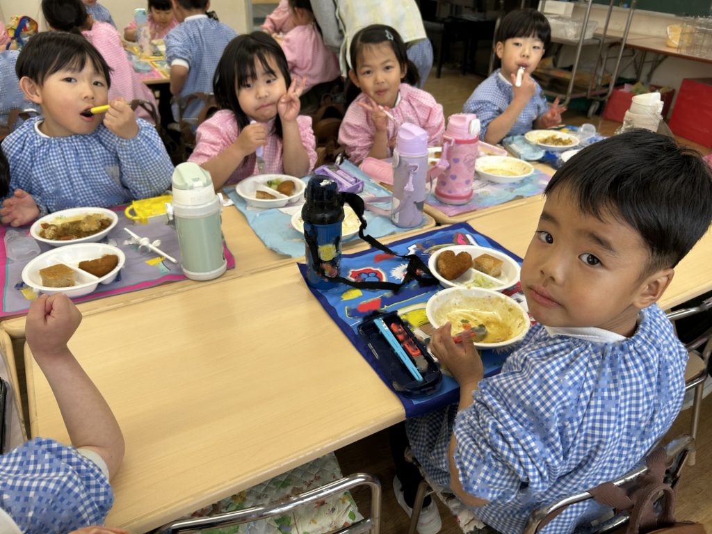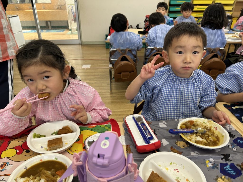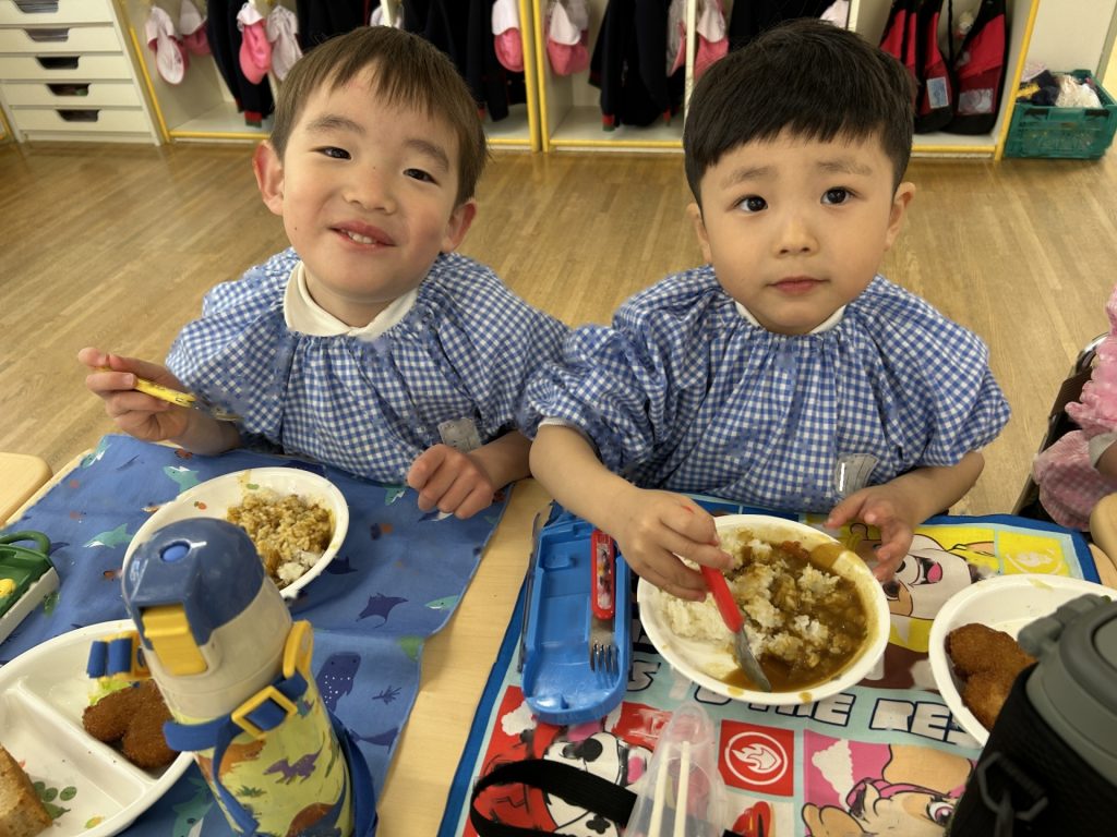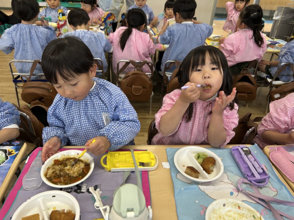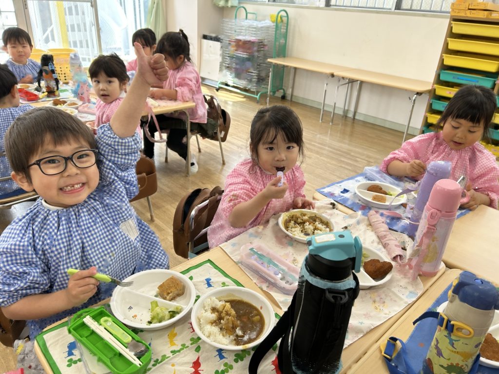 カレーを食べる子どもたちの美味しいおかおです、どうぞ😊