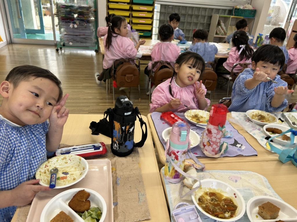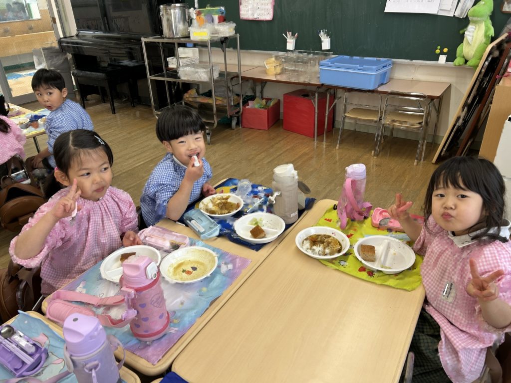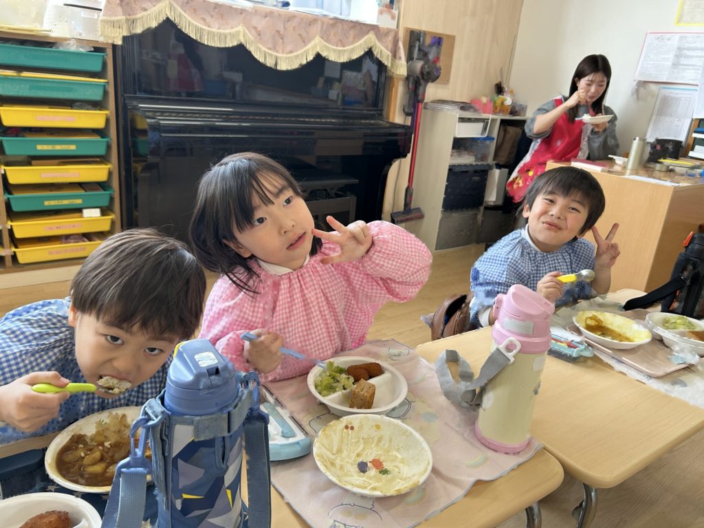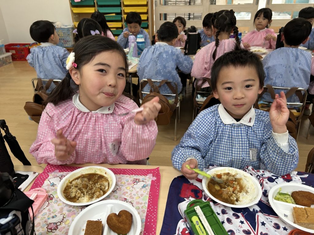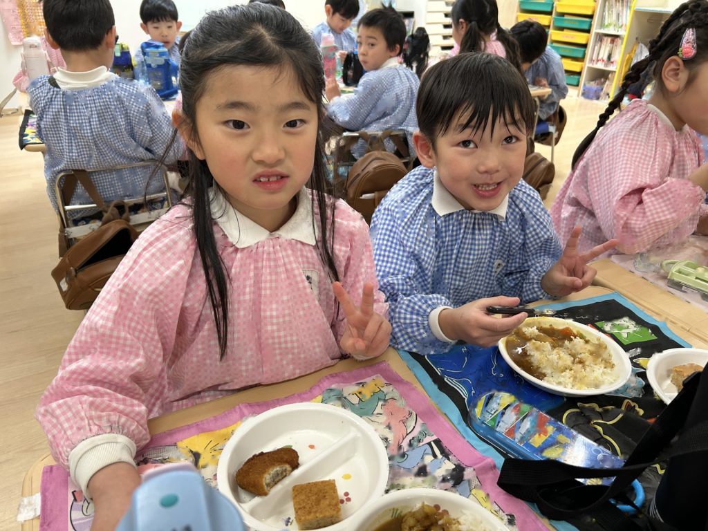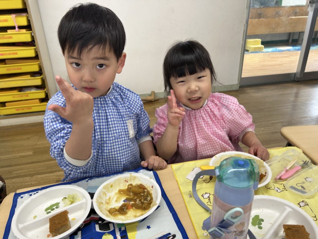 カレーを食べる子どもたちの美味しいおかおです、どうぞ😊