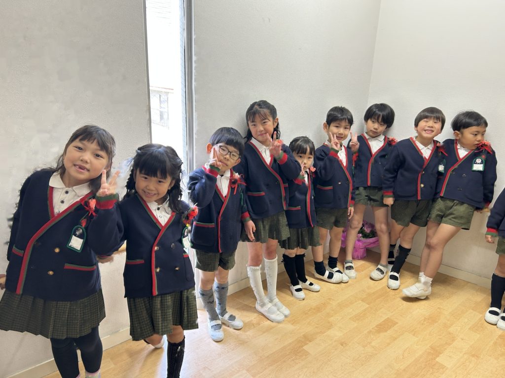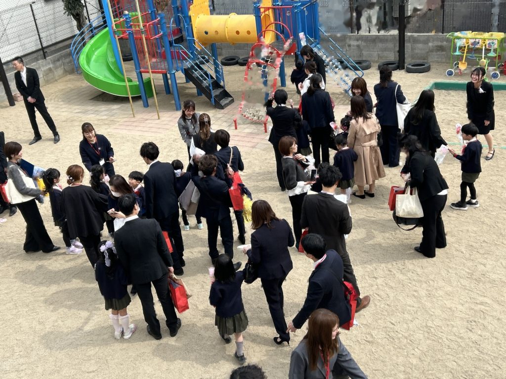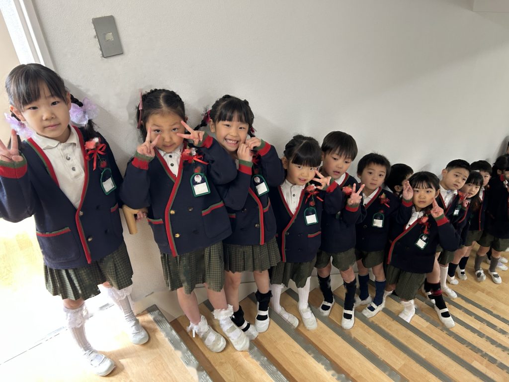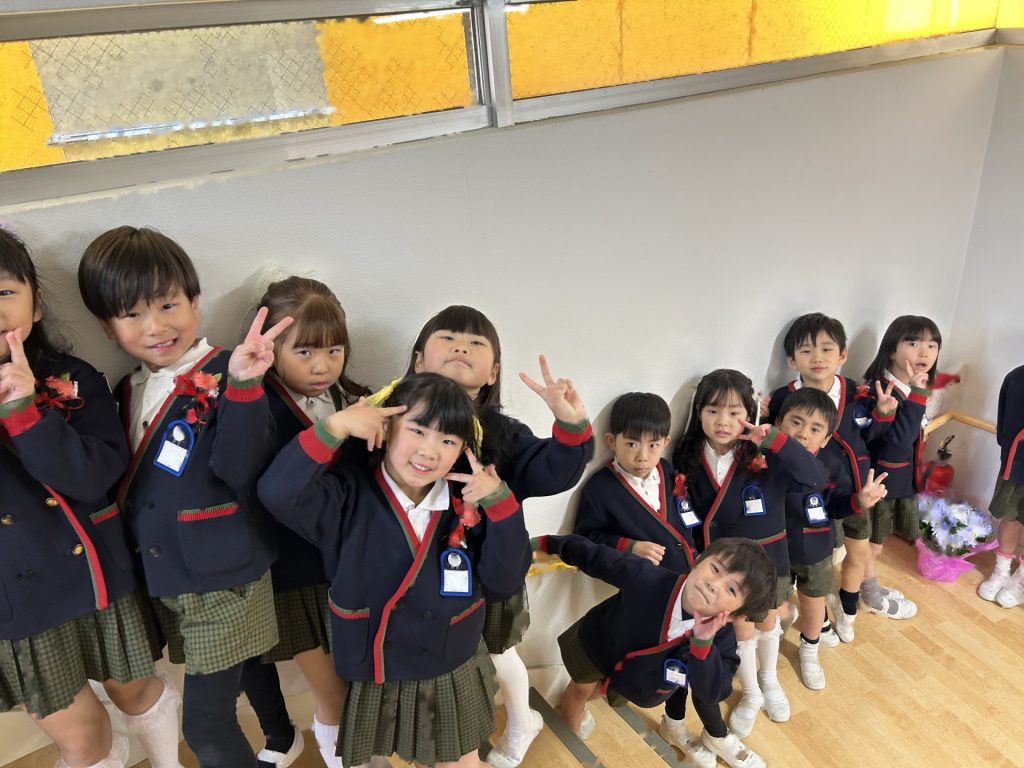 式後、お部屋で記念品を受け取った後は園庭で記念撮影📸