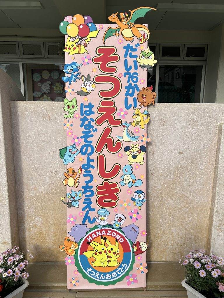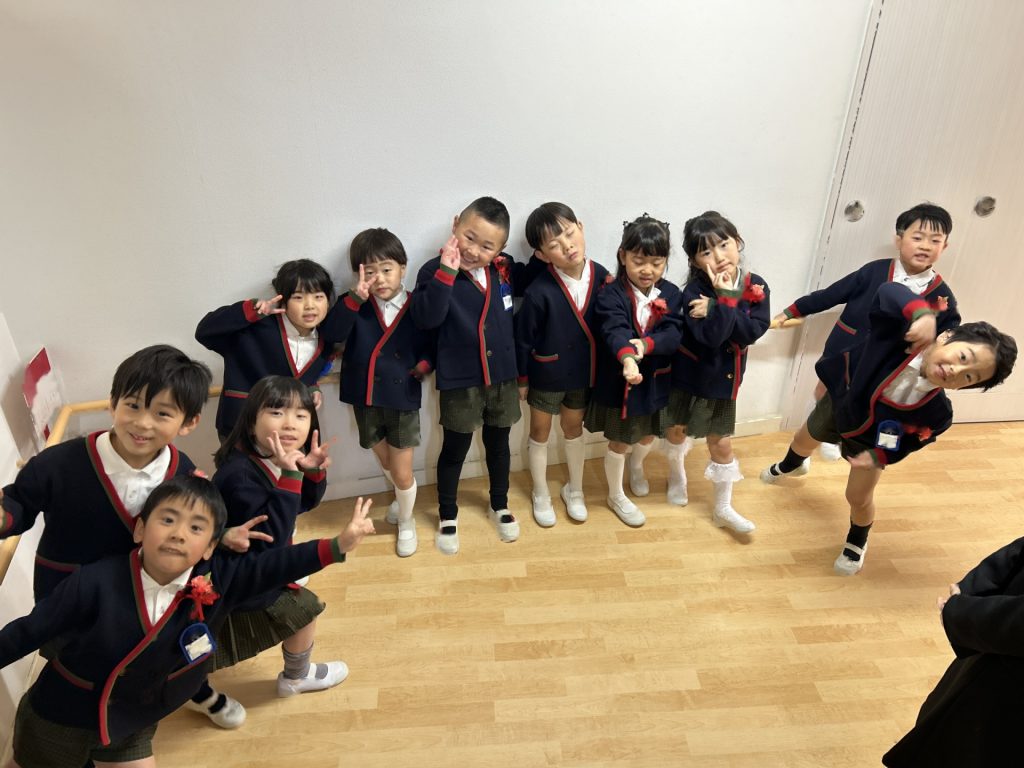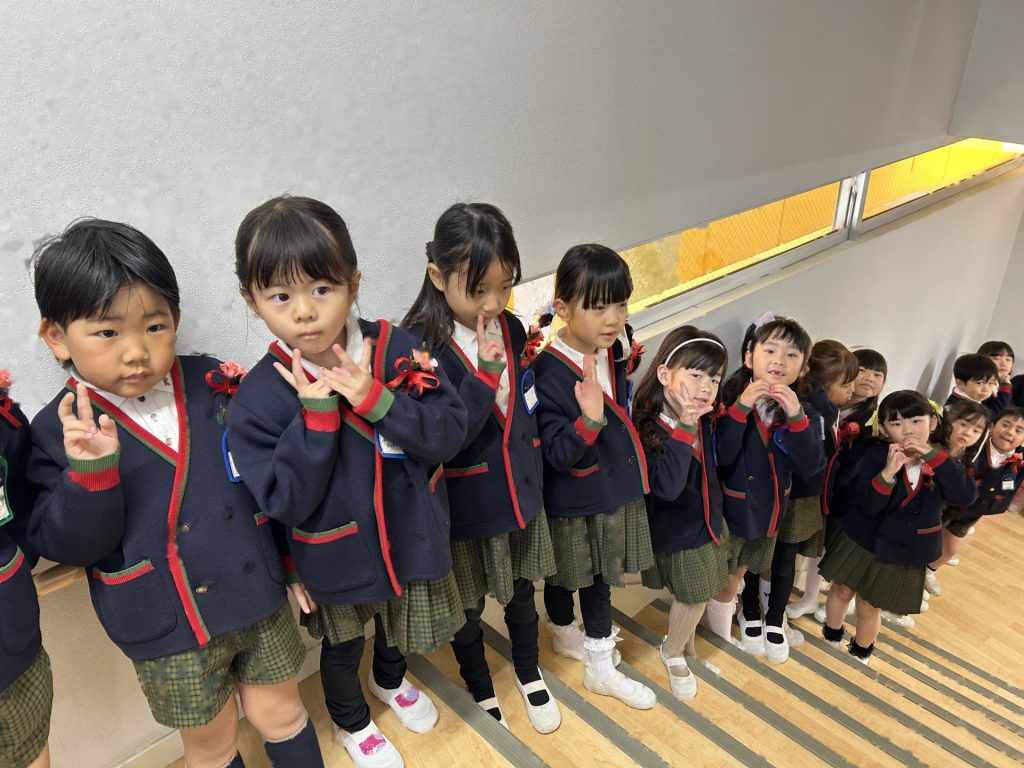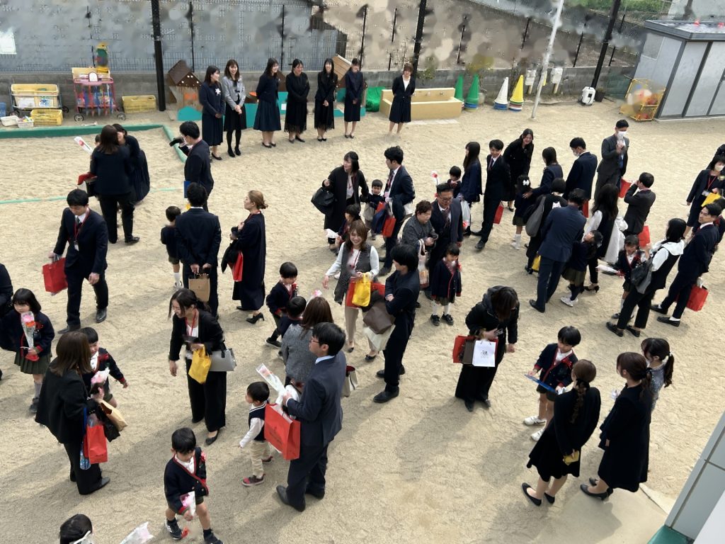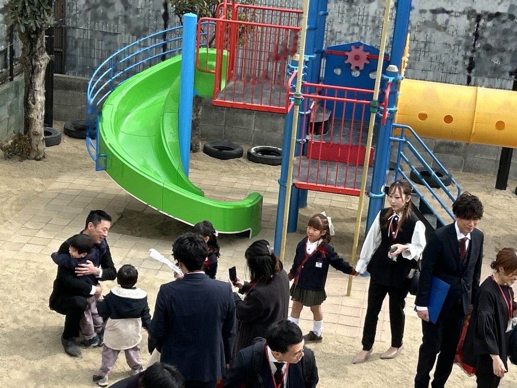 式後、お部屋で記念品を受け取った後は園庭で記念撮影📸